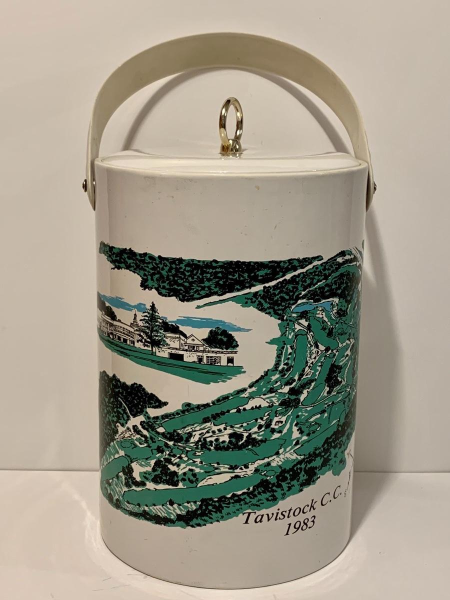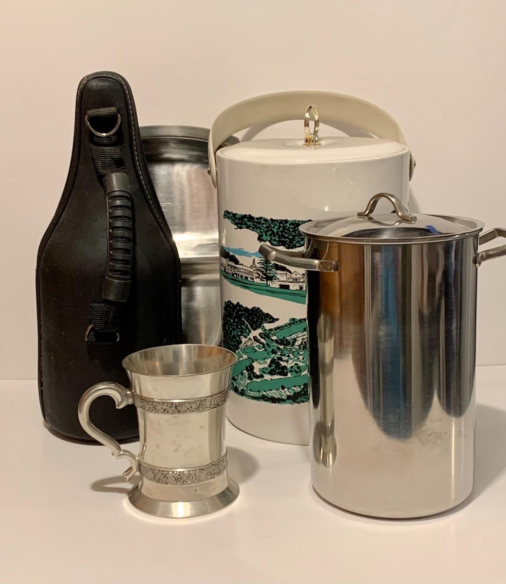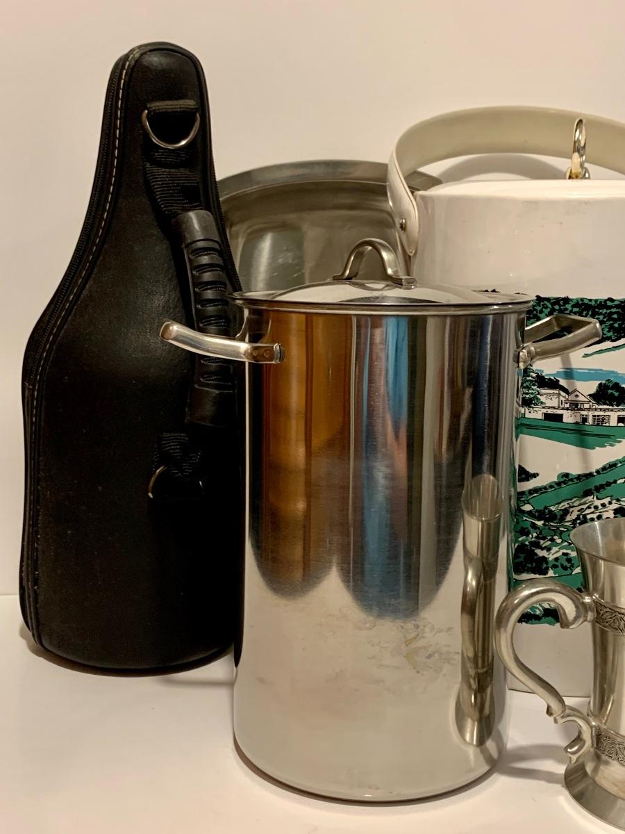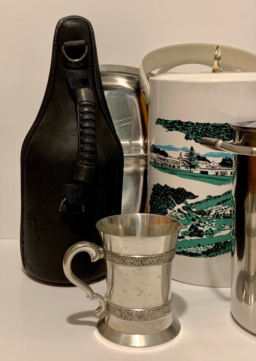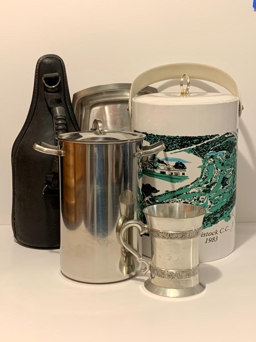 Mixed collection of a William Rohrer Invitational, Travistock C.C. 1983 signed Golf Pro Am Ice Bucket, Leather "CaddyO" Wine Carrier (everything you need for an outing with your favorite wine)., Pewter striped tankard, Made in Ireland, stainless steel serving tray and an Asparagus cooker