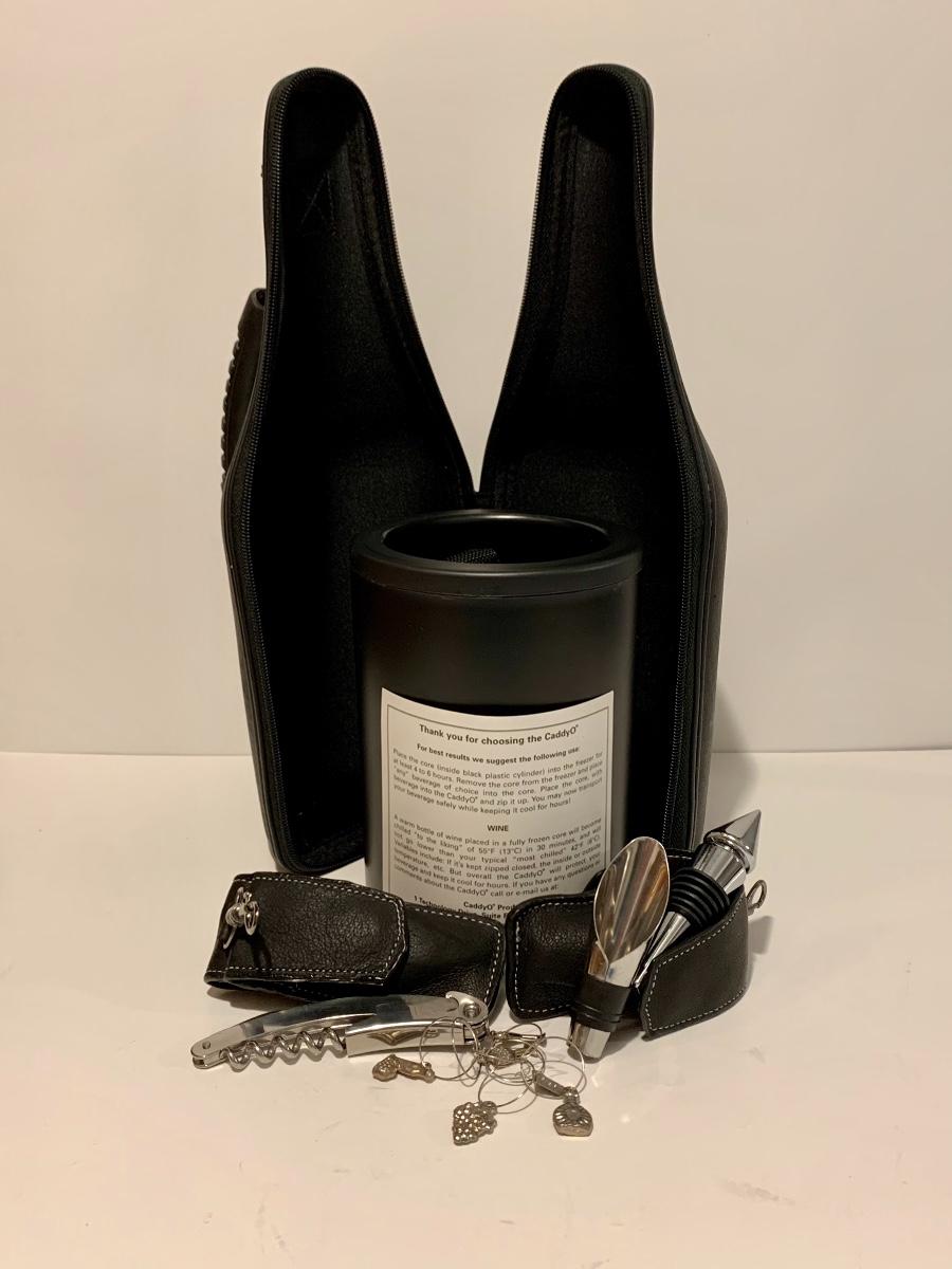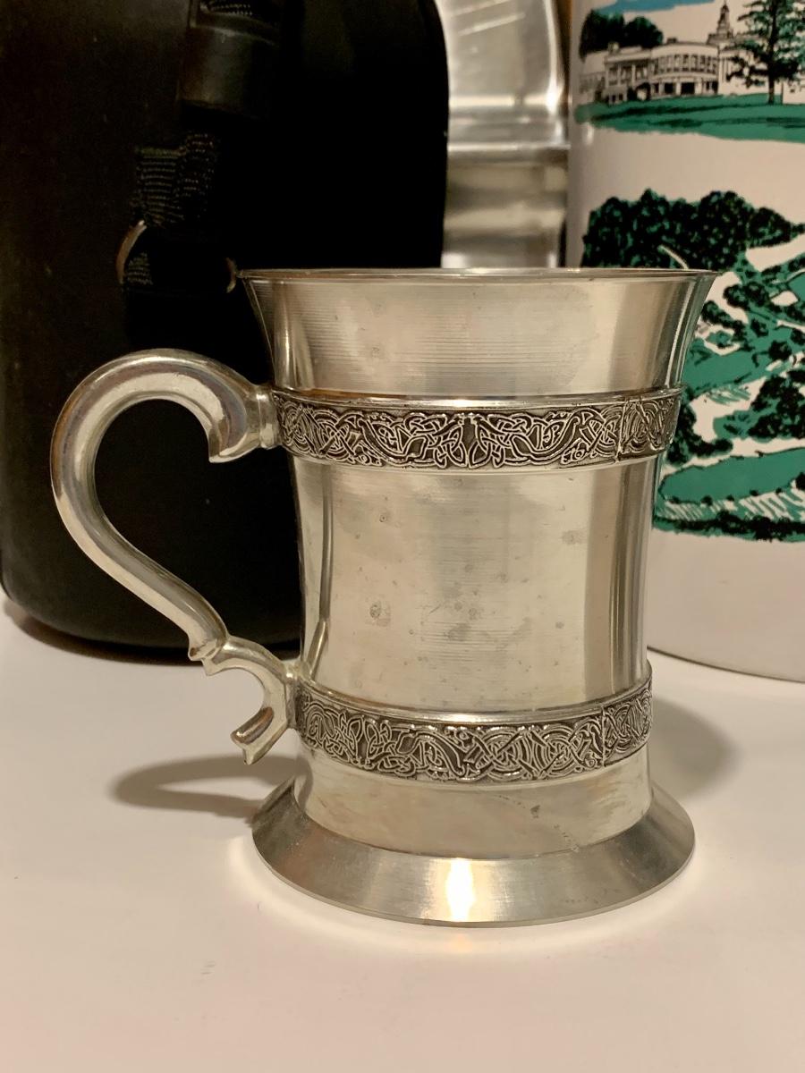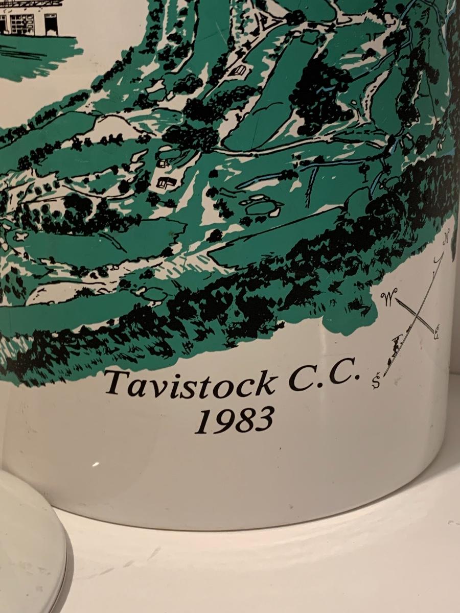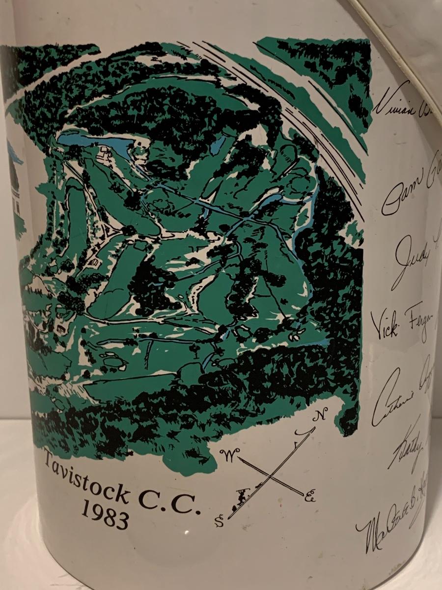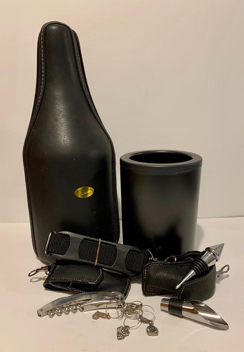 Mixed collection of a William Rohrer Invitational, Travistock C.C. 1983 signed Golf Pro Am Ice Bucket, Leather "CaddyO" Wine Carrier (everything you need for an outing with your favorite wine)., Pewter striped tankard, Made in Ireland, stainless steel serving tray and an Asparagus cooker