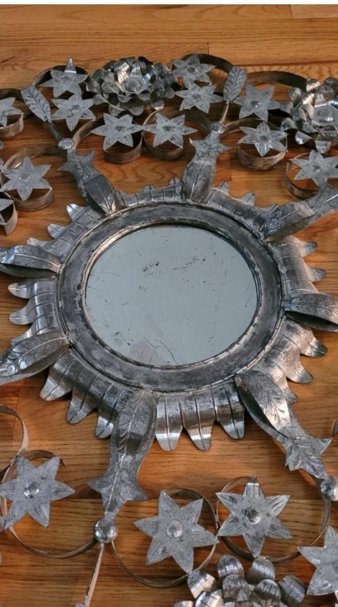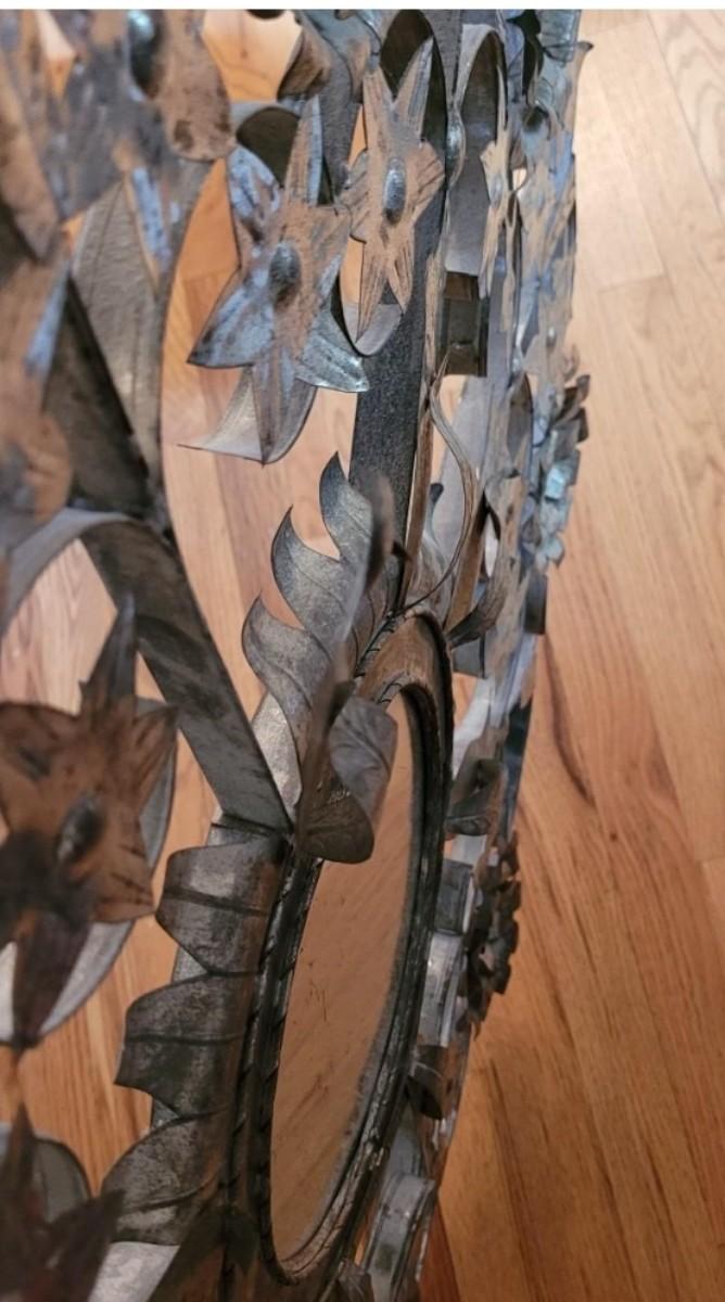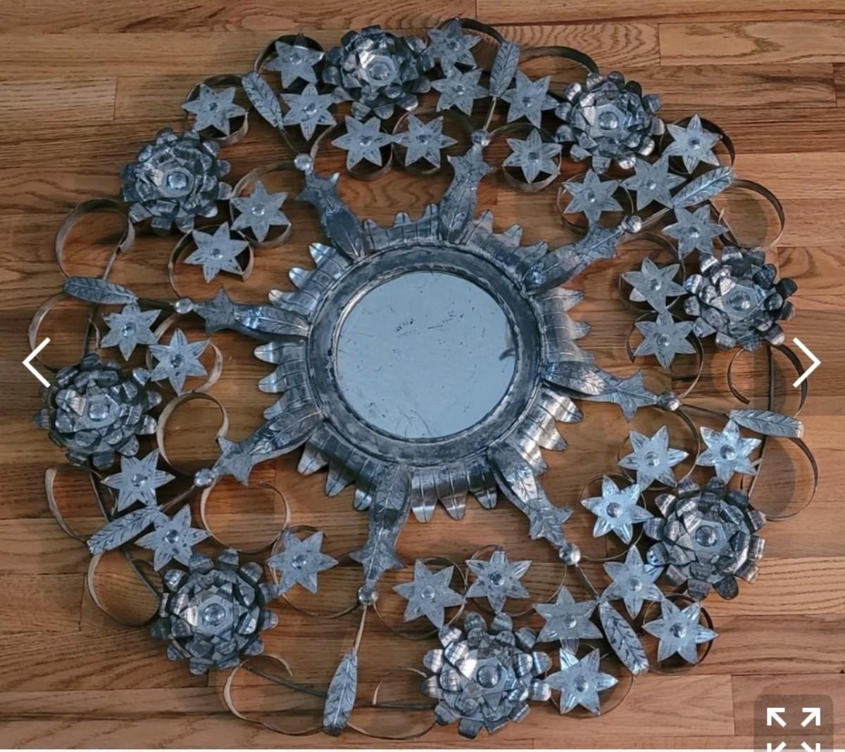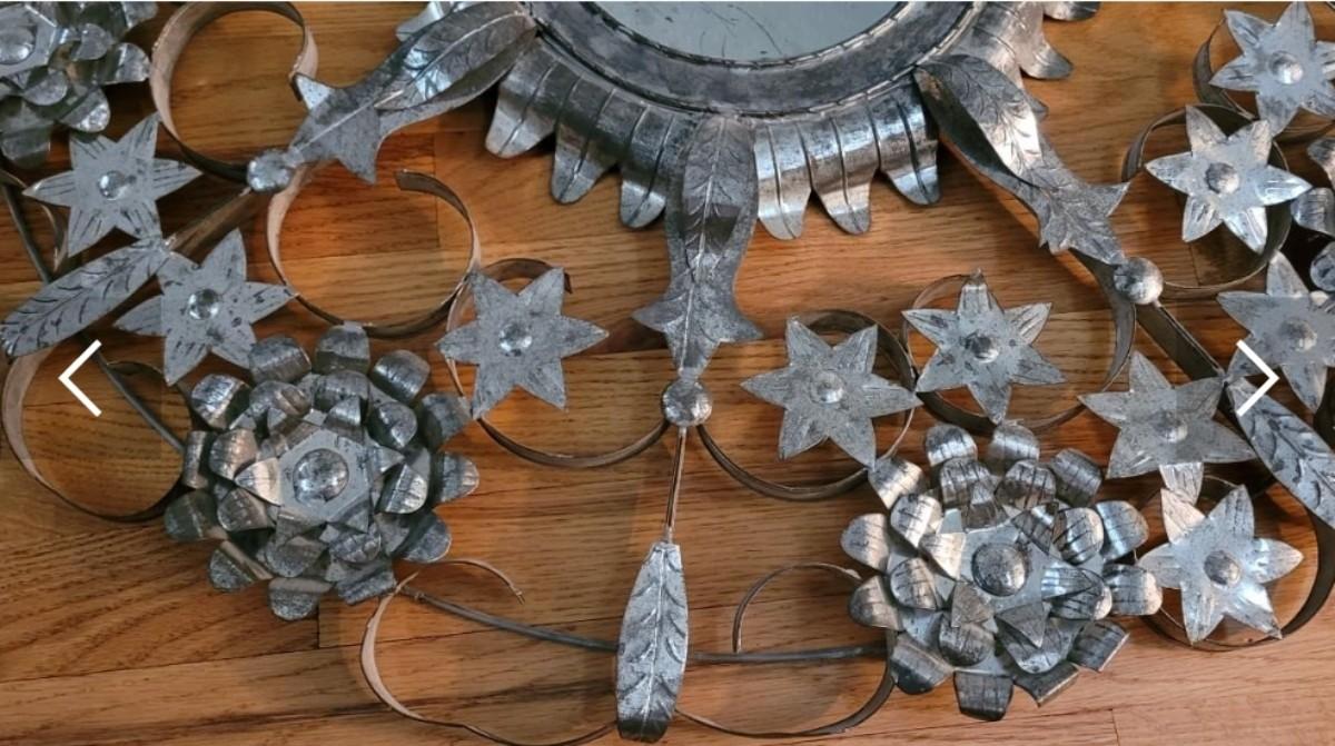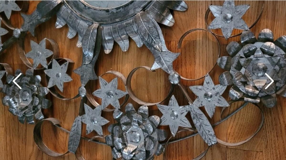 Vintage 1950's Mexican Tin Folk Art with Floral Design. Minor Repair Needed- Has a wire in the back that needs to be reattached and a piece of the floral motif that needs to be reattached- both shown in photos.