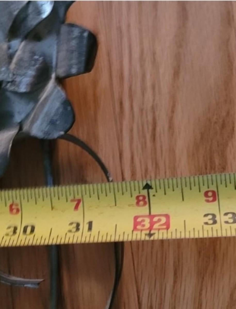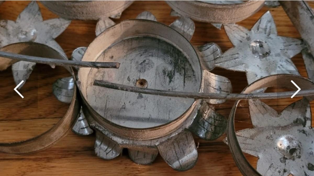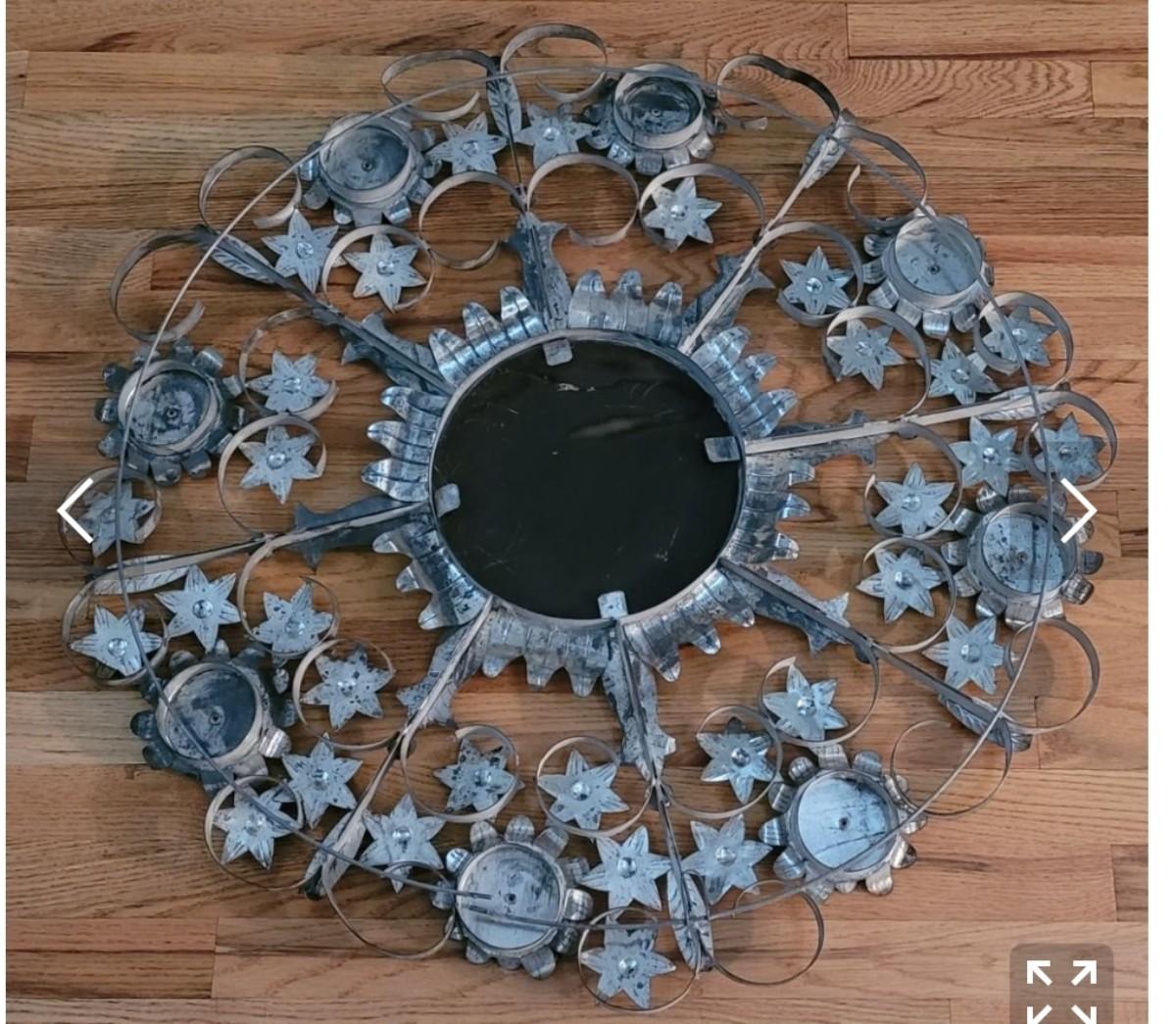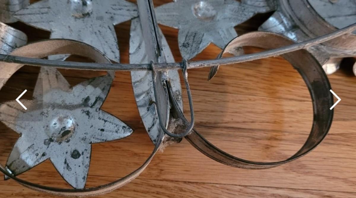Vintage 1950's Mexican Tin Folk Art with Floral Design. Minor Repair Needed- Has a wire in the back that needs to be reattached and a piece of the floral motif that needs to be reattached- both shown in photos.