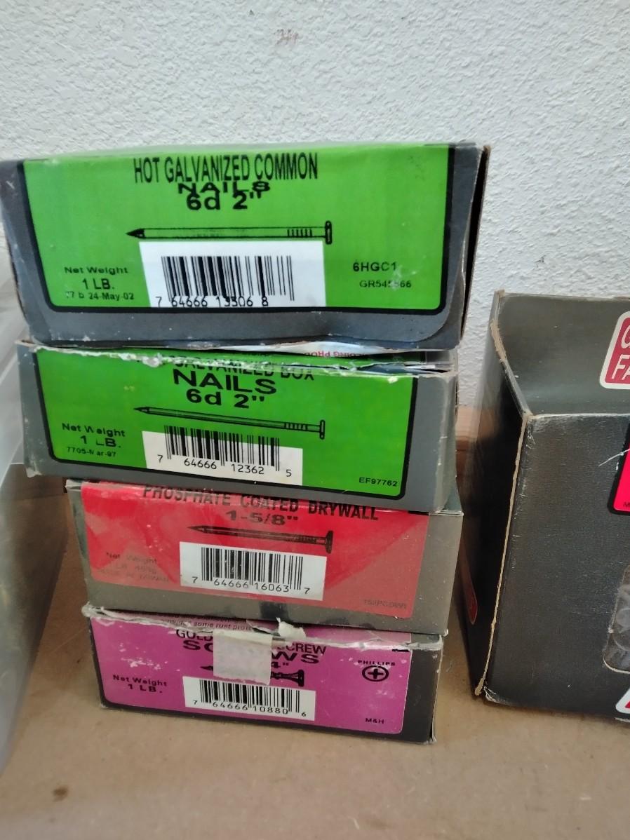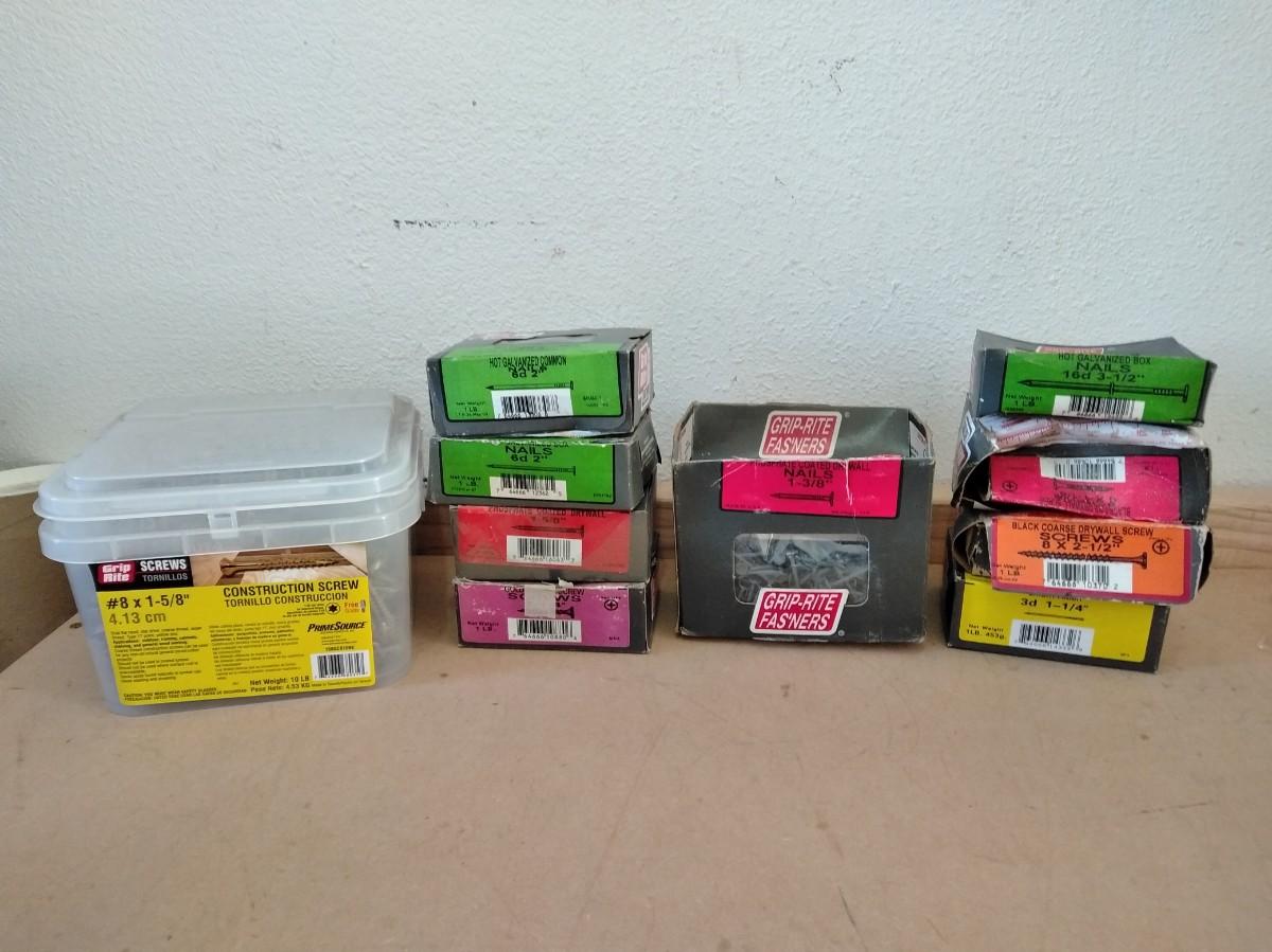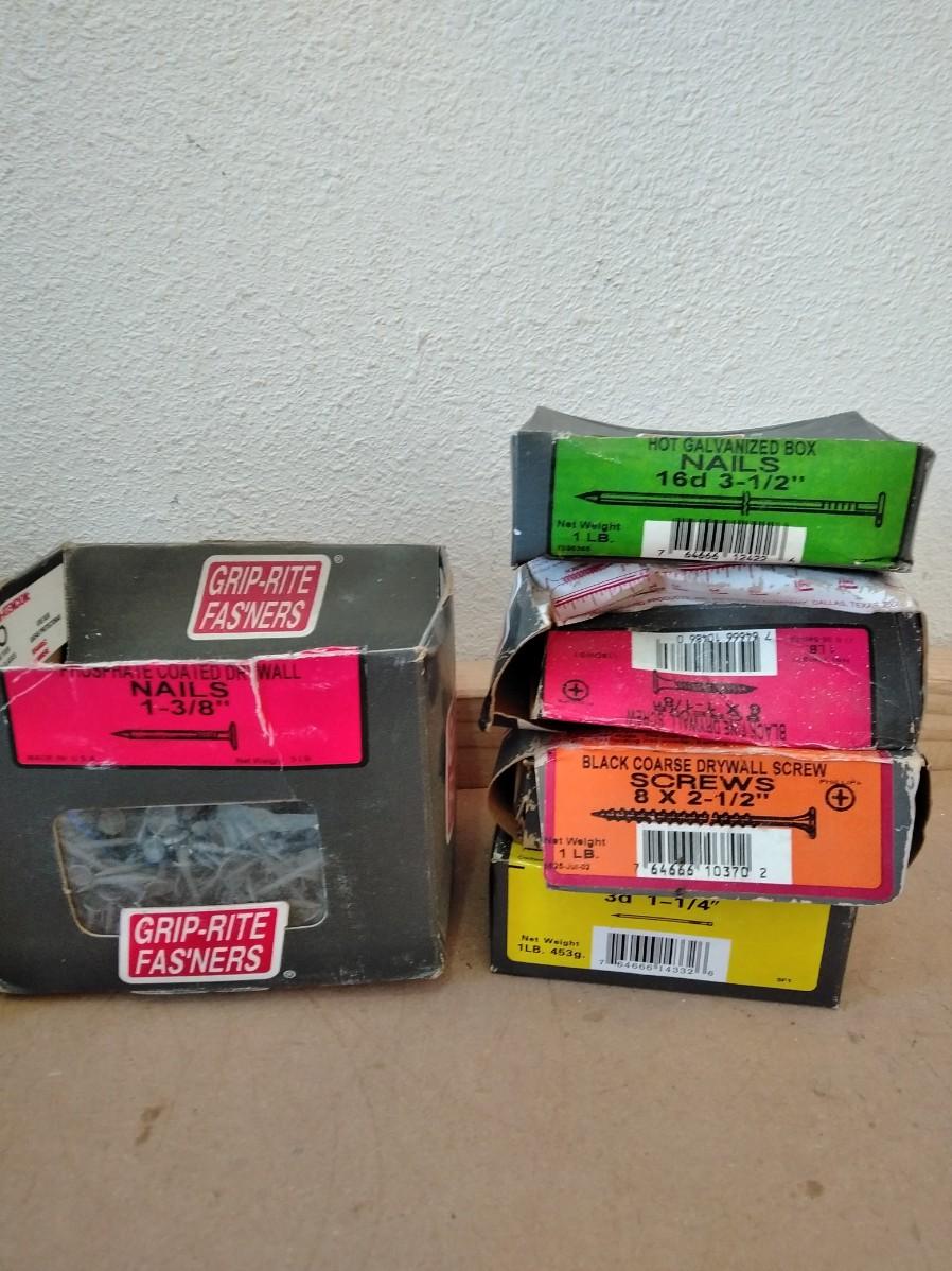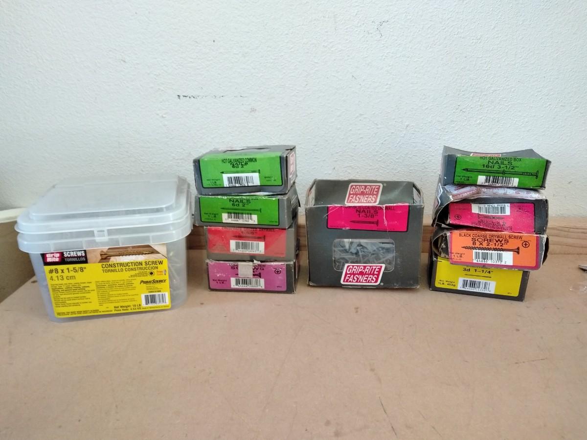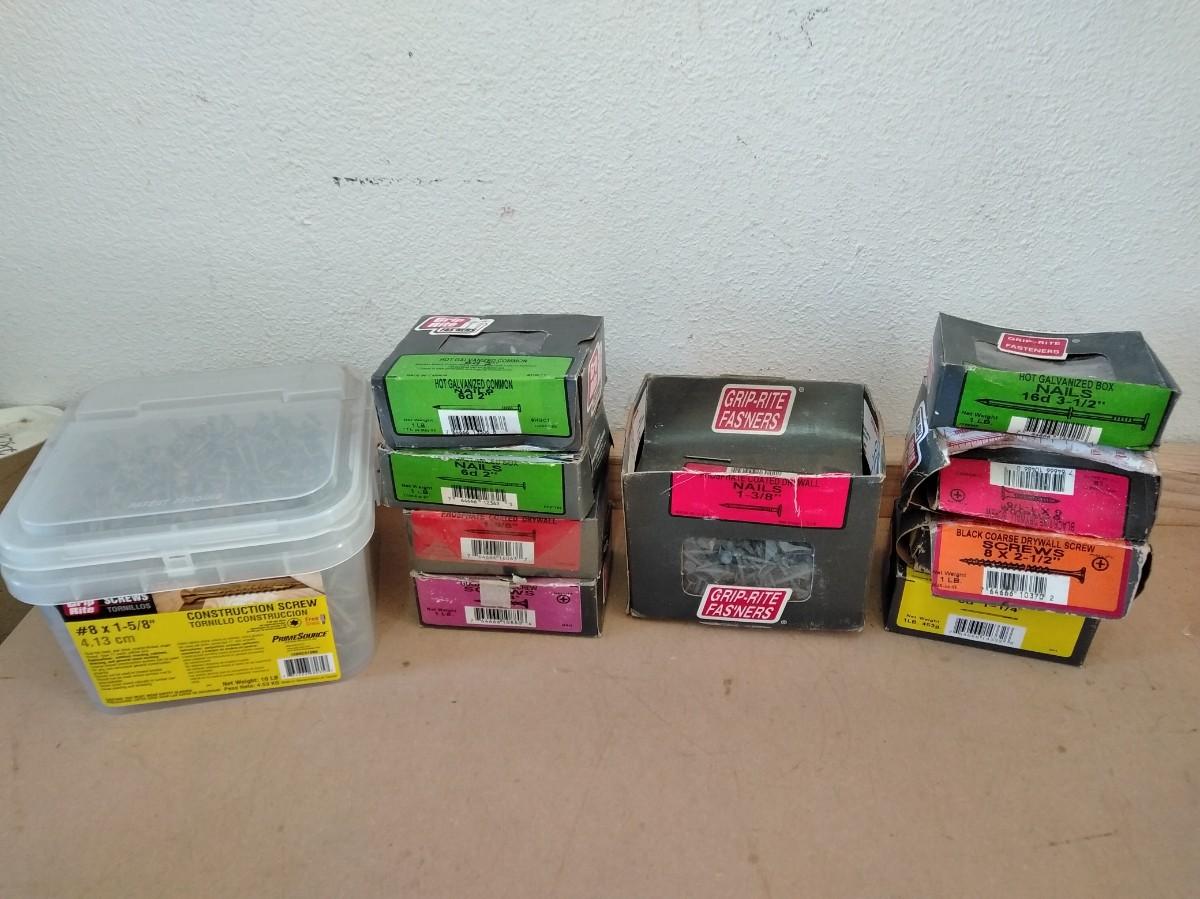 BIG TUB OF GRIP RITE SCREWS, AND 9 BOXES OF ASSORTED SCREWS AND NAILS.