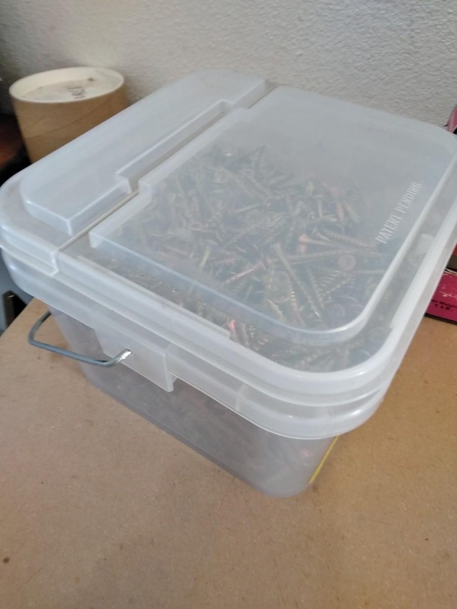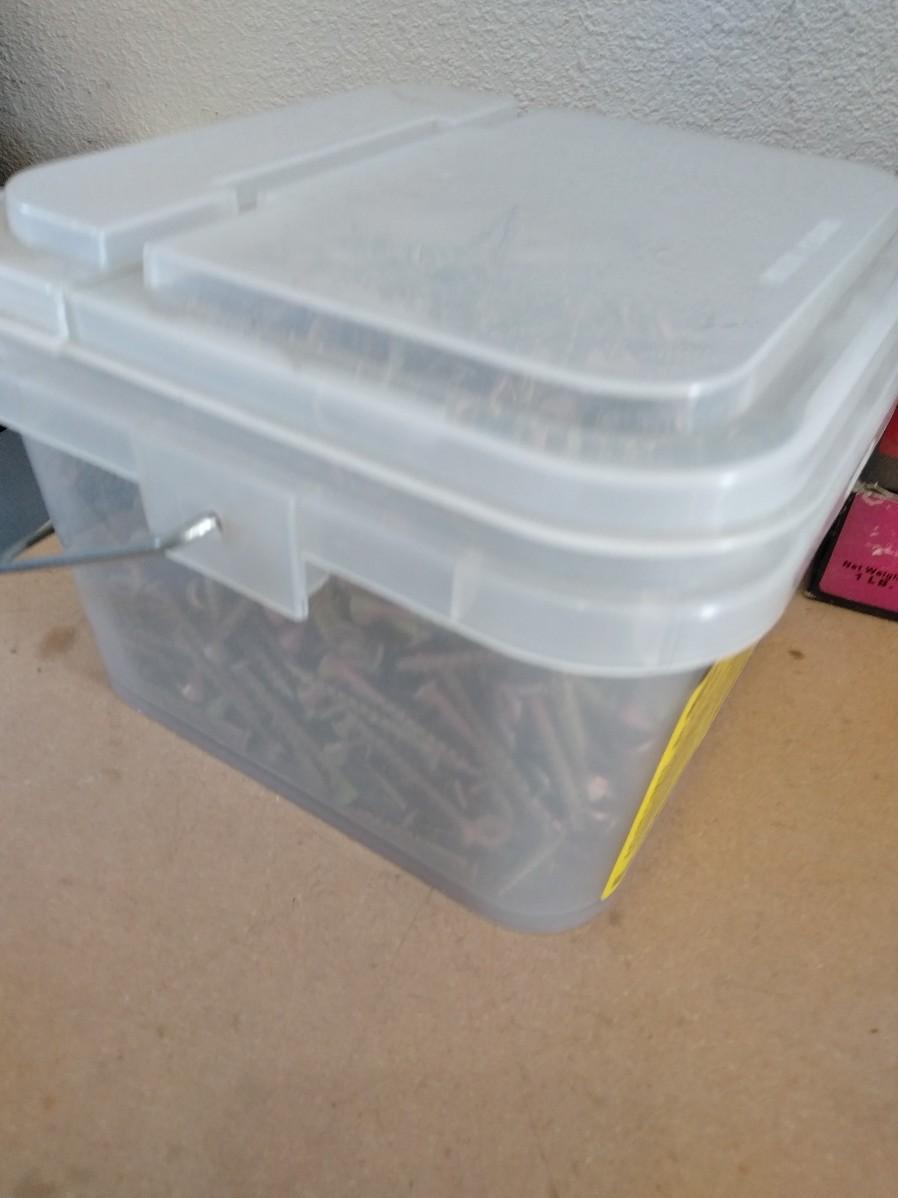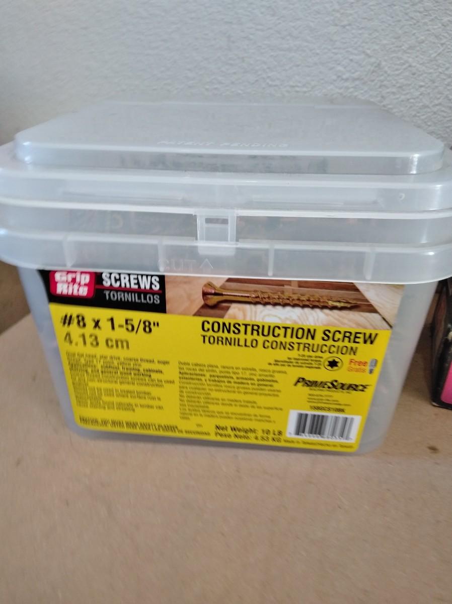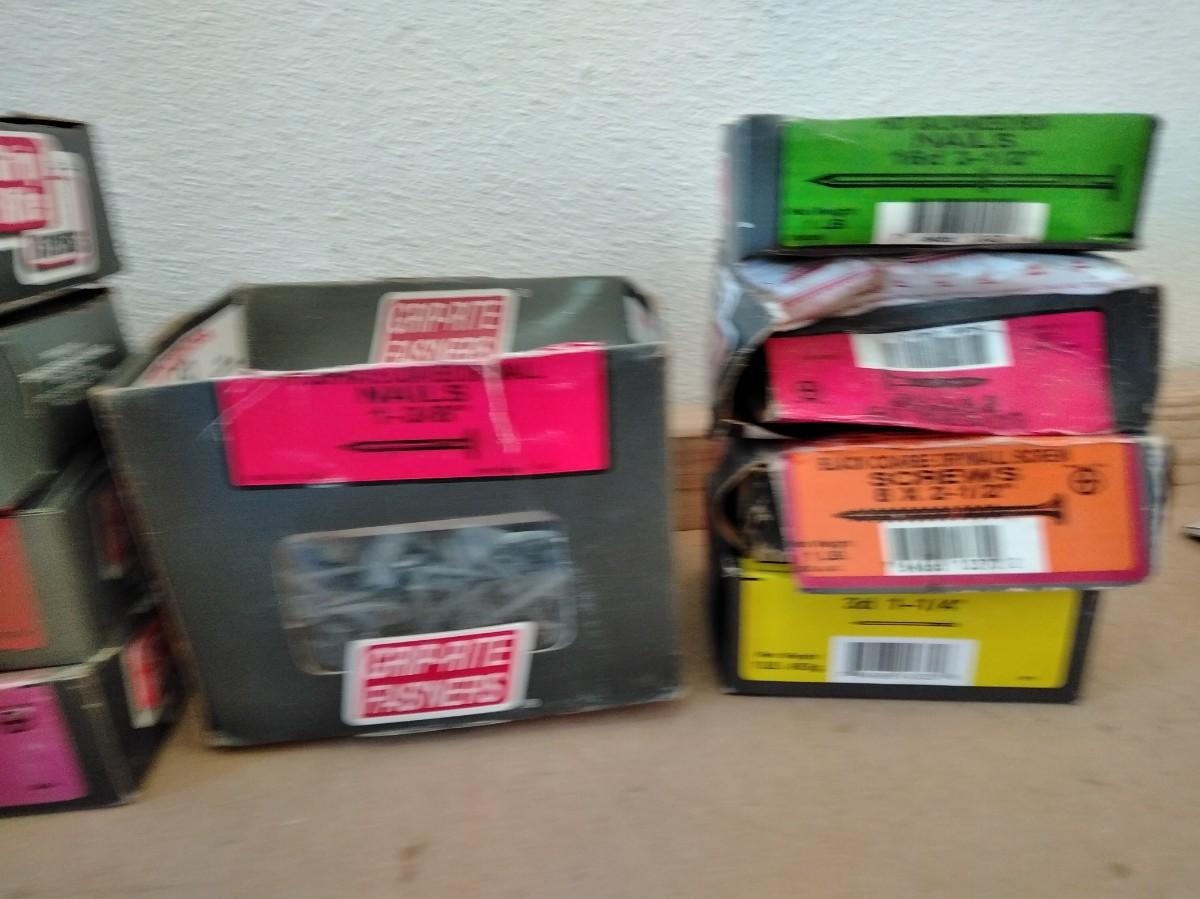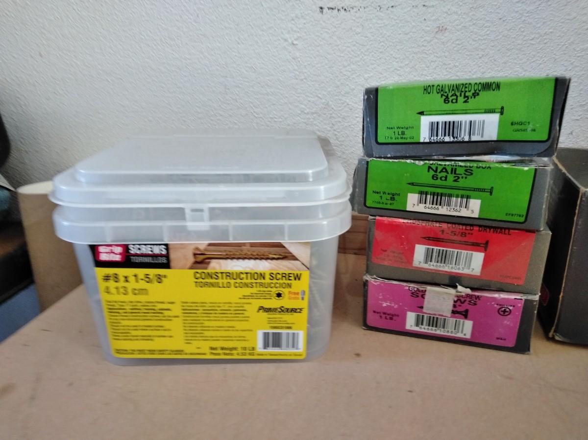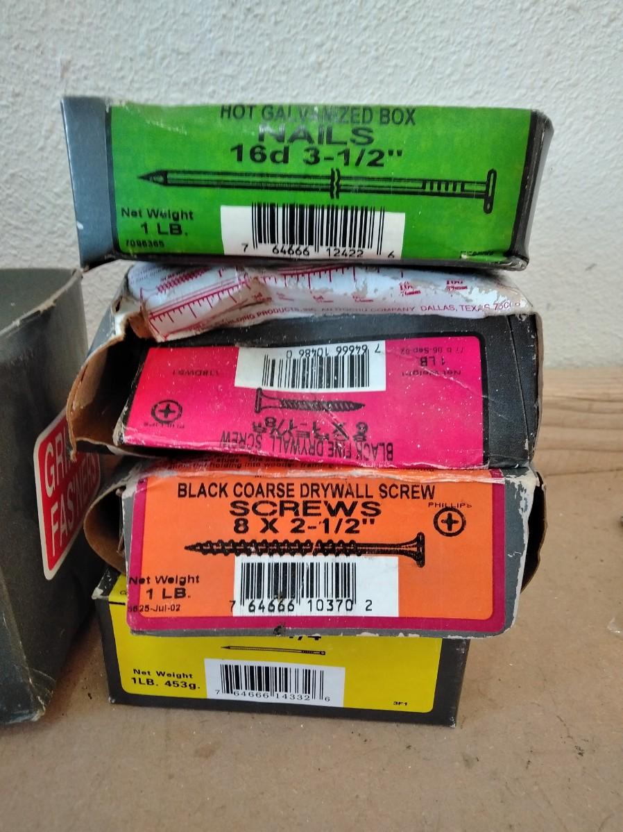 BIG TUB OF GRIP RITE SCREWS, AND 9 BOXES OF ASSORTED SCREWS AND NAILS.
