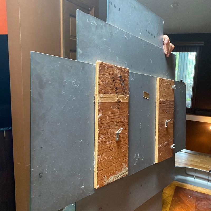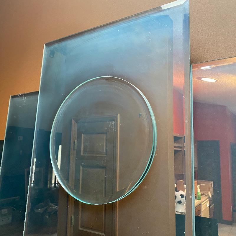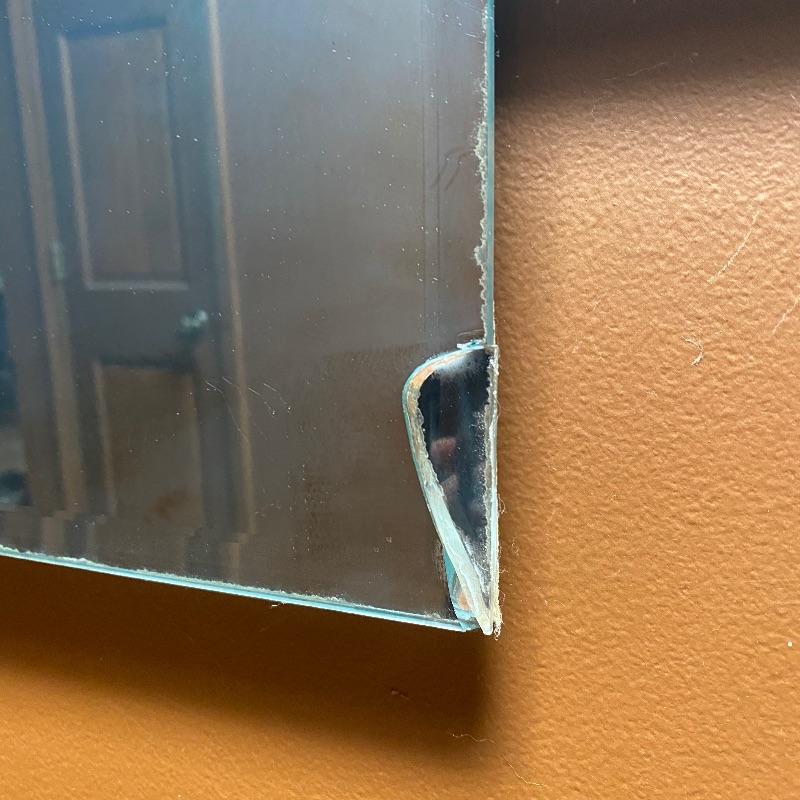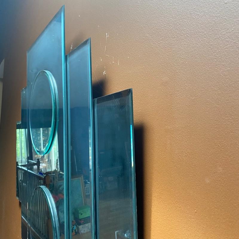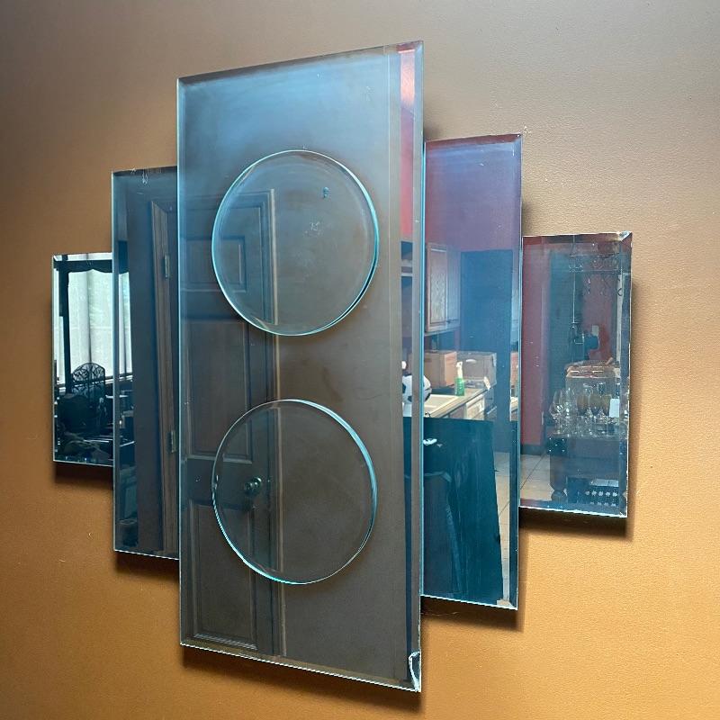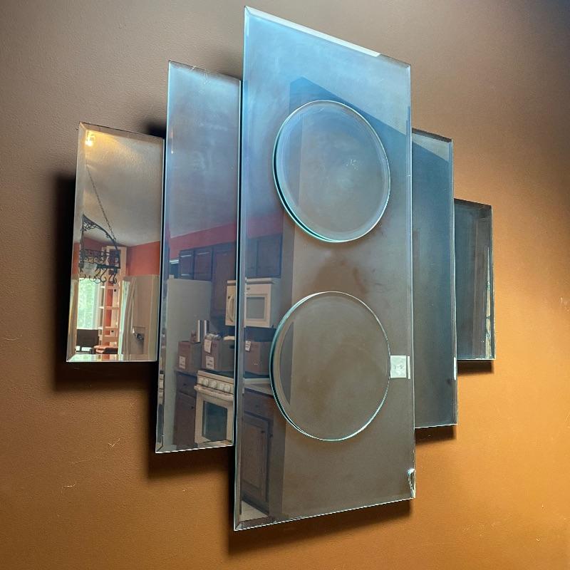 Put this abstract designed mirror in your entryway to make a statement! Sticker on back says it’s from the Sculptors Guild in Missouri. It has a small chip on bottom right but otherwise just needs a little windex. Measures 42” x 40”. No shipping.