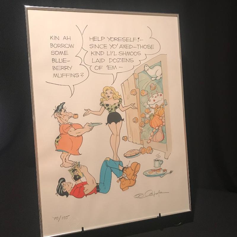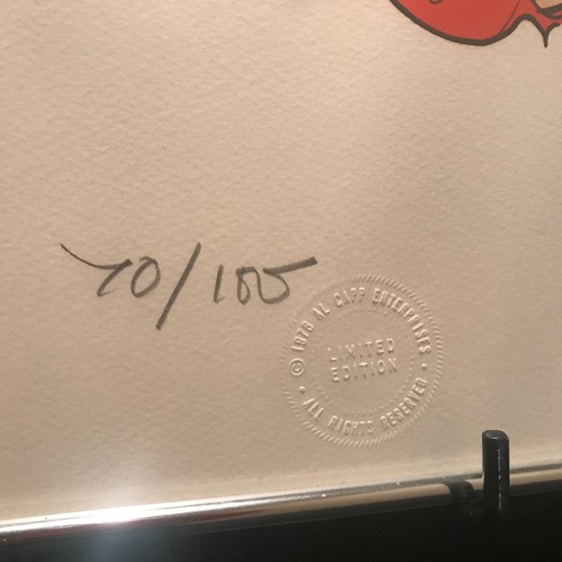 Framed and numbered 70/100 Al Capp Signed Art. Piece has a raised seal that says “1978 Al Capp Enterprises, Limited Edition" Frame measures 12.5” x 29.5”. Shipping available. Please call UPS at 828-252-6930 for a shipping quote prior to bidding.