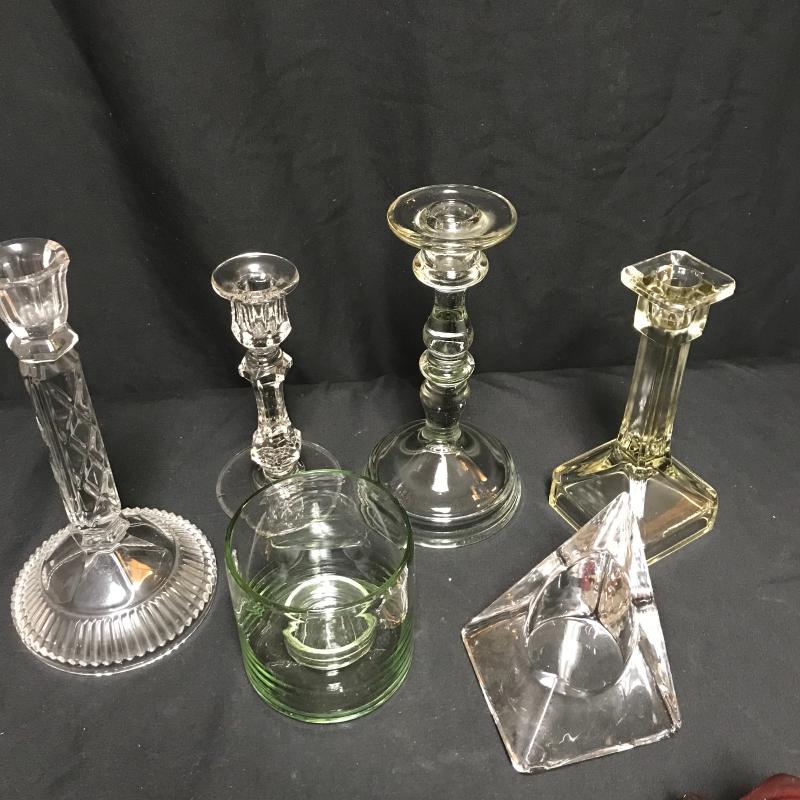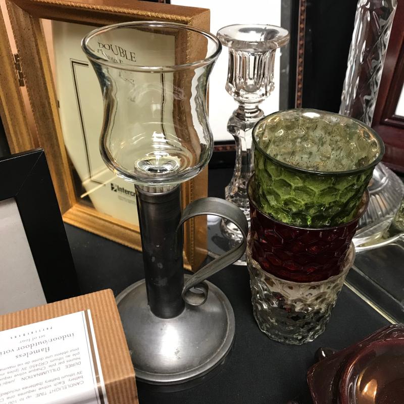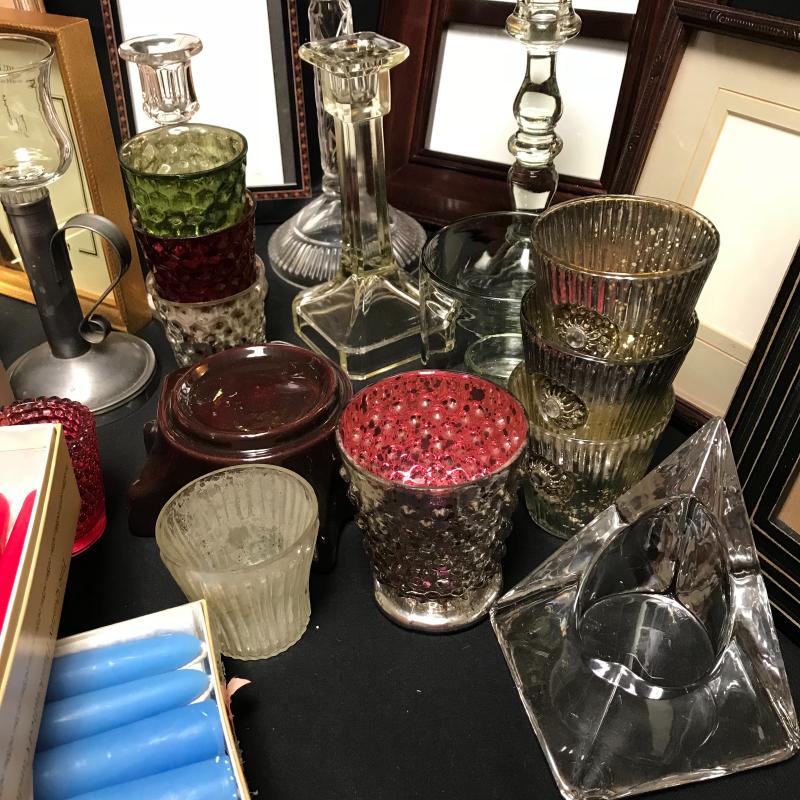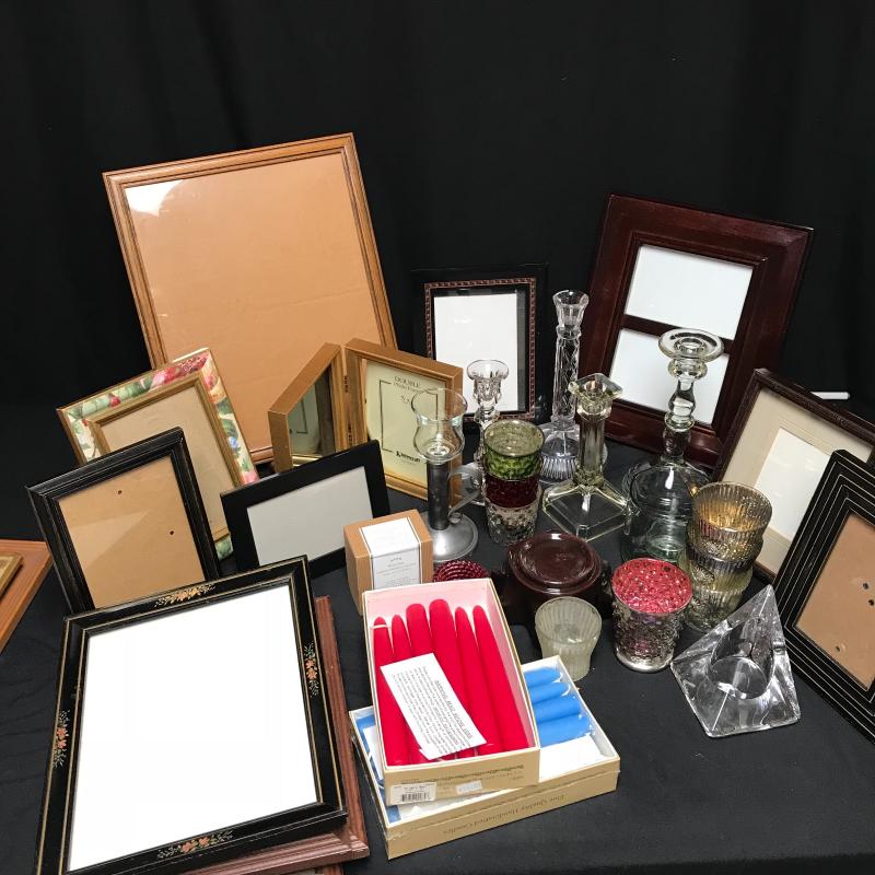 Several candle holders that include votives and candle sticks. Mostly glass. Frames are mostly wood and most are table frames but a few can hang on wall. Taper candles also in the lot. Local pick up only.