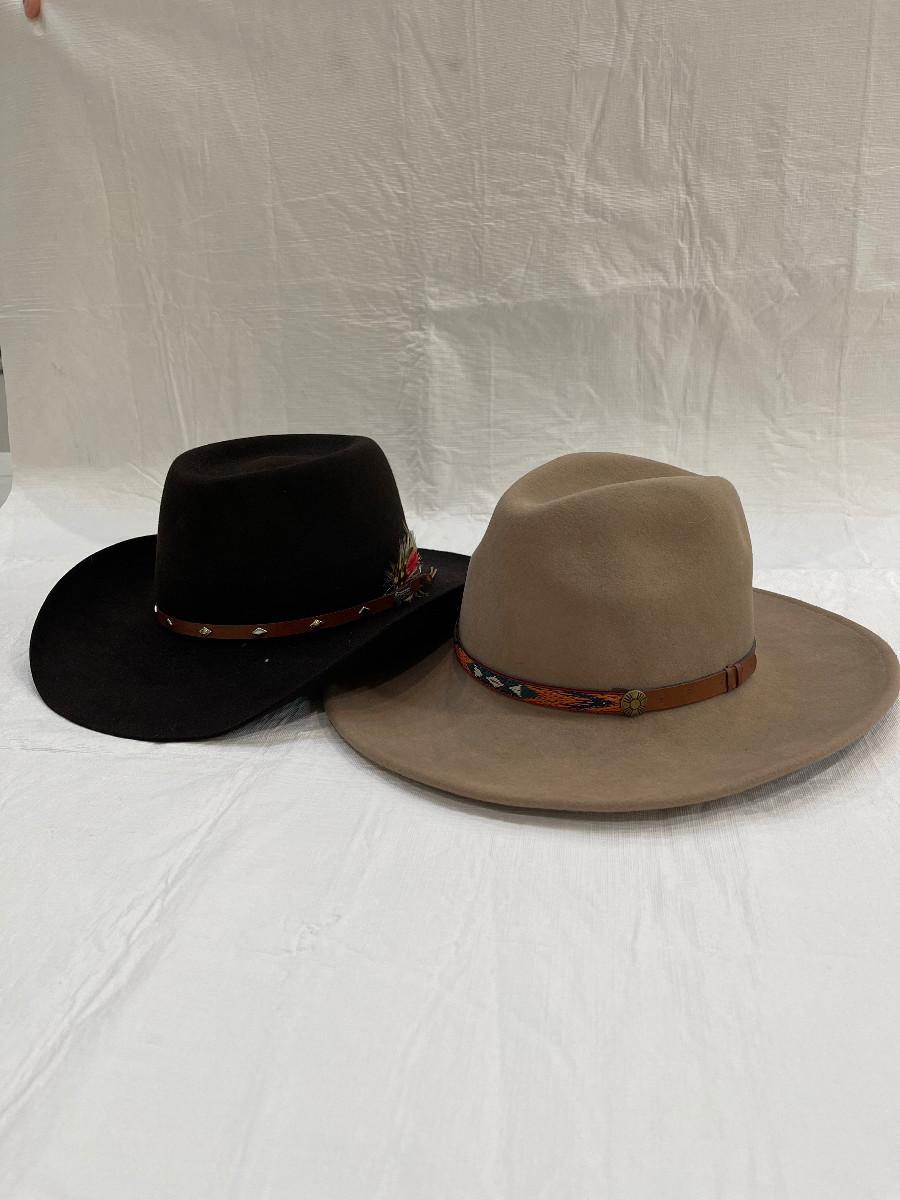 Cowboy Hats by Akubra Made in Australia (size 59-7 3/8) and "Thunder" by Golden Gae Hat Co Los Angeles, CA.
