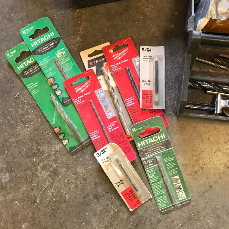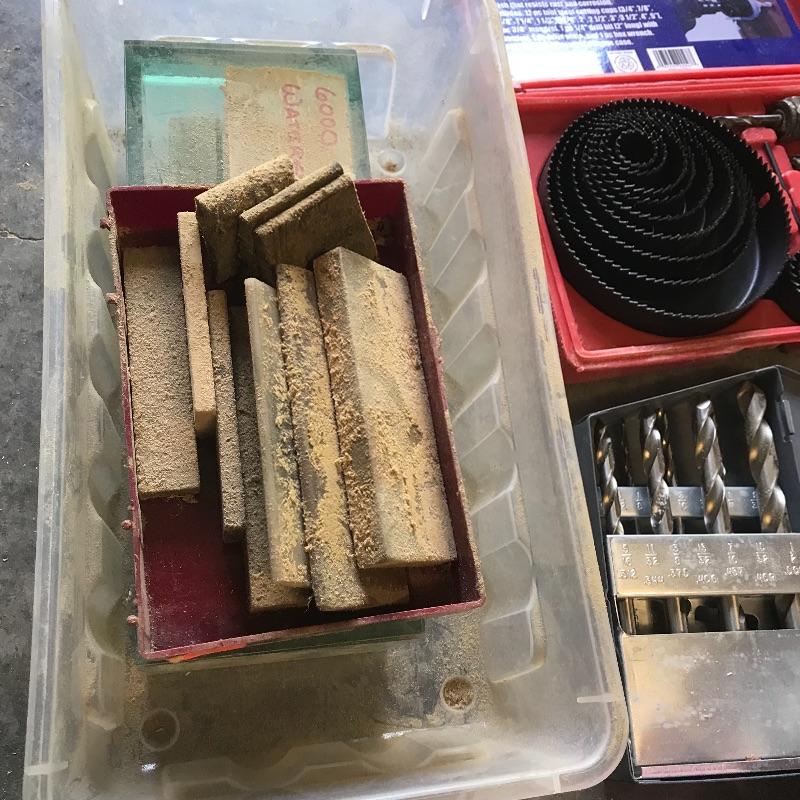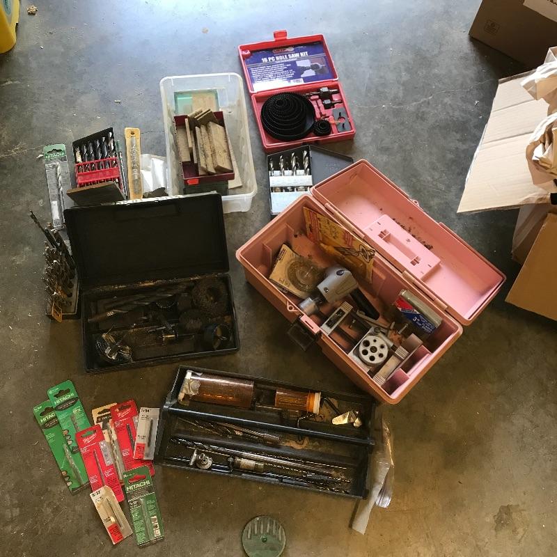 All shapes and sizes of Drill Bits. Drildex set, Hout Set, vertical stand with selection, Grip 16pc. Hole Saw Kit and several sharpening stones including 6000 grit wet stone. Local pick up only.