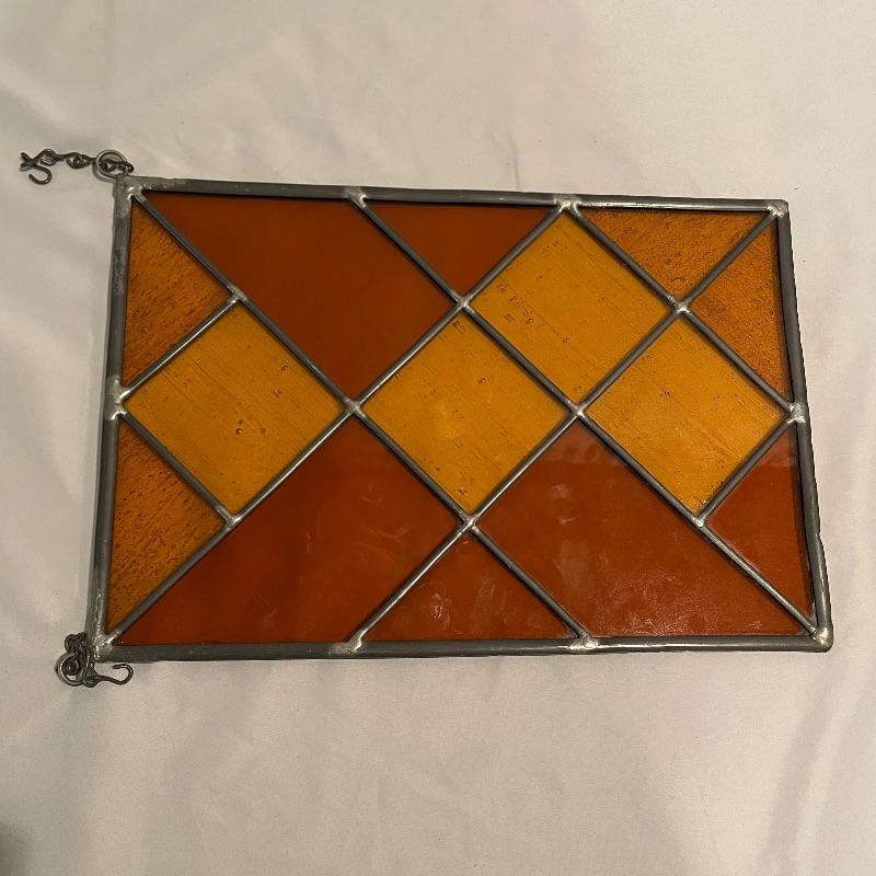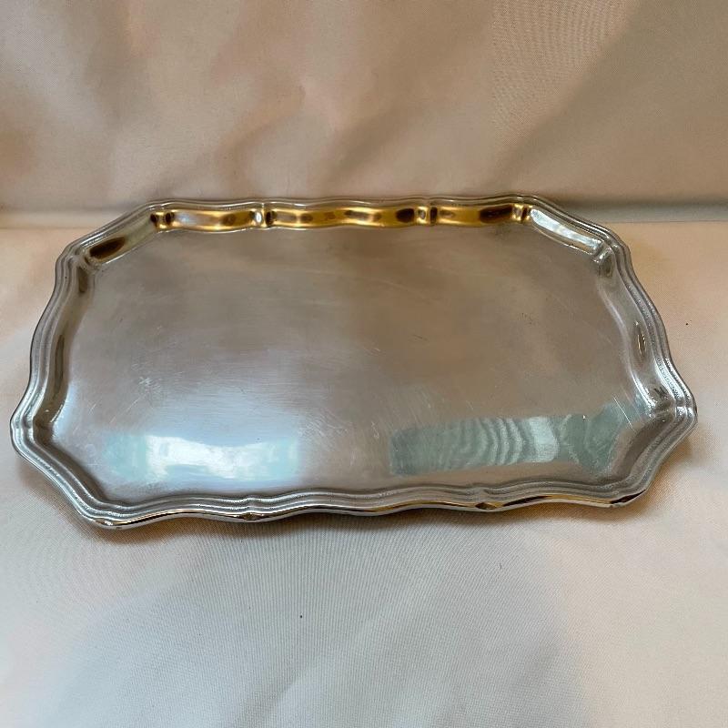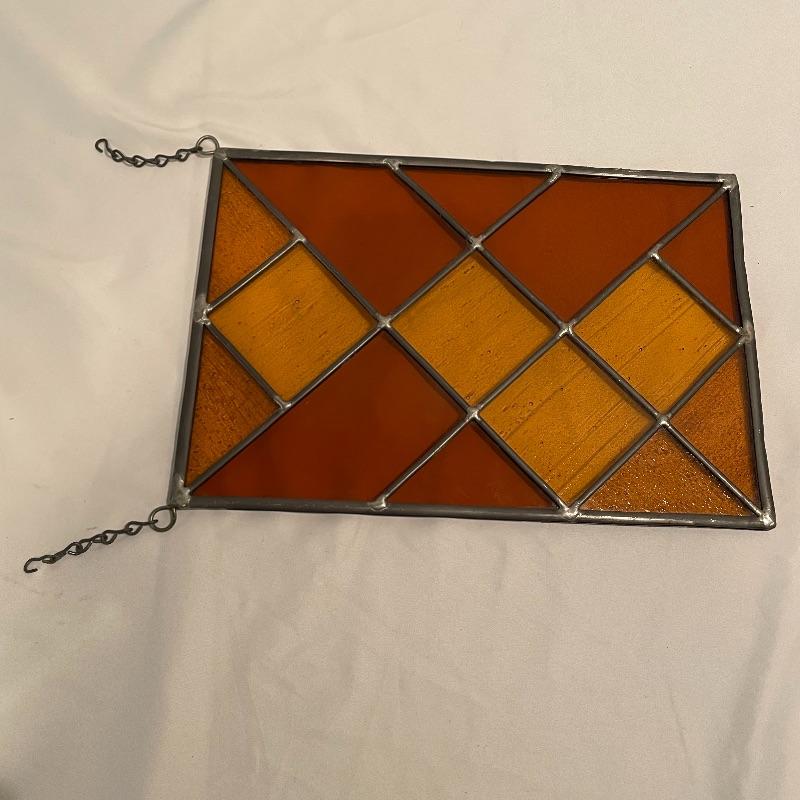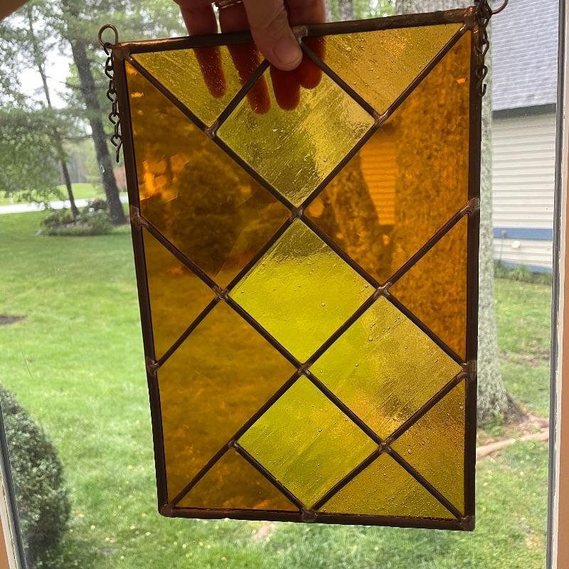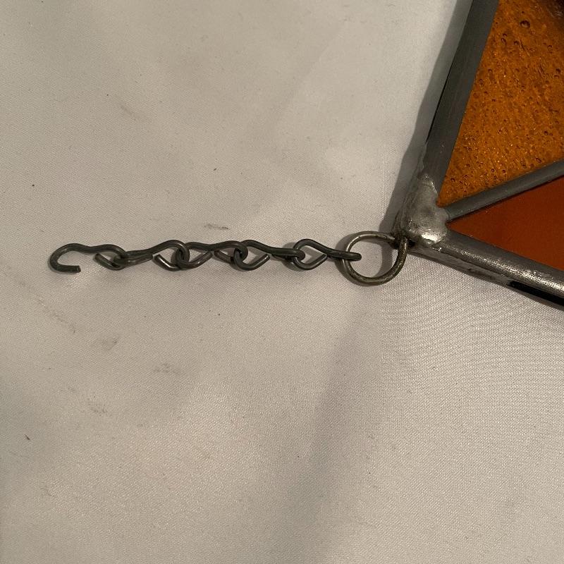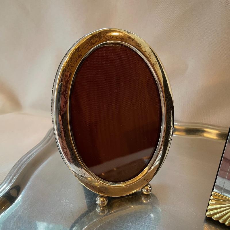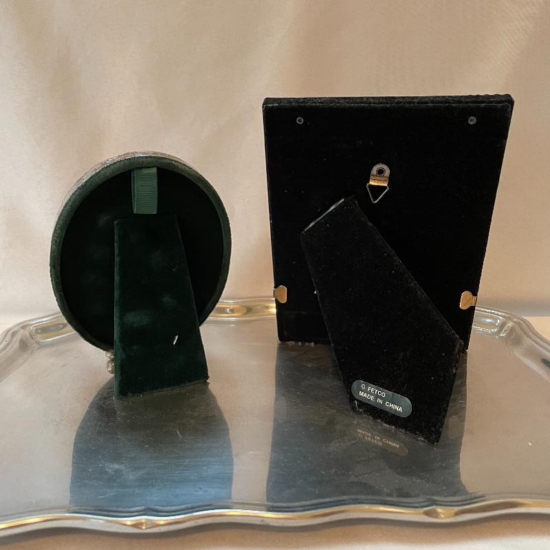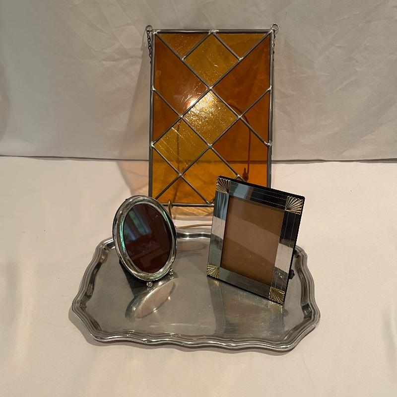 Silver colored decor including a 5.25” oval Sterling Gorham frame. Lot also includes a nice amber colored stain glass panel with chains for hanging and a second silver colored metal frame with golden colored scalloped corners. Lot also features a pewter tray with substantial weight for its small 13” x 9” size. Shipping available.