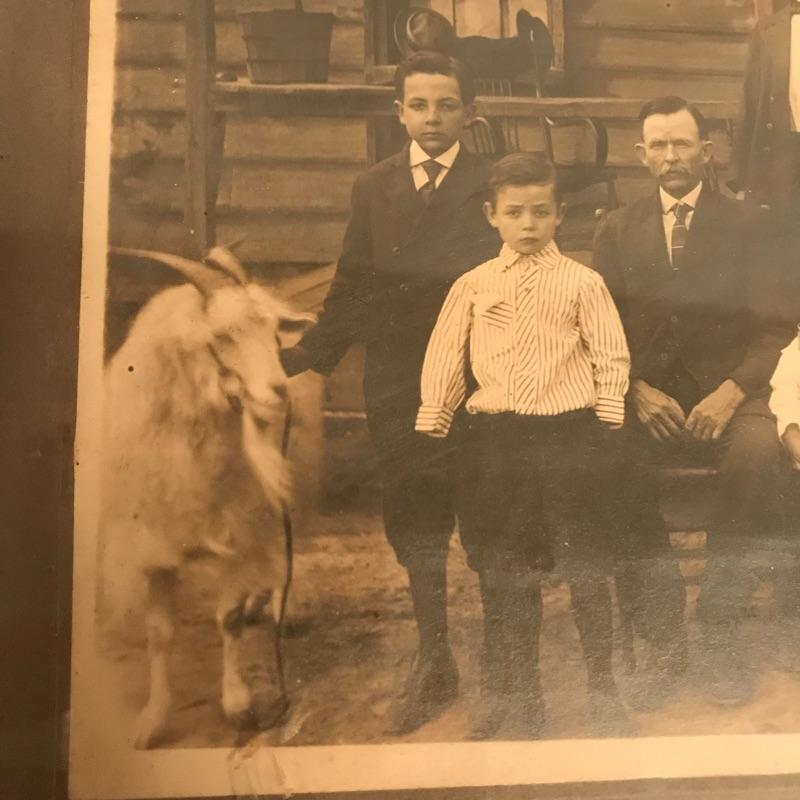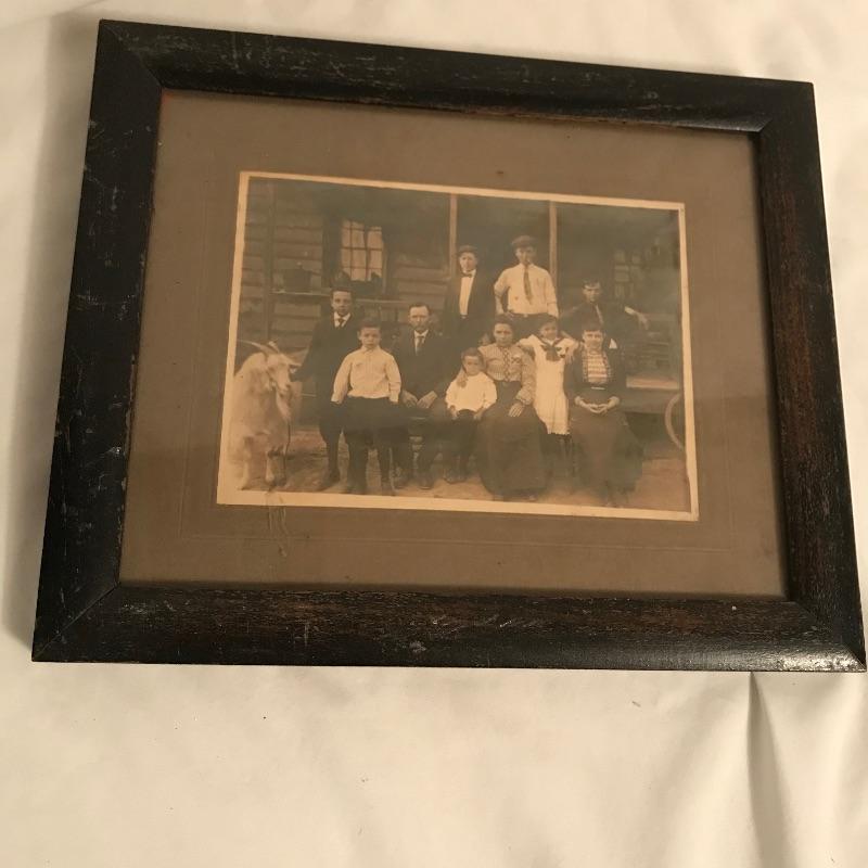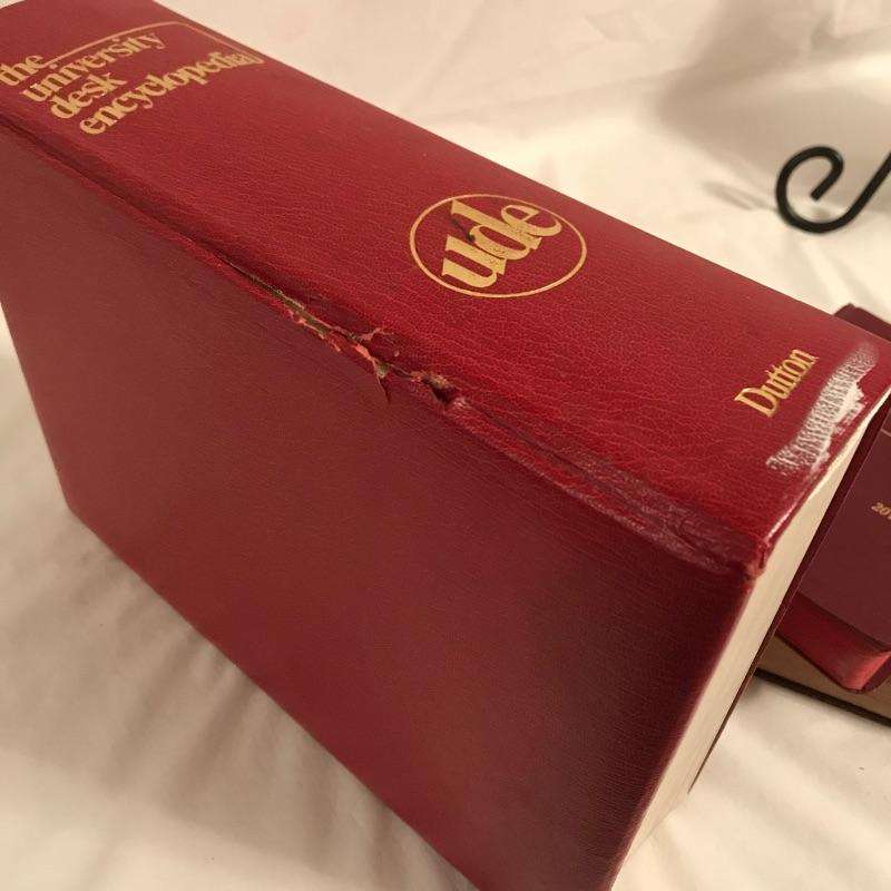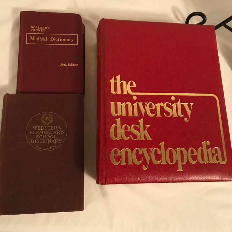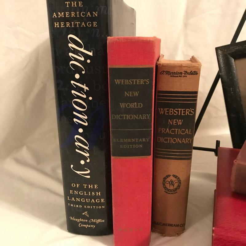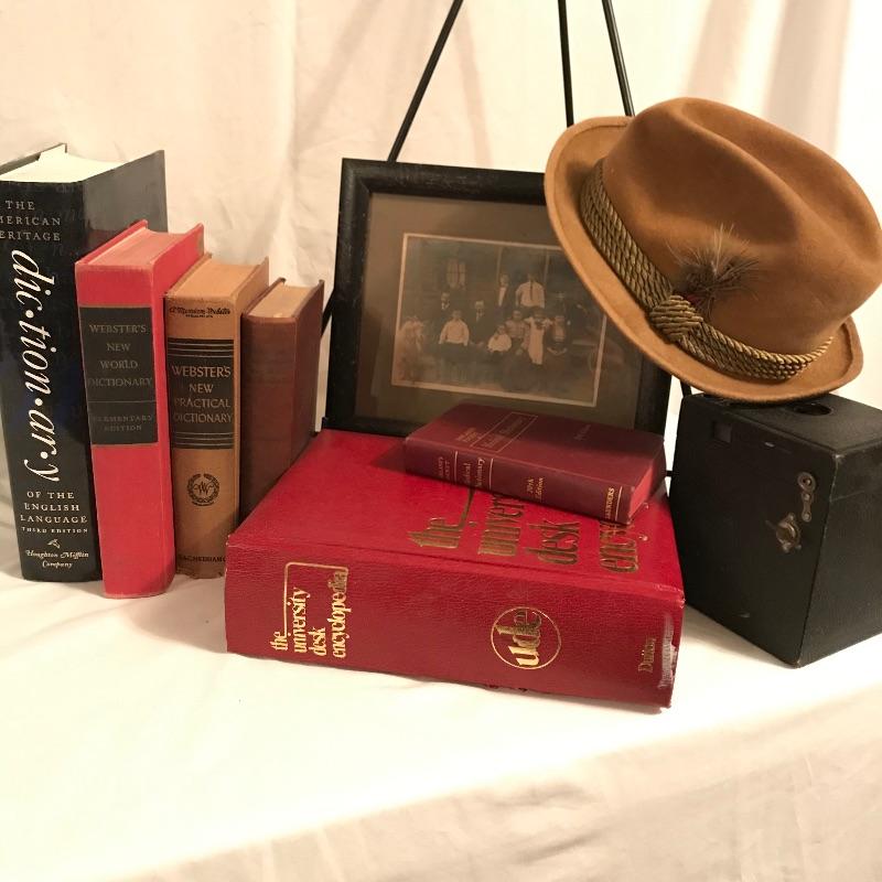 Fun old-time collection for your decorative wants. An old box camera measuring 4.5” x 6.25” x 5” with a family picture (including goat...) in a wood frame measuring 11.5” x 9.5”. One of the highlights of the lot is a size 7 3/8 Brooks Brothers hat. Lastly, a great collection of five dictionaries and an encyclopedia that crosses several generations! See photos. No shipping. Head form not included.
