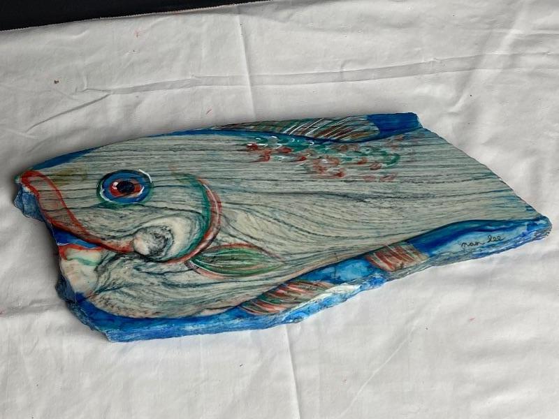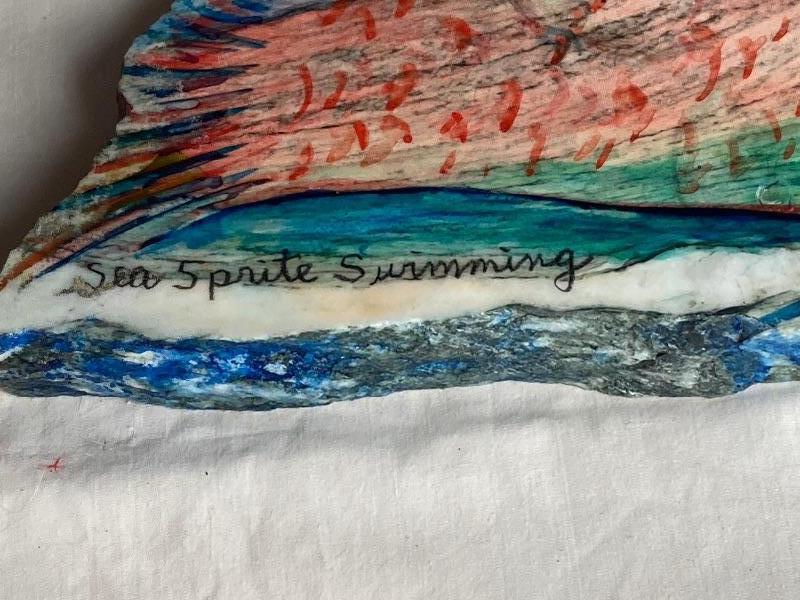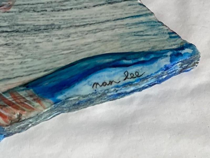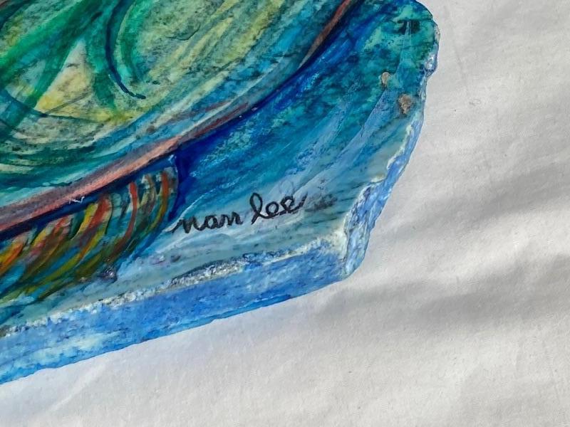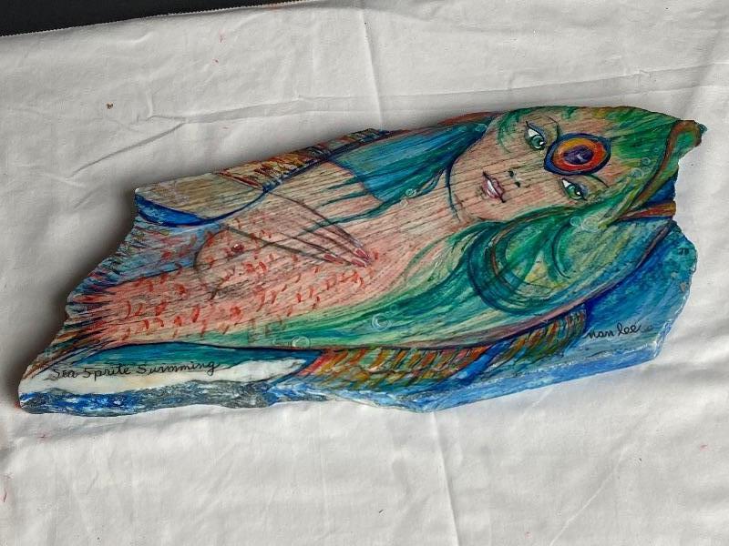 Nan Lee signed painting on stone “Sea Sprite Swimming” measures 14” long 7” wide and 3/4” thick. This piece has a second signed untitled painting on the backside