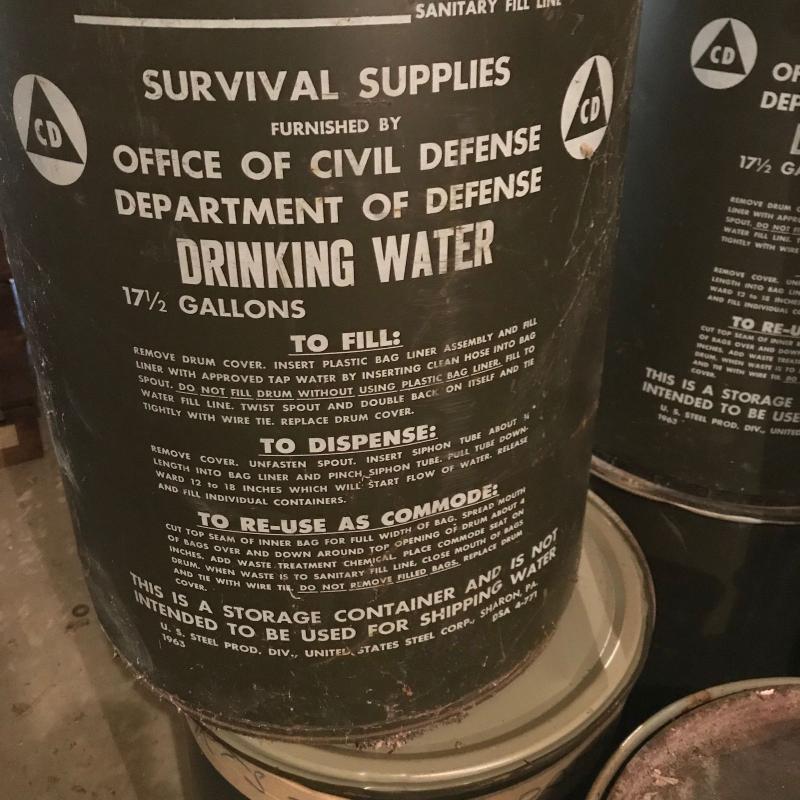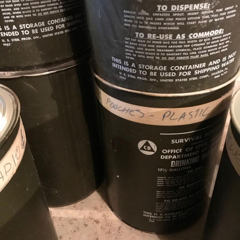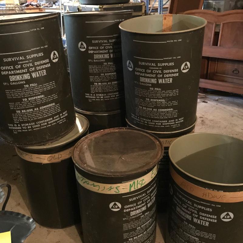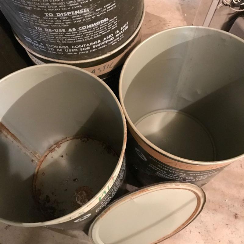 Lot includes eight 17.5 gallon barrels from Department of Defense. Label says Survival Supplies Drinking Water. Some have lids, some don’t. All are empty and measure 16.5”d x 23”h. Fill them with whatever you want. No shipping. Local pick up only.