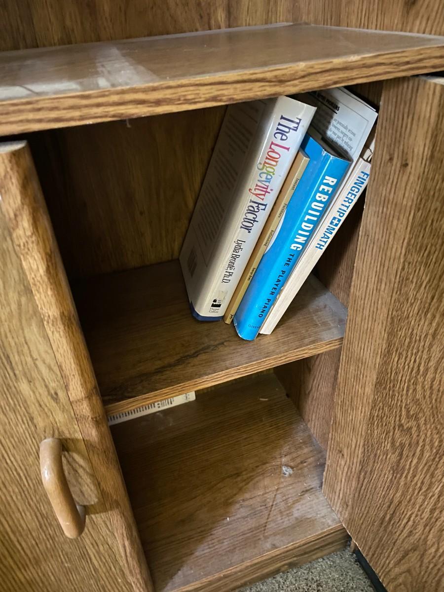 tall bookshelf with contents.