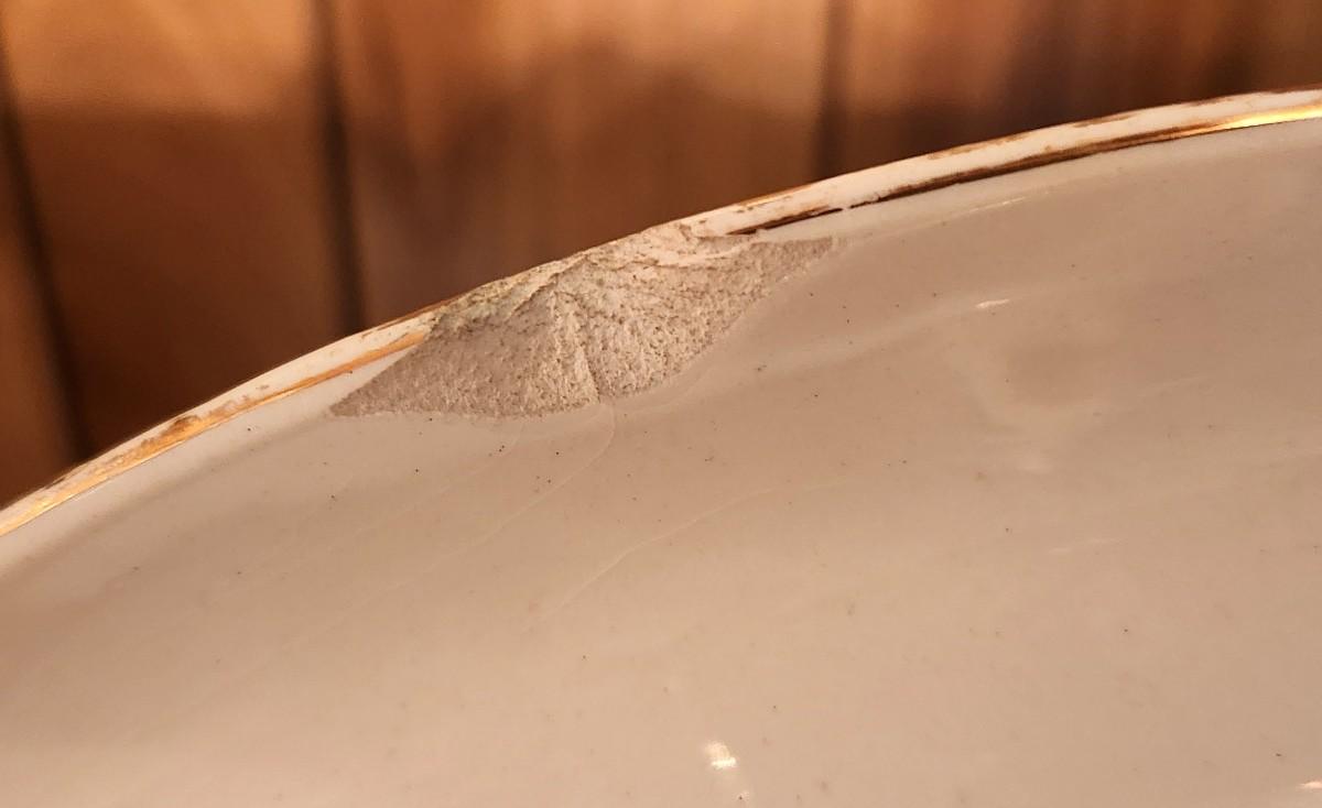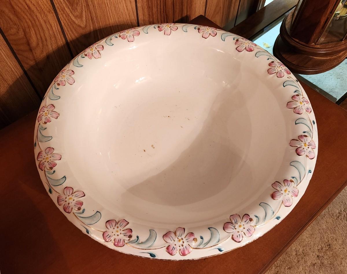 This bedroom bowl/pitcher set is not decorative - it has some age to it. Pitcher is 11" tall - has normal crazing, etc - bowl is 16" across an has a small chip under the rim (see photo - does not show when displayed).