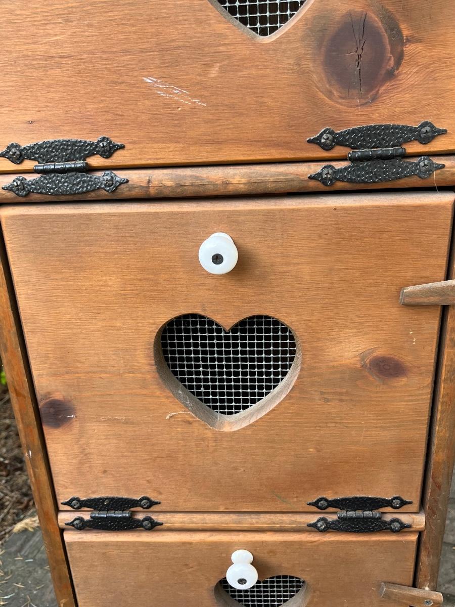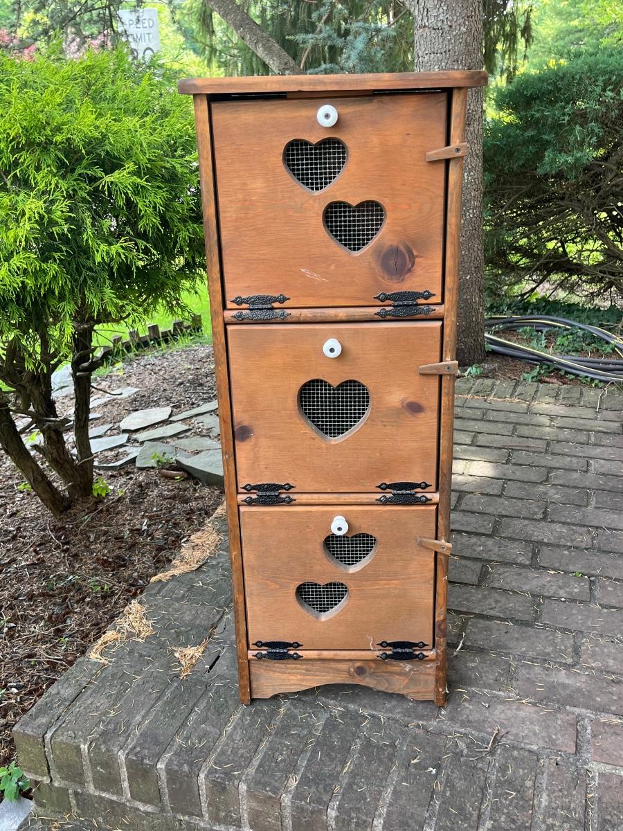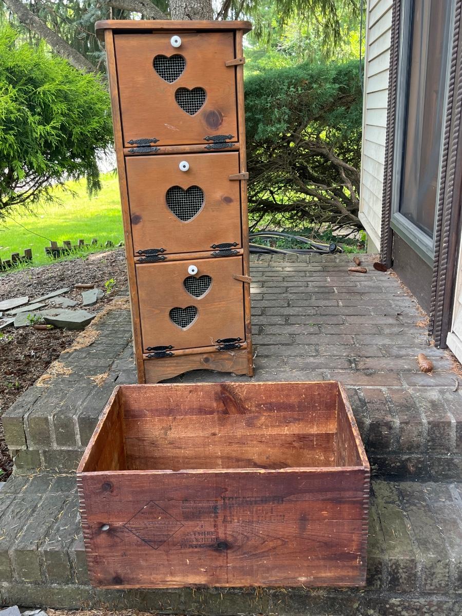LOT 258: Vintage Pine Tree Creations Heart Cabinet & Bird’s Eye Wooden Crate