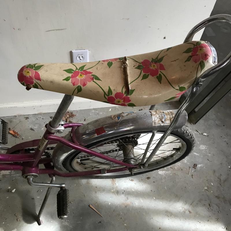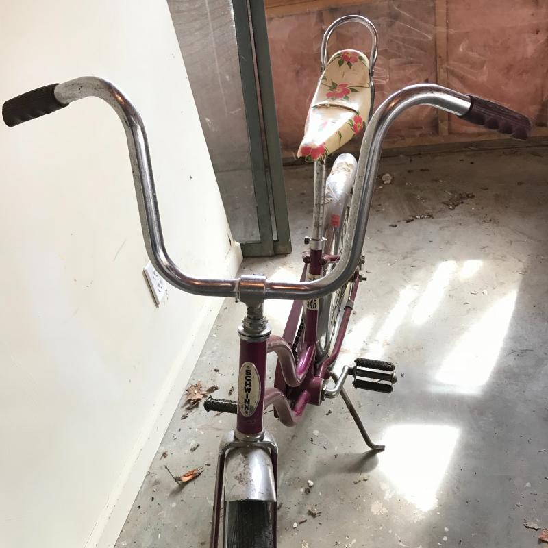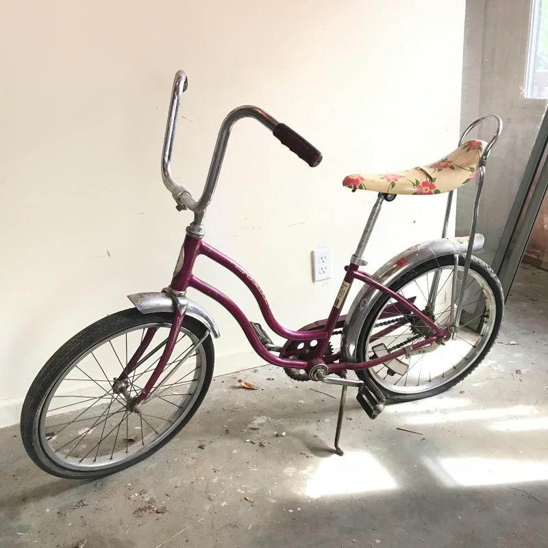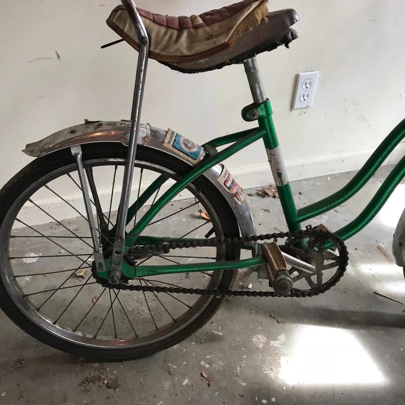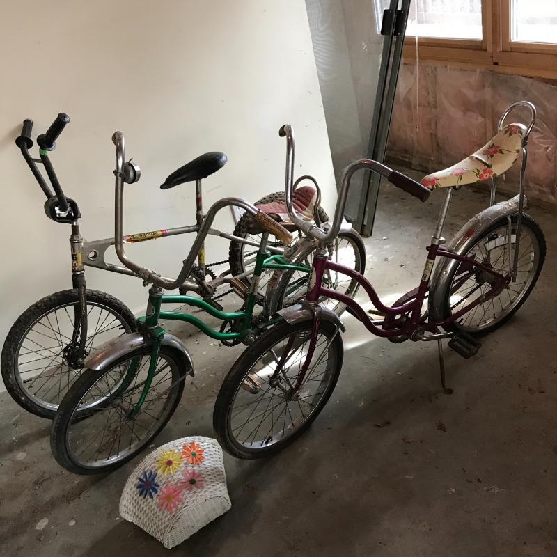 Nostalgic collection of bicycles. A plum colored Schwinn with banana seat, steel colored Mongoose, and a vintage green Sears bicycle. All need love to get into mint condition. The chains on each bike are attached and move as supposed to. See photos. This lot’s cherry on top are the white flowered basket and extra rear rim included in collection. No shipping.