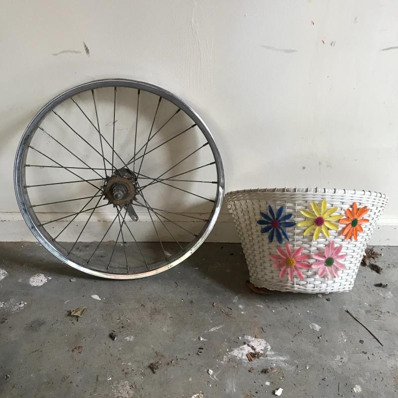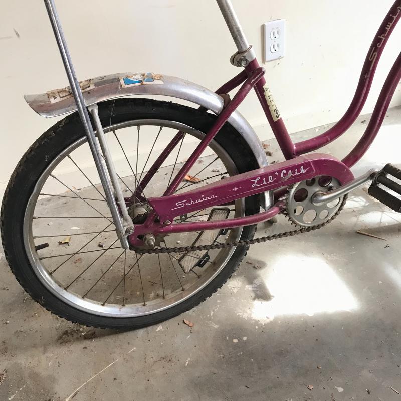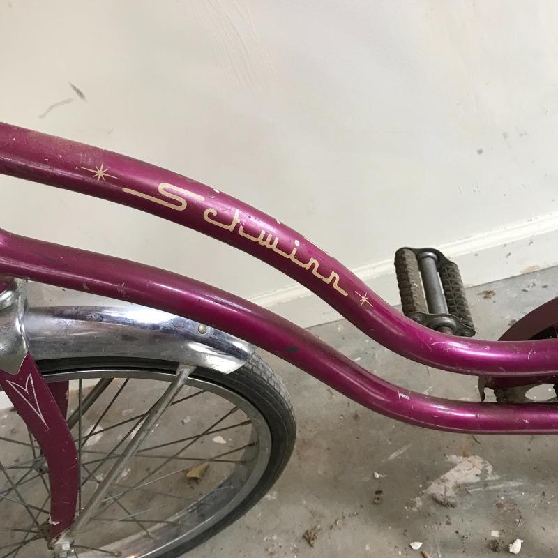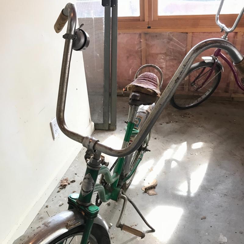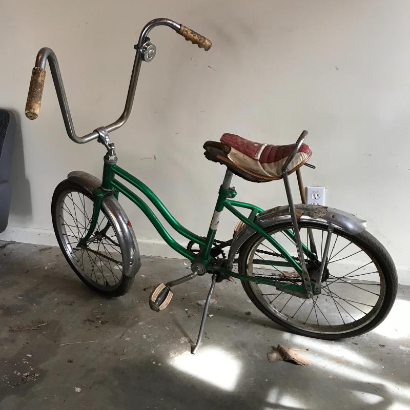 Nostalgic collection of bicycles. A plum colored Schwinn with banana seat, steel colored Mongoose, and a vintage green Sears bicycle. All need love to get into mint condition. The chains on each bike are attached and move as supposed to. See photos. This lot’s cherry on top are the white flowered basket and extra rear rim included in collection. No shipping.