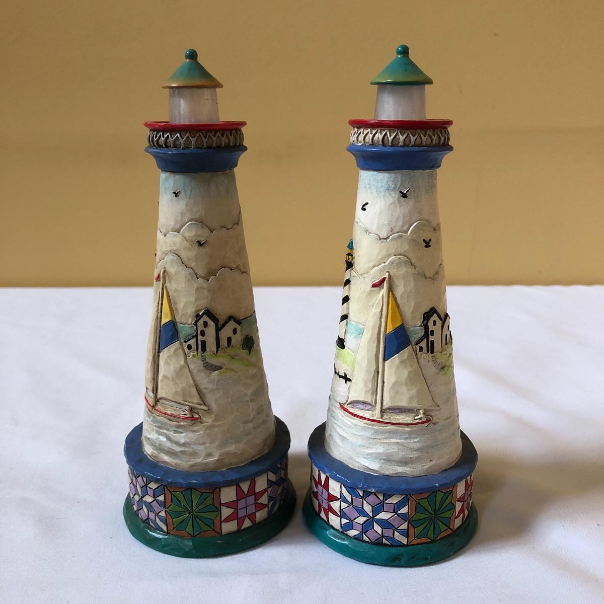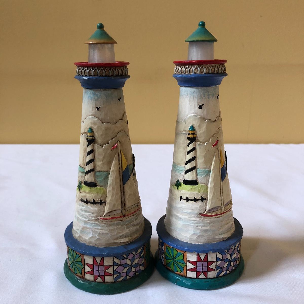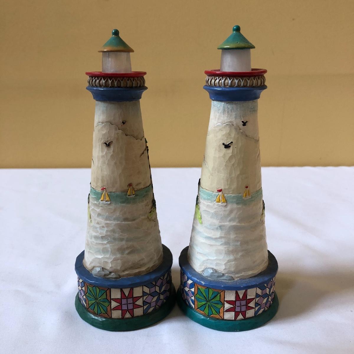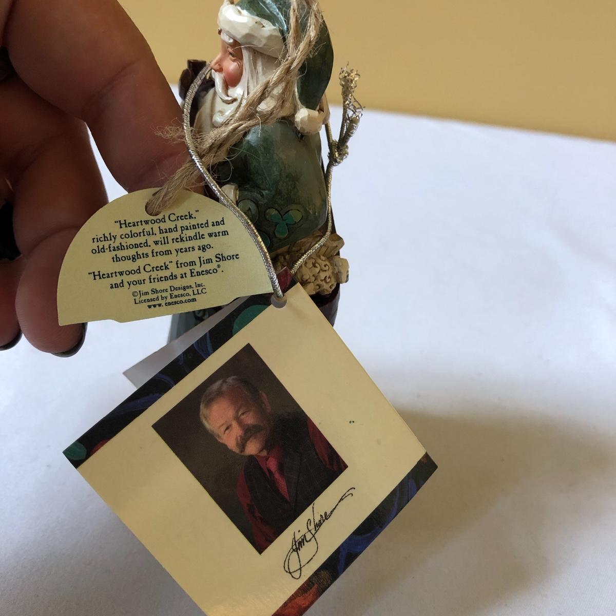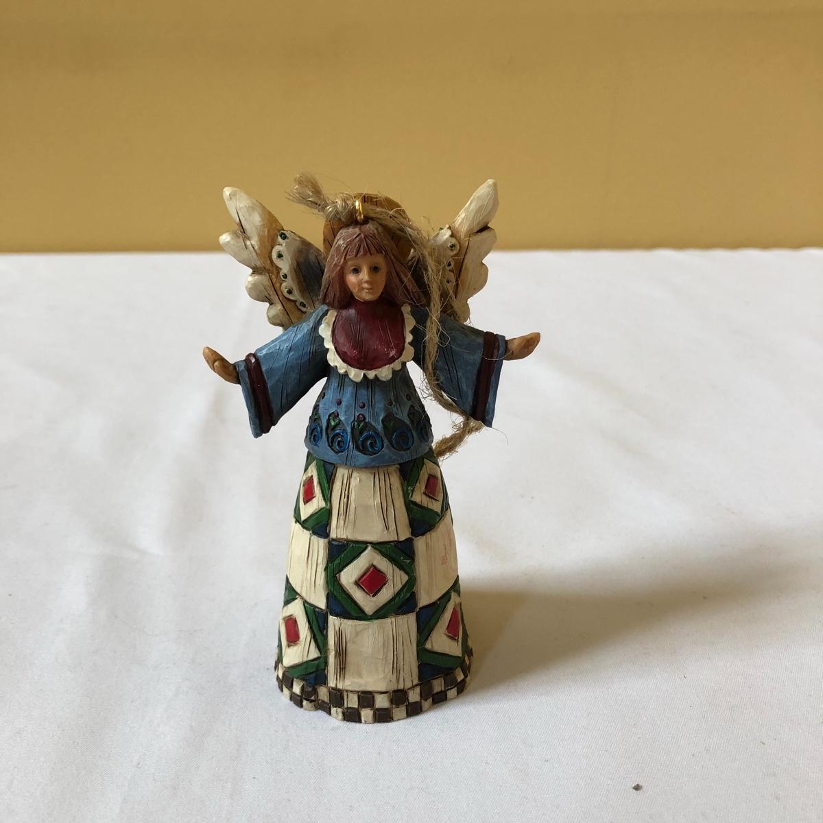 Eight Jim Shore figurines make up this collection. “Cosmo” a 10.5 inch tall gray dog, “Licorice” a black dog on a square base, two “Light up Heartwood Creek” light houses, one of which needs its battery changed, “A Bit Squirrelly” gray squirrel, a small angel ornament, an Easter egg with two rabbits, and a “Heartwood Creek” Santa ornament are the items in this lot. The title of the Easter egg figurine is currently covered by a price tag. Jim Shore collectibles are cute and colorful and are lovely additions to any display space!