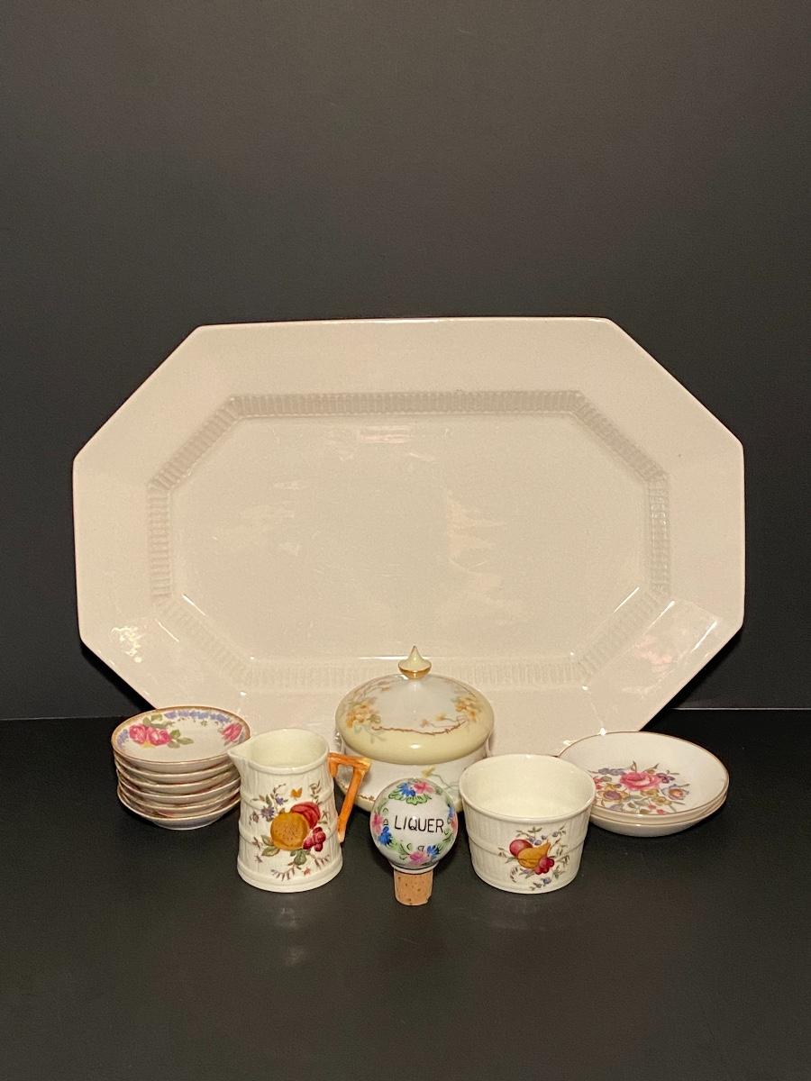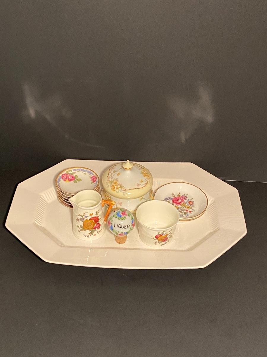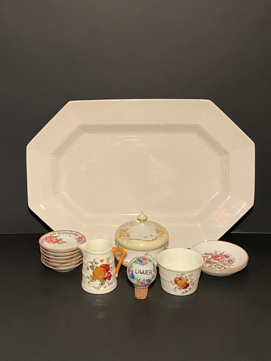 Lot 259: Ironstone Tray, Bone China Trinket Dishes, Porcelain "Liquor" Decanter Stopper and More