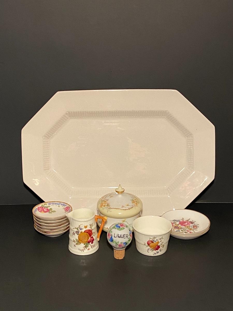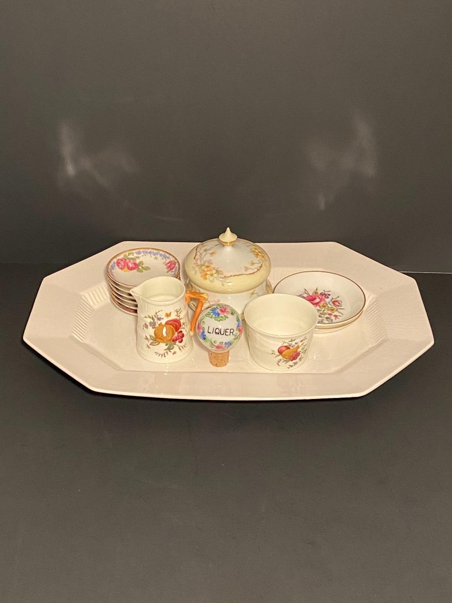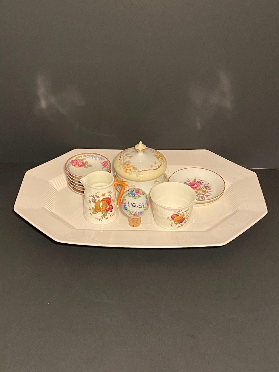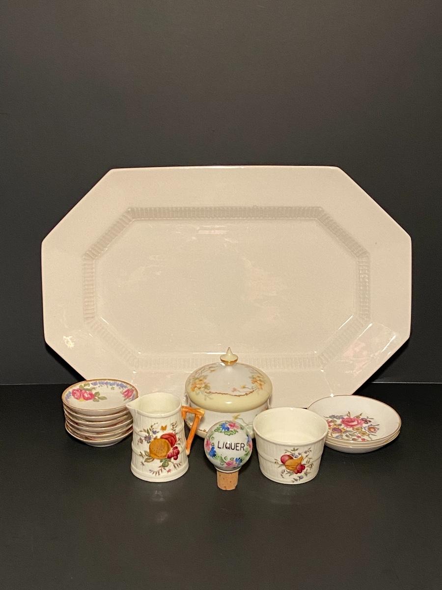 Lot 259: Ironstone Tray, Bone China Trinket Dishes, Porcelain "Liquor" Decanter Stopper and More