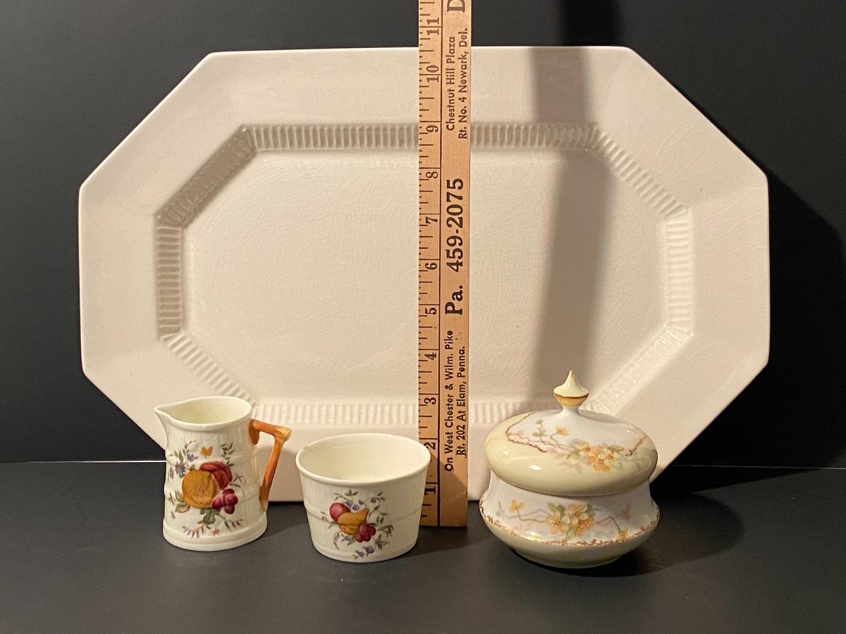 Independence Ironstone dish, Bone China ring dishes, creamer and bowl, JP France plates. Please see all pictures as they are the best representation of the items. The pictures show condition, measurements if taken, and what is included in the lot. Due to the large amount that we photograph and the time frame, we are not always able to take measurements. All items unless noted, are pre-owned and have been used. If you purchased furniture, you must bring help. We do not allow one person to carry large furniture out on their own. Bring help, tools and a truck for the safety of our client’s homes, and your personal safety. Company policy. Thank you.