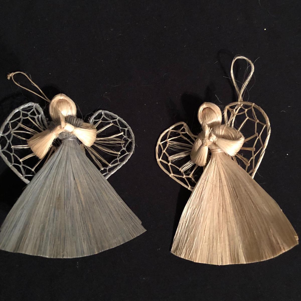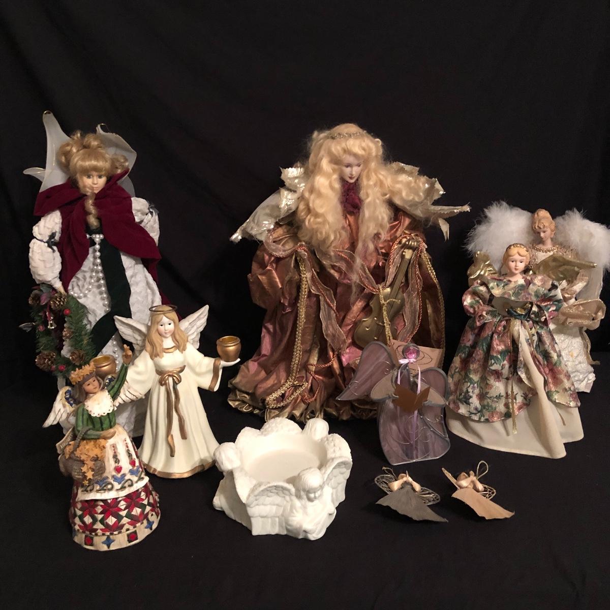There are ten angels with the two tallest measuring almost 19” and 20”. Four angels are primarily made of fabric, three are ceramic, one is glass and the last two are made of corn husk or straw. Shipping Available.