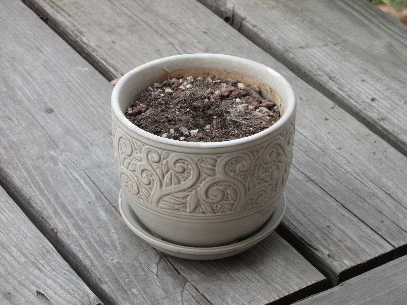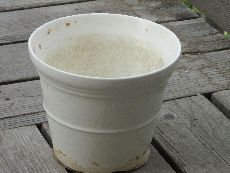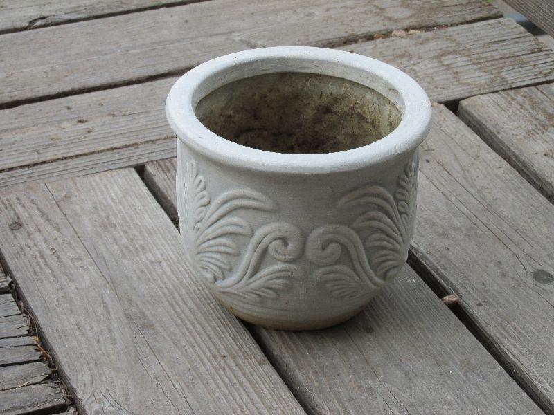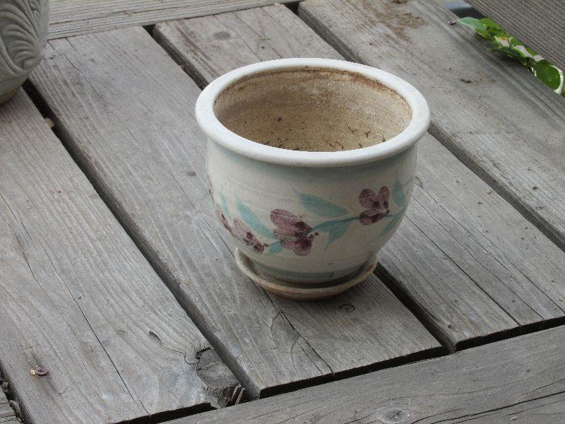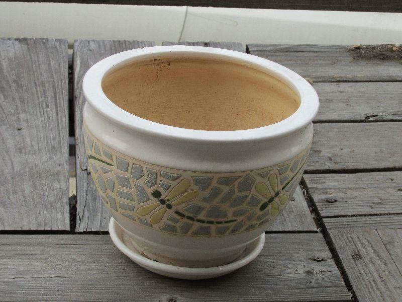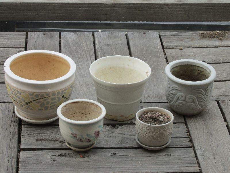 Set of five ceramic designer pots. One with dragon fly tiles very nice. All differing sizes and shapes. All pots have been used.
