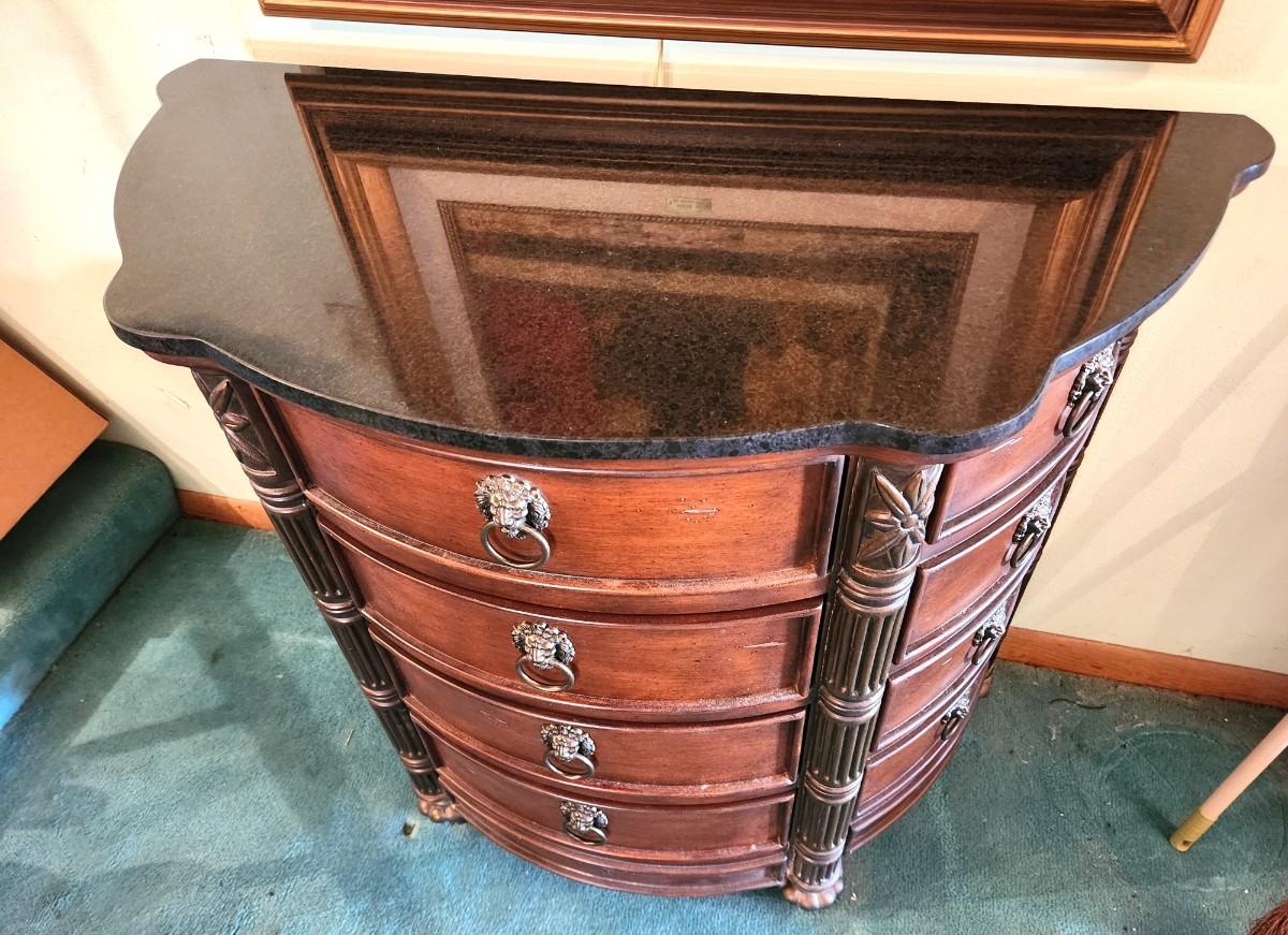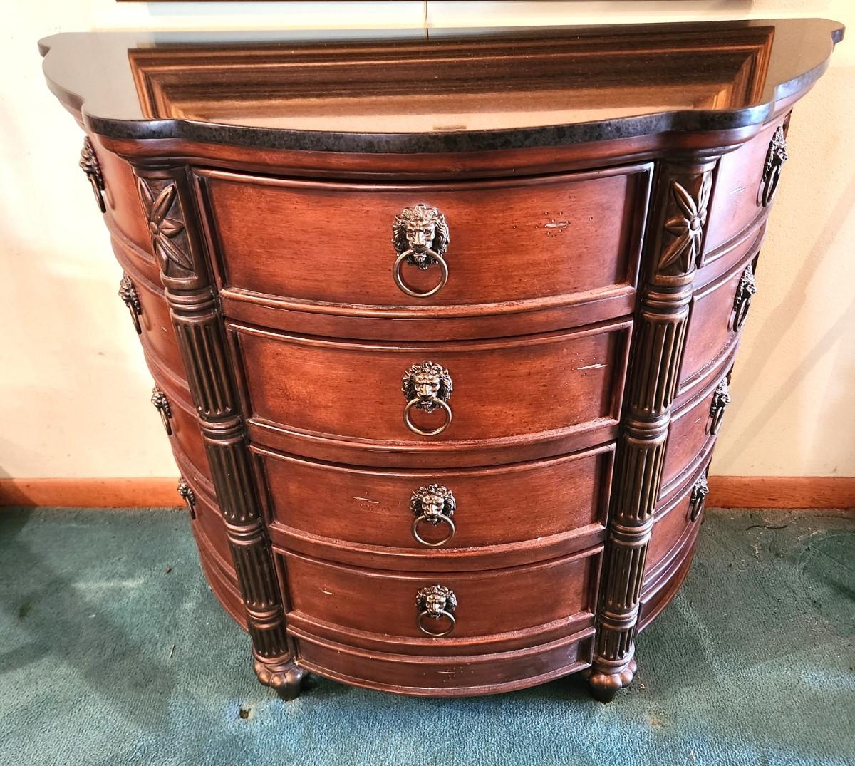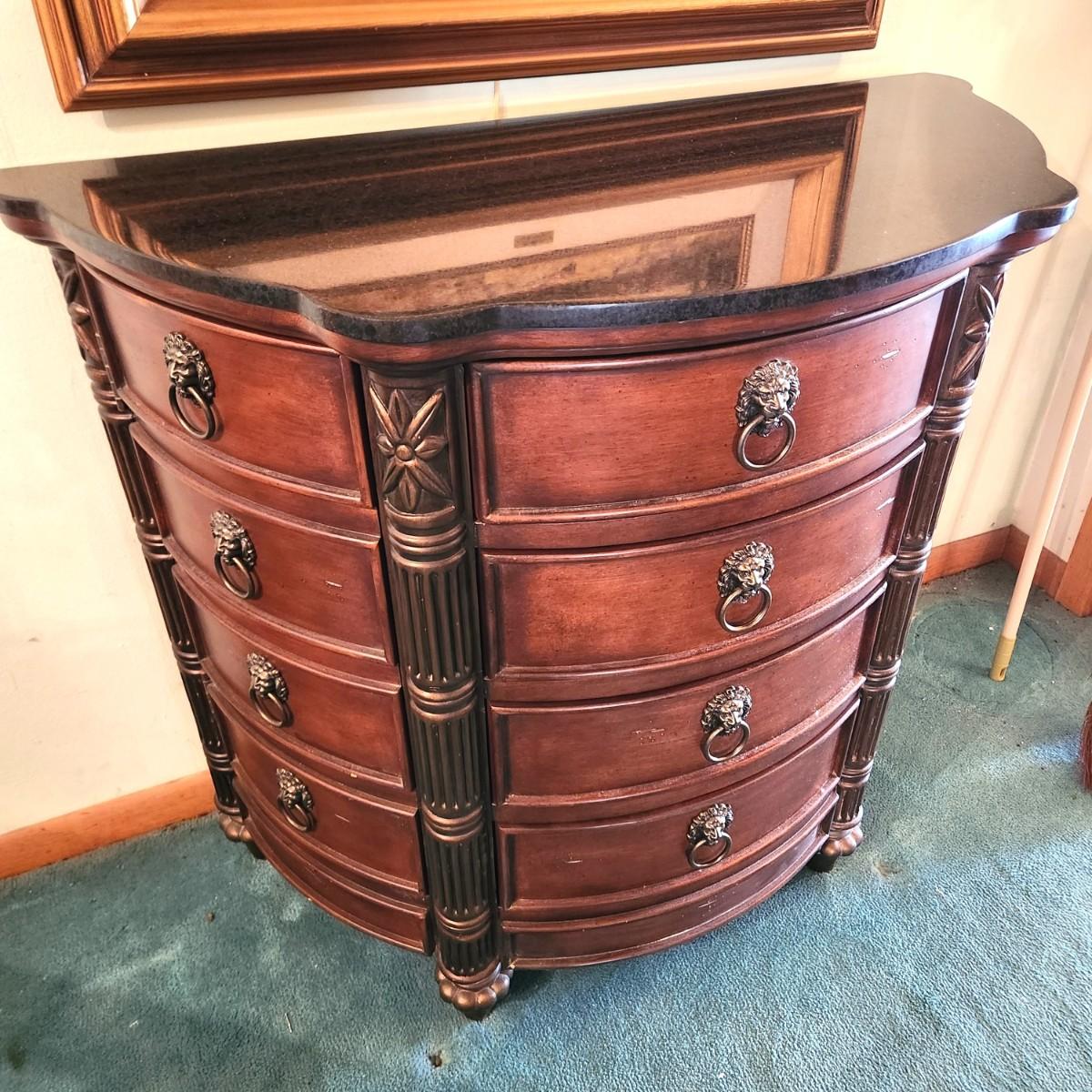 Attractive Contemporary Demi-Lune Side Table with 4 drawers in front (false drawers on sides) - Marble top - good condition, 41" across, 3 feet tall.
