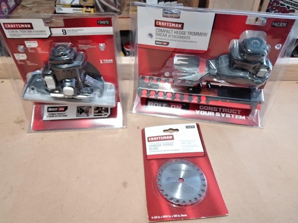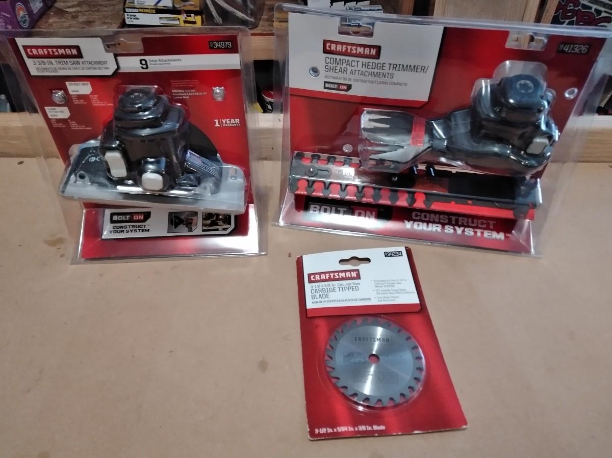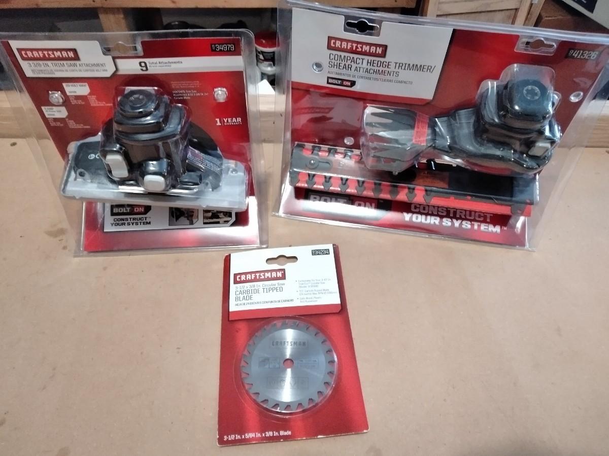 CRAFTSMAN DRILL ATTACHMENTS INCLUDING COMPACT HEDGE TRIMMER/ SHEAR, 3 3/8" TRIM SAW, AND A CARBIDE TIPPED SAW BLADE..