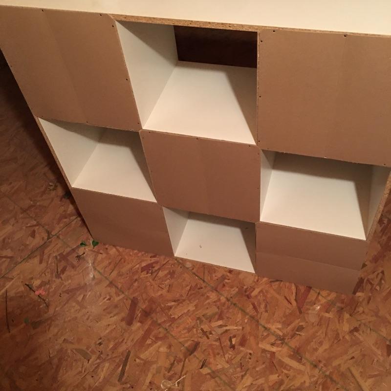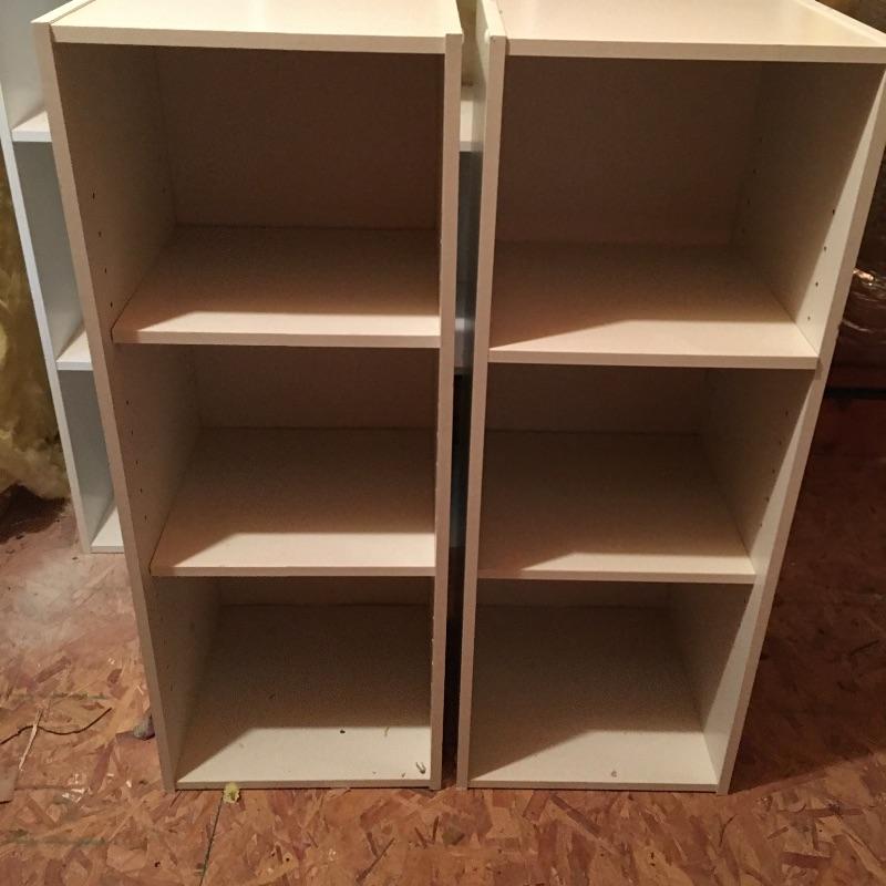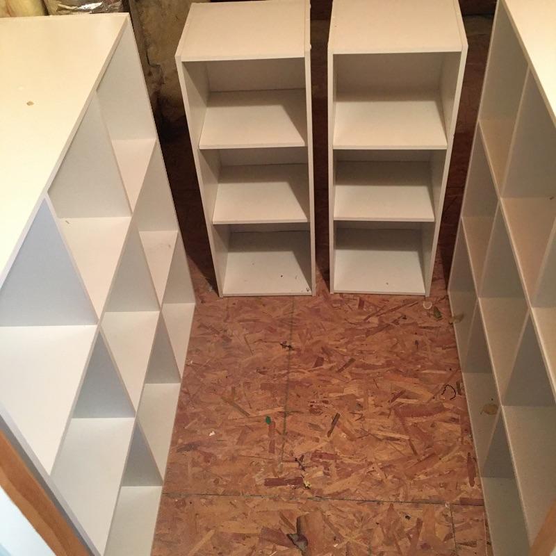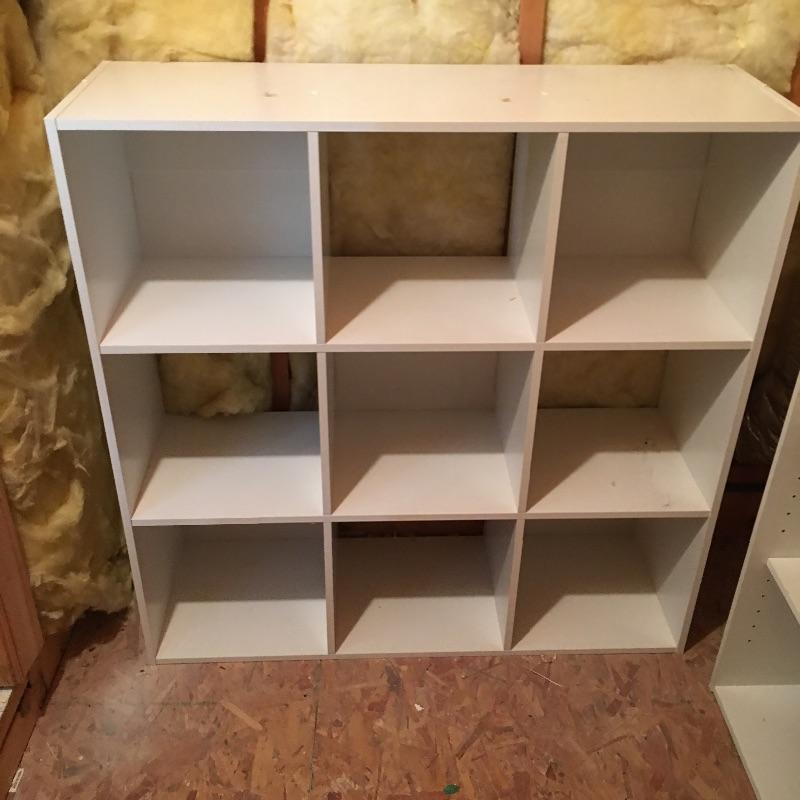 Four cube shelving units include a pair of three cube shelves and a pair of nine cube shelves. Nine cube shelves measure 11.75” x 36” x 36”. This nice selection of units will cover all your storage needs.
