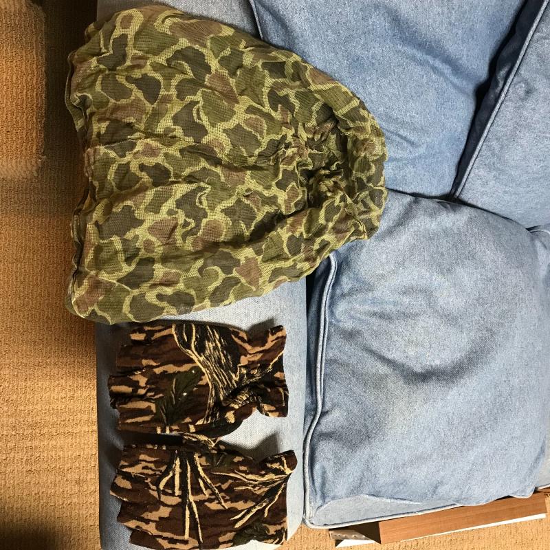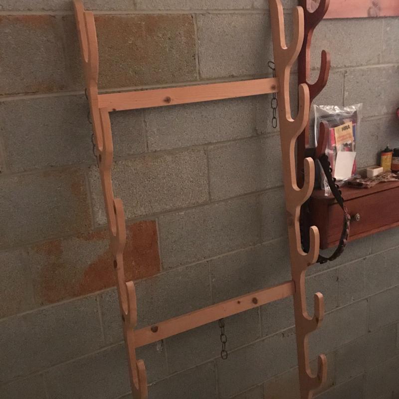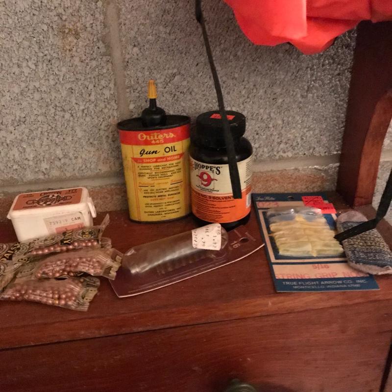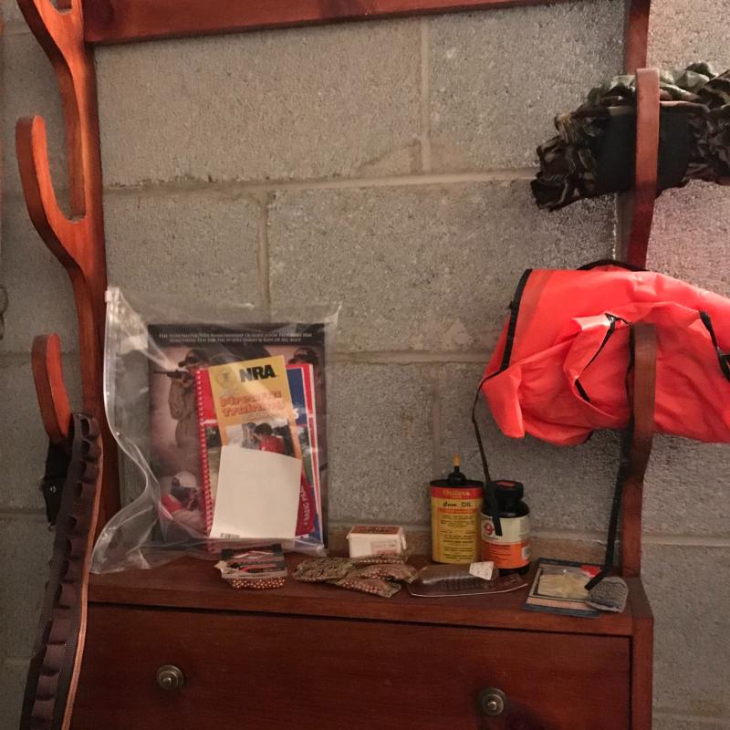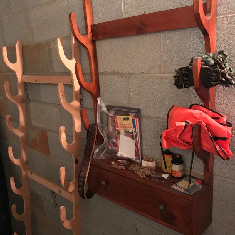 Lot includes two rifle racks. Larger one measures 26” x5.5” x75.5” is unfinished and will hold 8 rifles. Smaller one measures 25.5” x6” x41” has a drawer and is finished holds 3 rifles. Packs of BBs, orange vest, camo gloves and face netting, and more also included. Local pick up only.