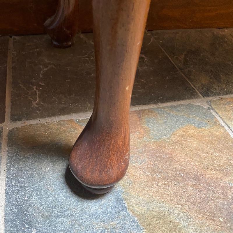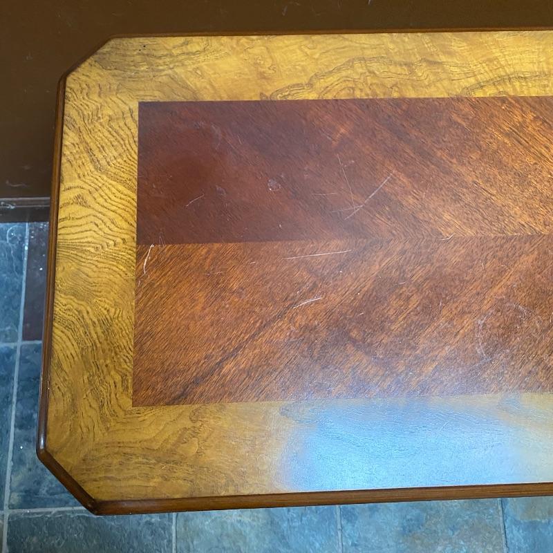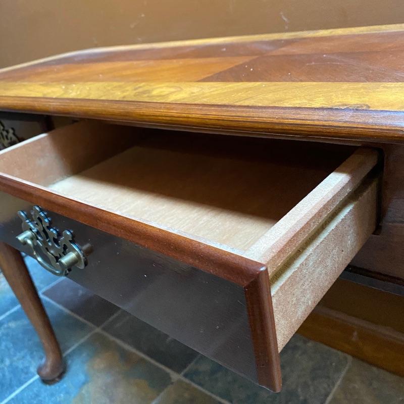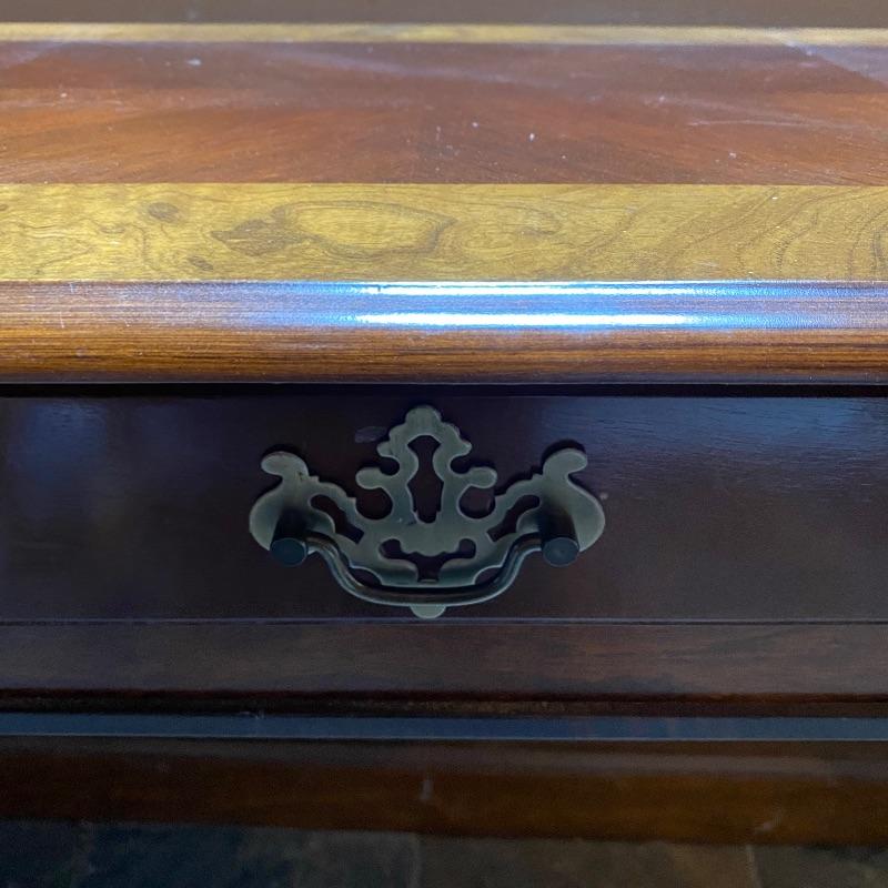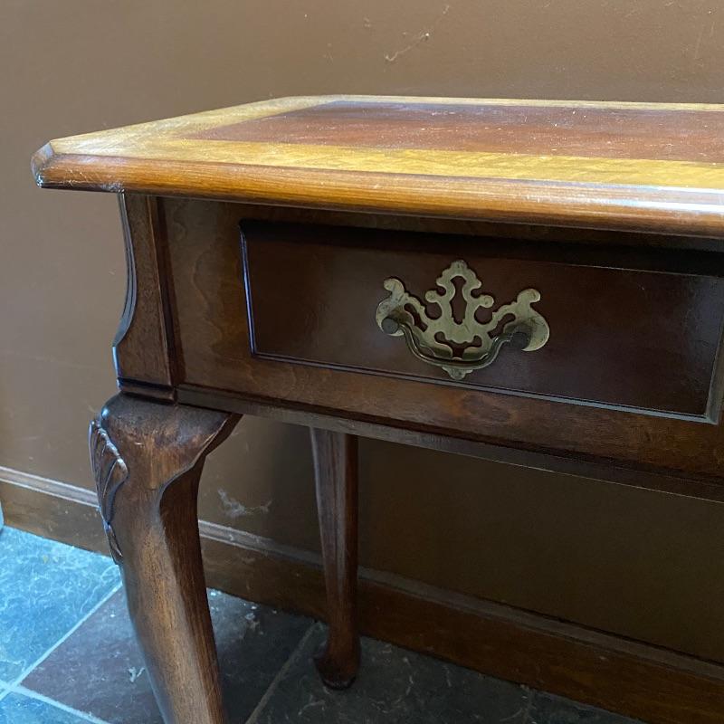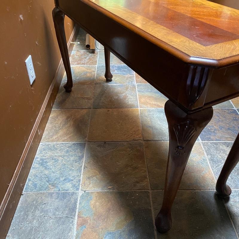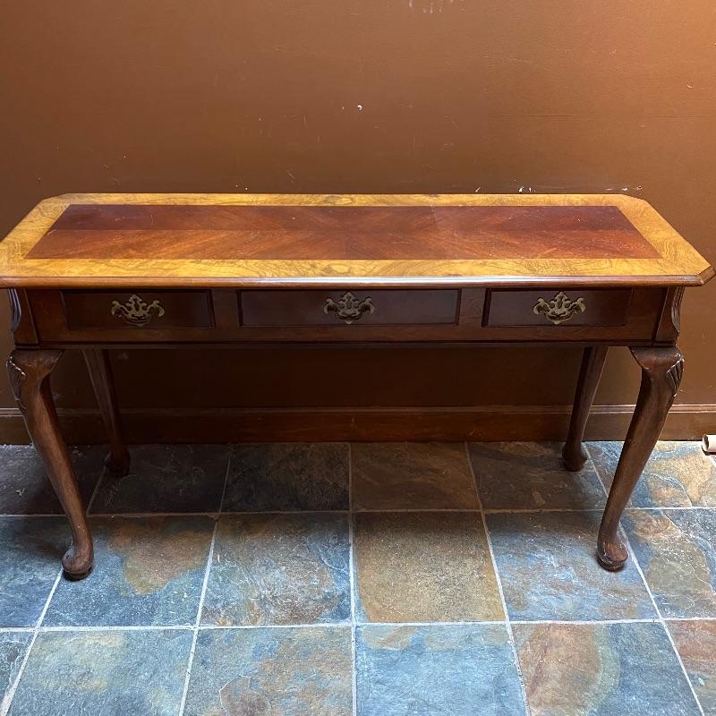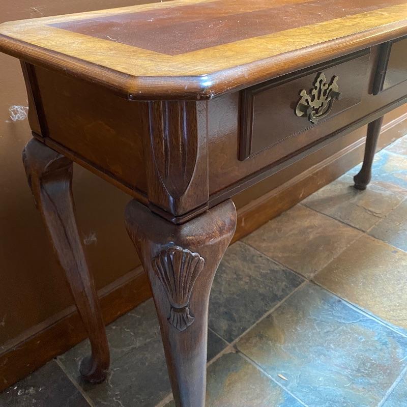 Lovely wooden hall table with two tone top. Has one drawer in middle to keep your keys and such. The two side drawers are faux. Nice leg detail. Measures 48” x 16” x 28”. No shipping.