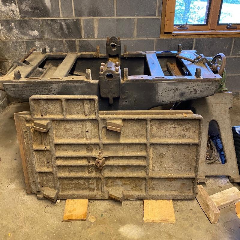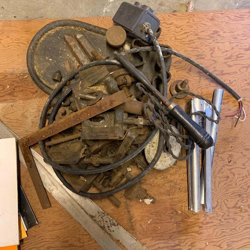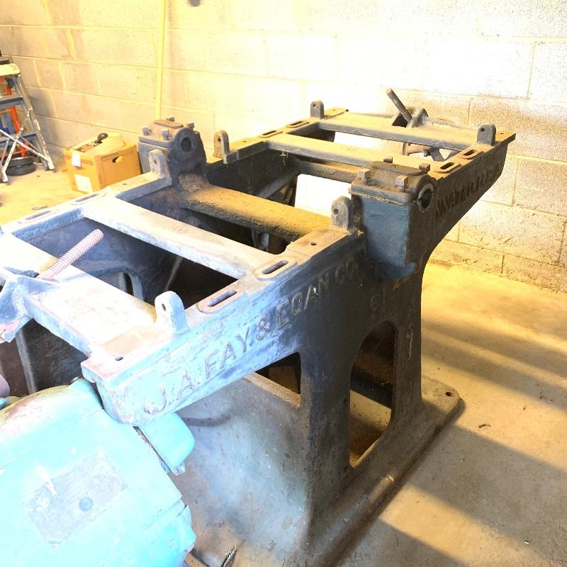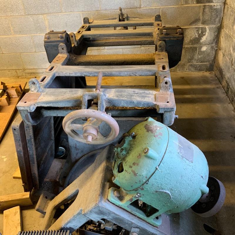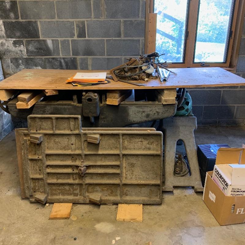 Here you’ll find a heavy duty vintage planer by J.A. Fay & Egan. We are not sure all pieces are here, but we’ve included a photo of what it should look like that we found on internet, this is the last photo shown. The tip is laying next to it in our photos as it is too heavy to move. Good news is this is right by the door and driveway so you don’t have far to go. You MUST bring help to load this. No exceptions. If you are looking to melt it for the metal value, your in luck. We’ve included a couple boxes of scrap metal and old saw blades that you can also melt. All items must be taken with the lot. No shipping.