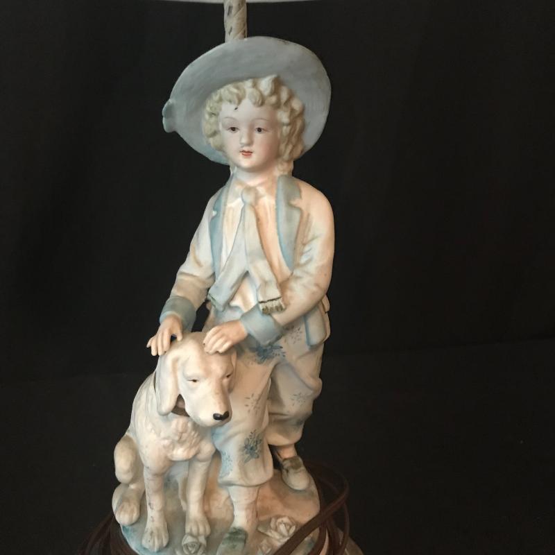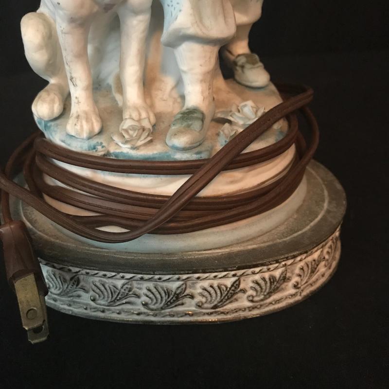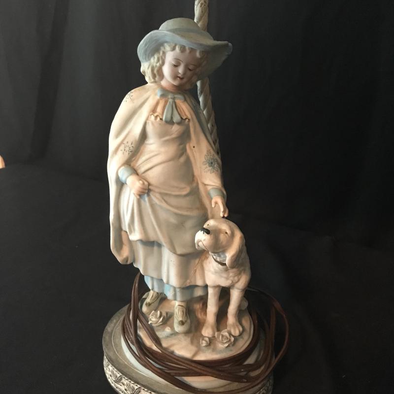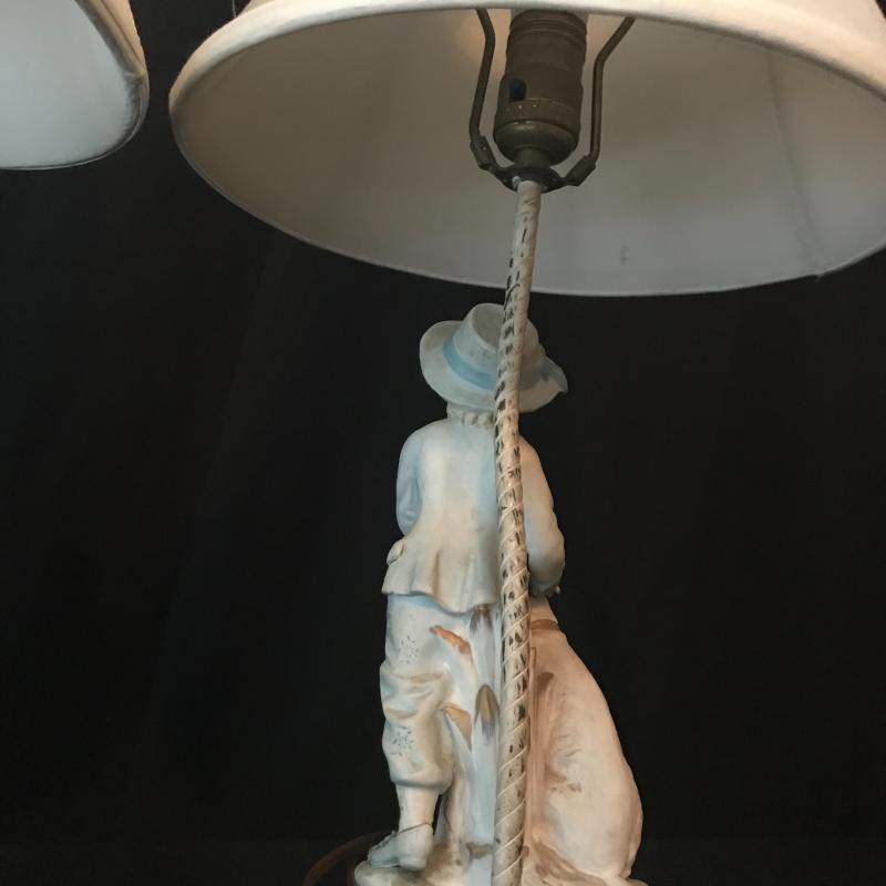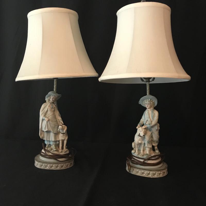 Two coordinating figurine lamps have a young man and lady and their faithful dogs. Ordained with golds and blues creating a delicate feel. Young lady lamp is missing crystal topper. Other lamp is approx 24.5” tall, base measures 6” wide and shade is 12.5” wide. Appears to be in good condition, see photos. Local pick up only.