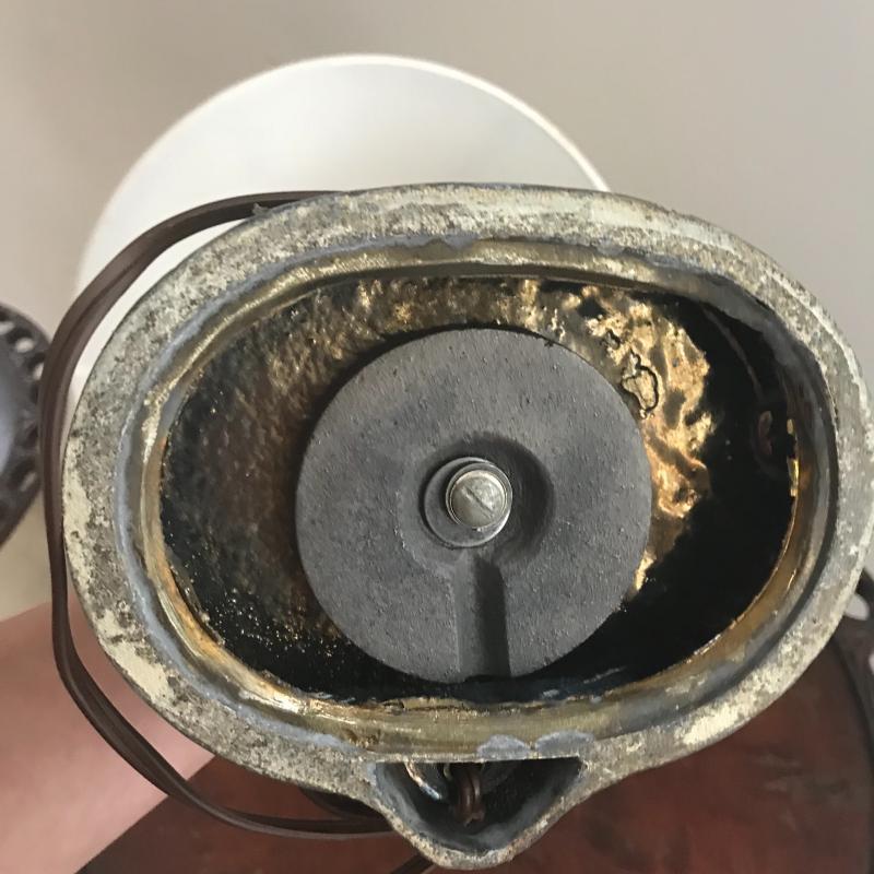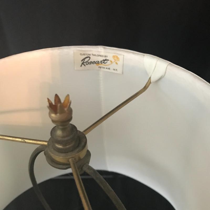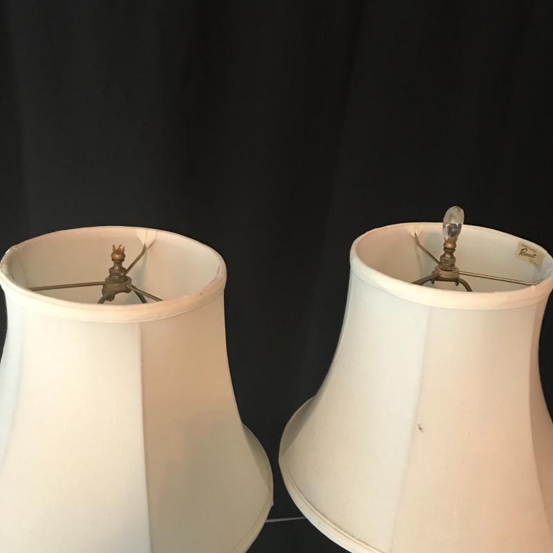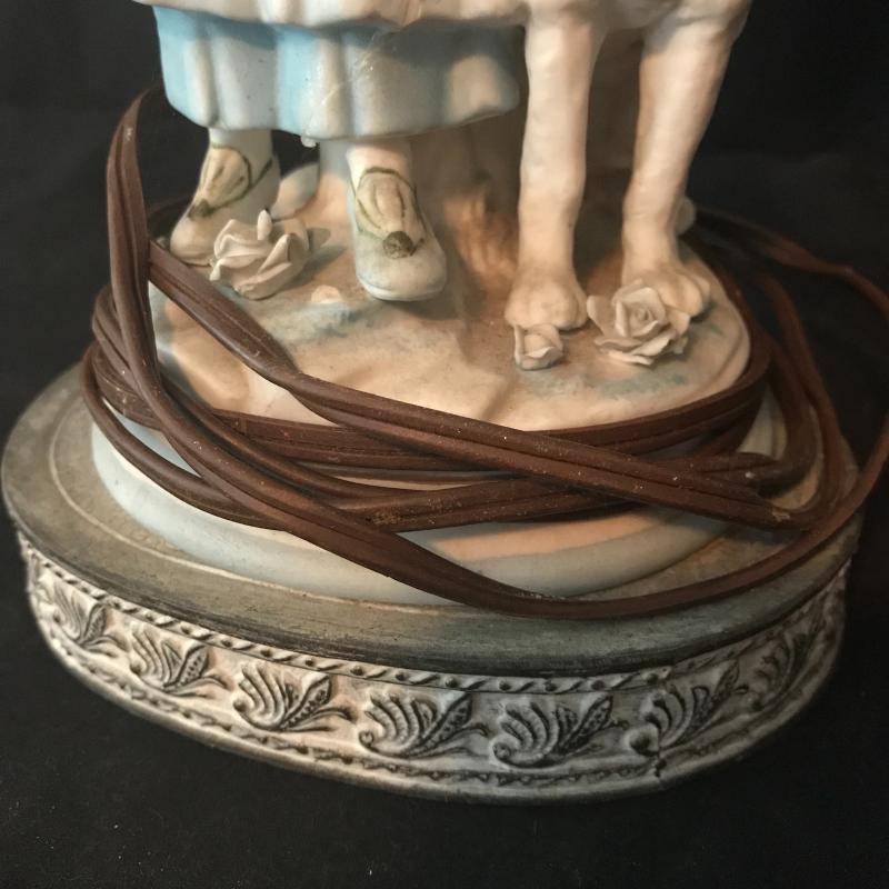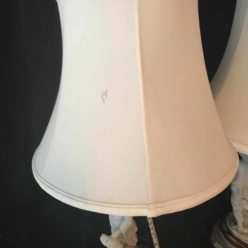 Two coordinating figurine lamps have a young man and lady and their faithful dogs. Ordained with golds and blues creating a delicate feel. Young lady lamp is missing crystal topper. Other lamp is approx 24.5” tall, base measures 6” wide and shade is 12.5” wide. Appears to be in good condition, see photos. Local pick up only.