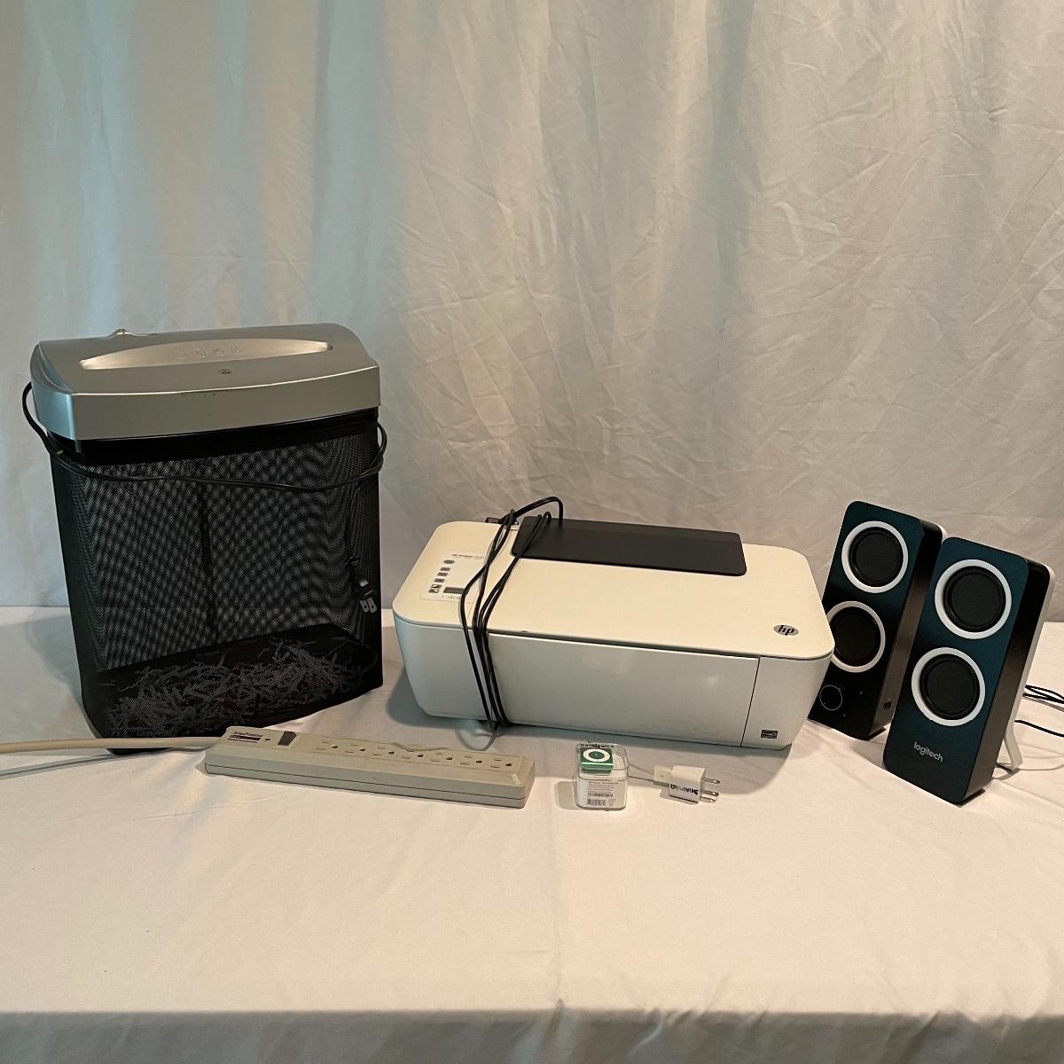 Here’s a great get started in your new home office! Lot features an HP Deskjet 2540, Fellows S701CM shredder both turned on when tested. This lot also wants you have have some good music. An IPod Shuffle and Logitech speaker set; these items were not tested. See images. Local pick up only.