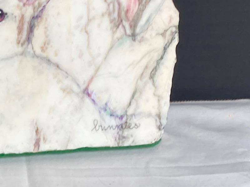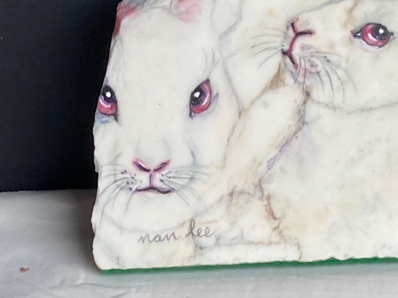 Nan Lee signed painting on stone “Bunnies” measures 9” tall 7-1/2” wide and 1” thick