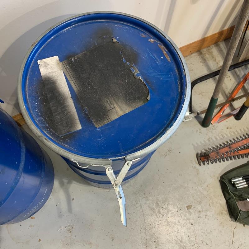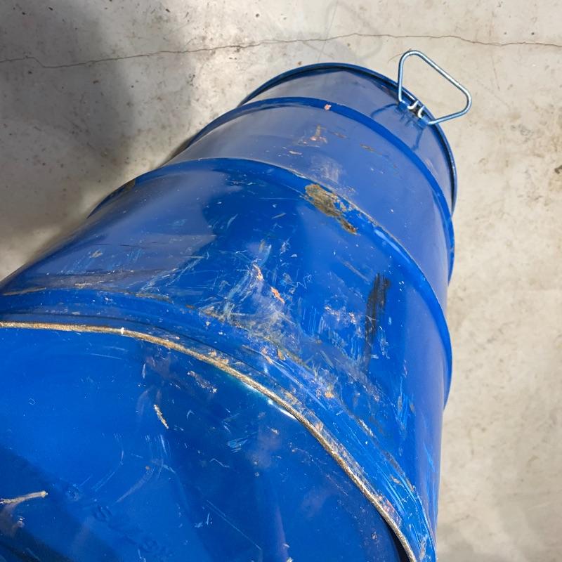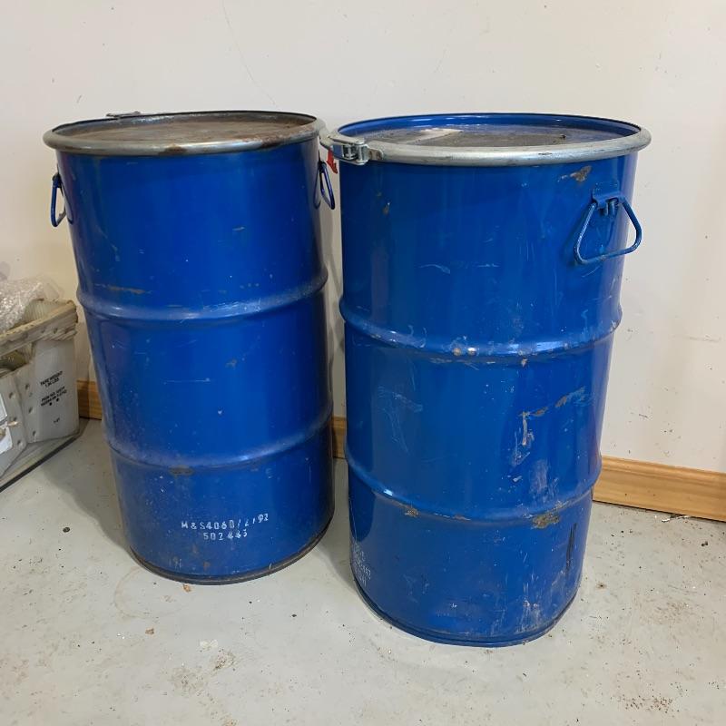 This duo with handles each stand 26” tall and have a 15” diameter. They each appear to be freshly painted inside and out and have a bit of odor of paint on the insides. The latches work great and one has the plug piece. A few dents but overall they are in good condition. These appear to be 16 gallon drums. Local pick up only.
