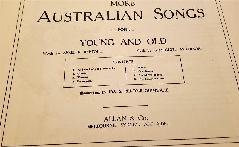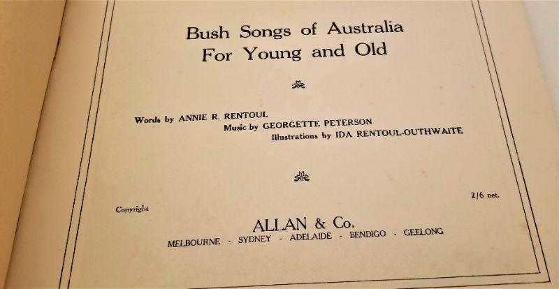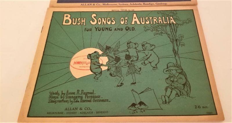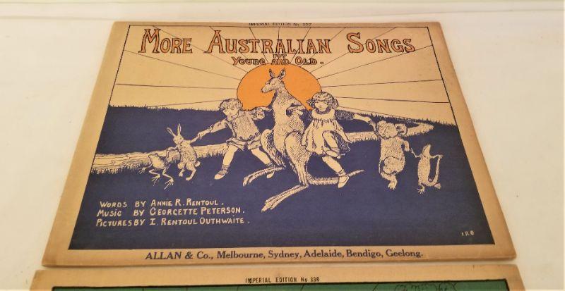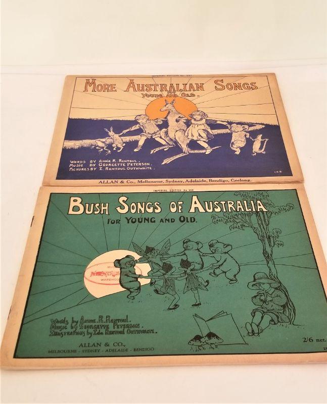 These two scarce children's songbooks are in excellent condition. Bush Songs of Australia, 35 pages and More Australian Songs, 36 pages. Full piano accompaniment. By Annie R. Renboul and Geyette Peterson - Imperial edition #336 and 337. Published in Australia. These are almost impossible to find in any condition.