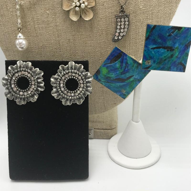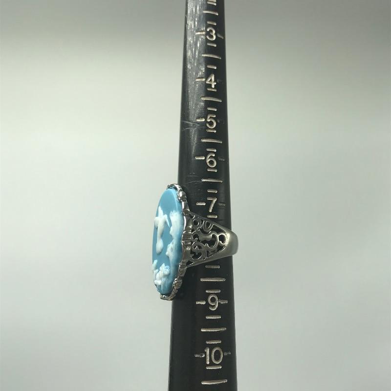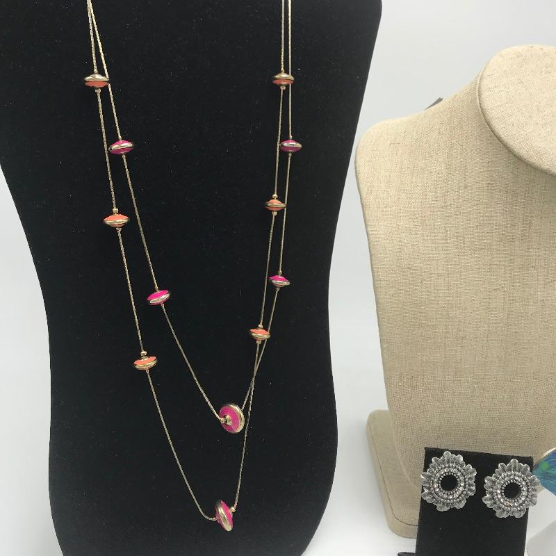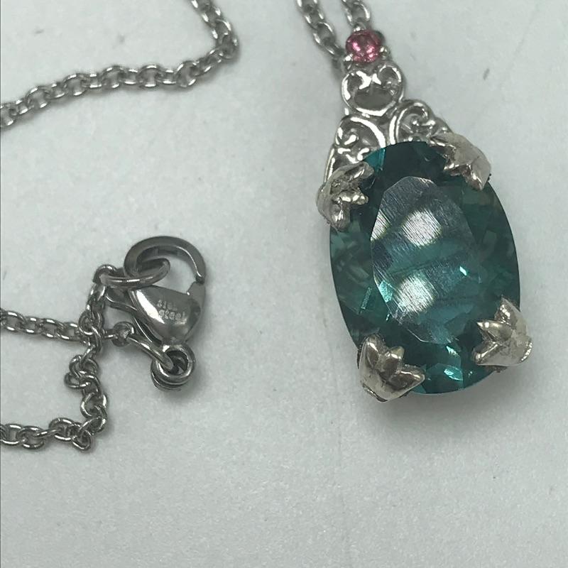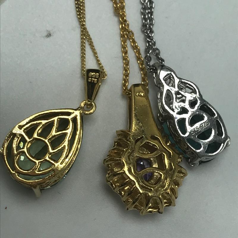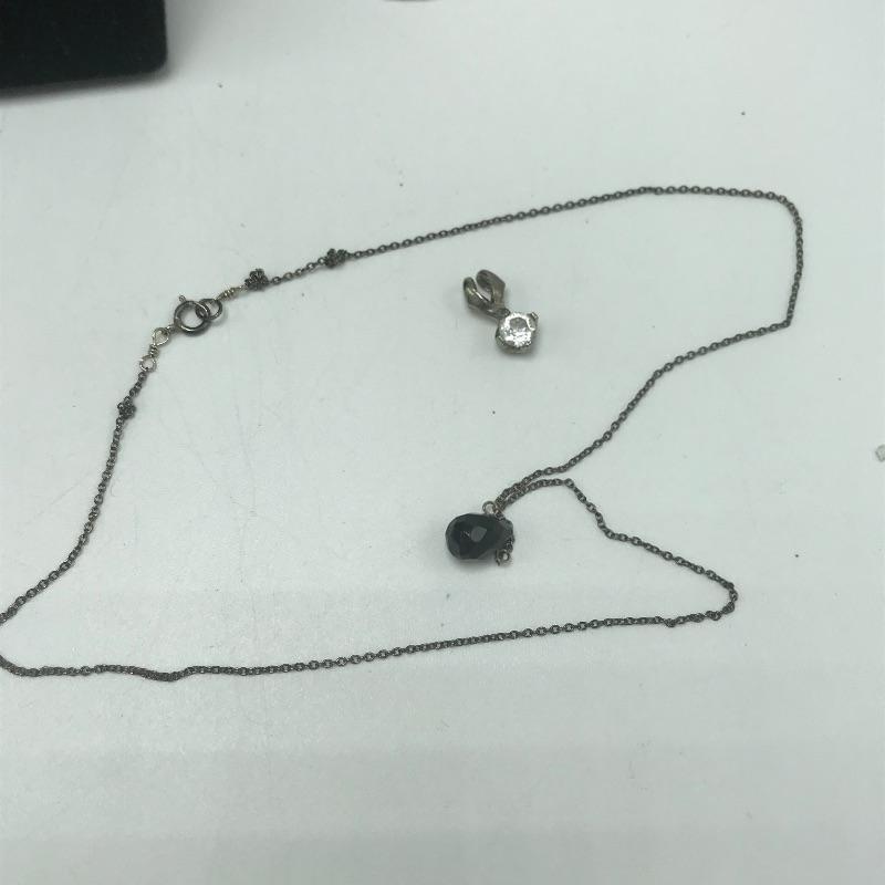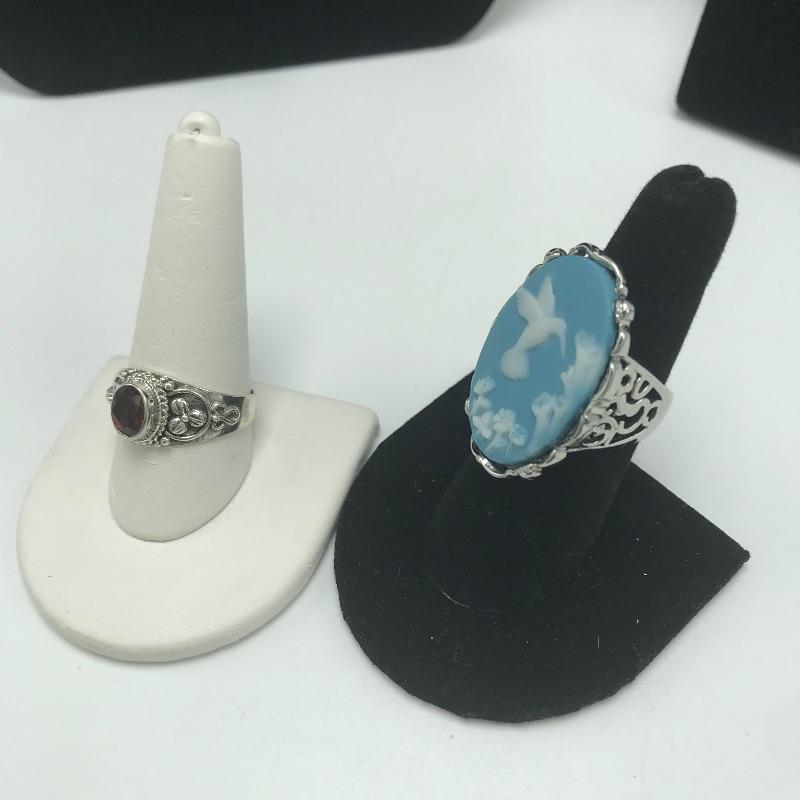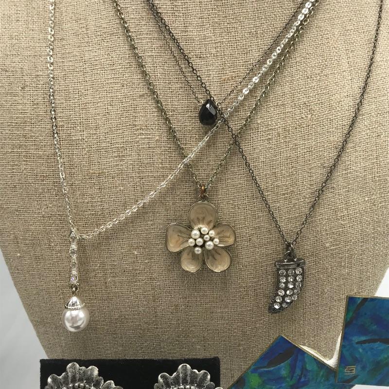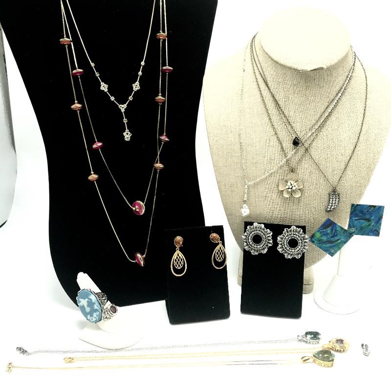 Nice variety of jewelry with one ring, a pair of earrings, three pendants and one chain marked 925. The 925 chain shows toning, see photos. Two other necklaces have markings by Icing, Avon. The blue green earrings are made from a lightweight, non-metal or plastic material. Black pendant necklace has a few knots in the chain. The sweet Wedgwood-like ring has a stainless steel marking.