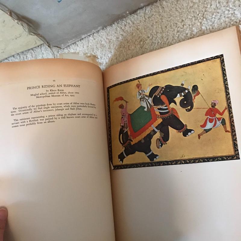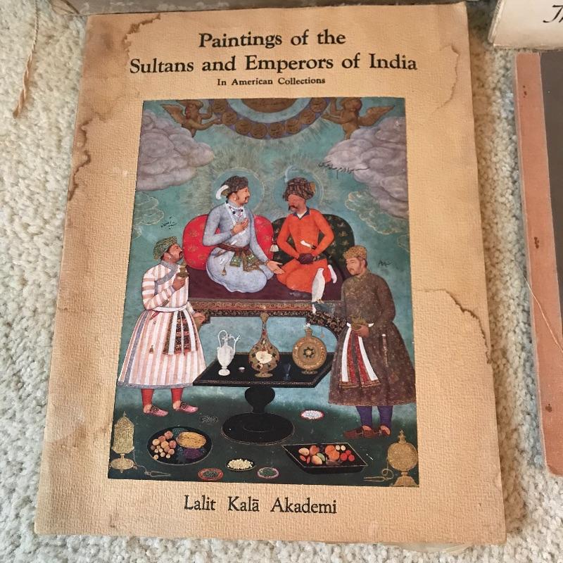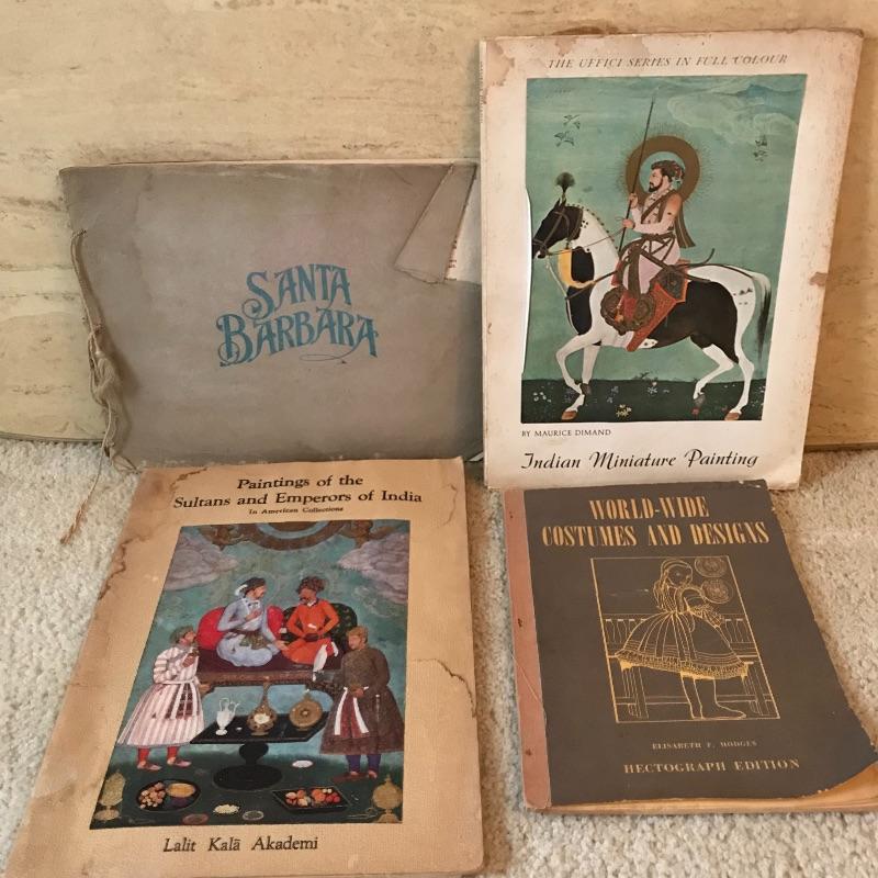 Three amazingly crafted books with bold and beautiful colors! Paintings of the Sultans and Emperors of India, Indian Miniature Painting, and Santa Barbara have beautiful scenes and portraits attached to the pages. Collection also includes a copy of World-Wide Costumes and Designs, 1948, created to teach children customs and cultures around the globe. All books show wear, but most pages inside are in great condition. See photos. Shipping available.