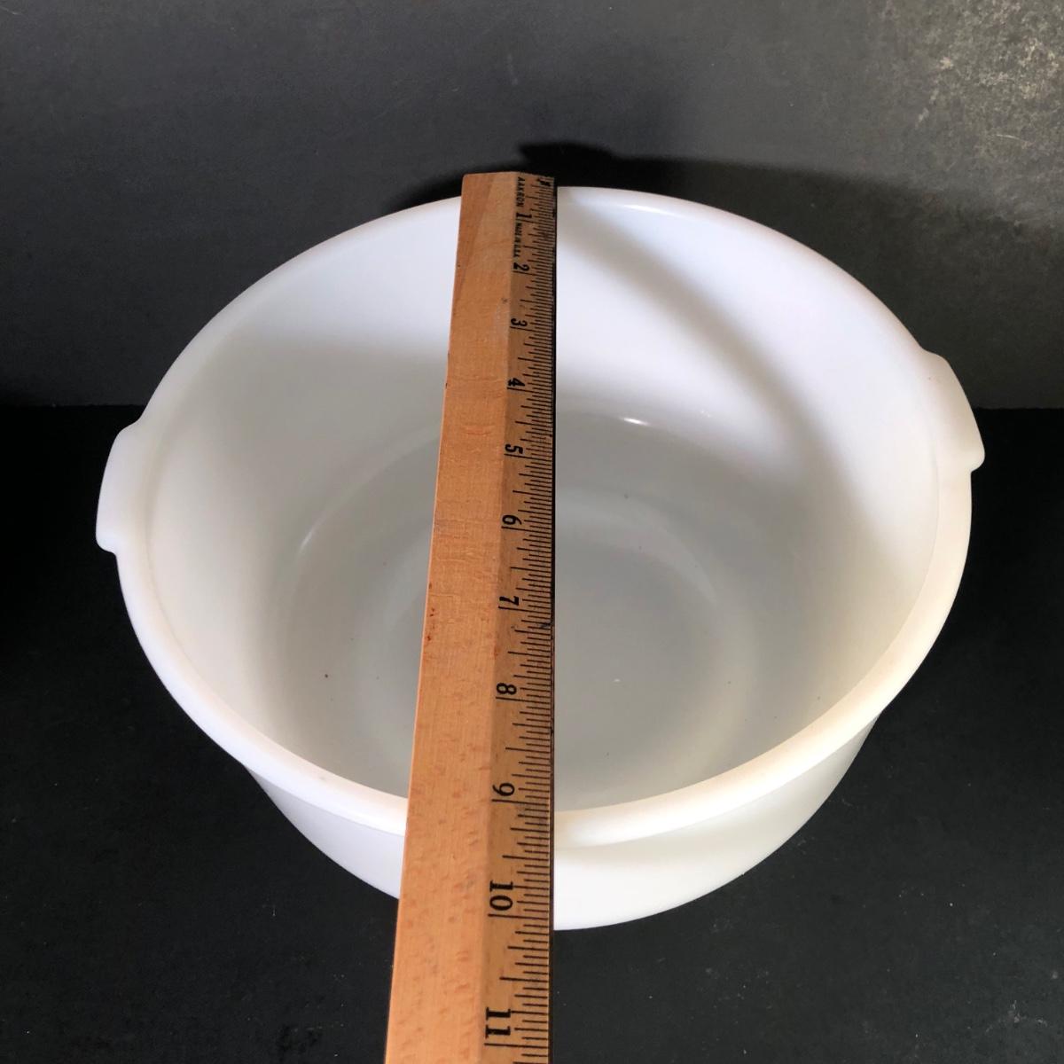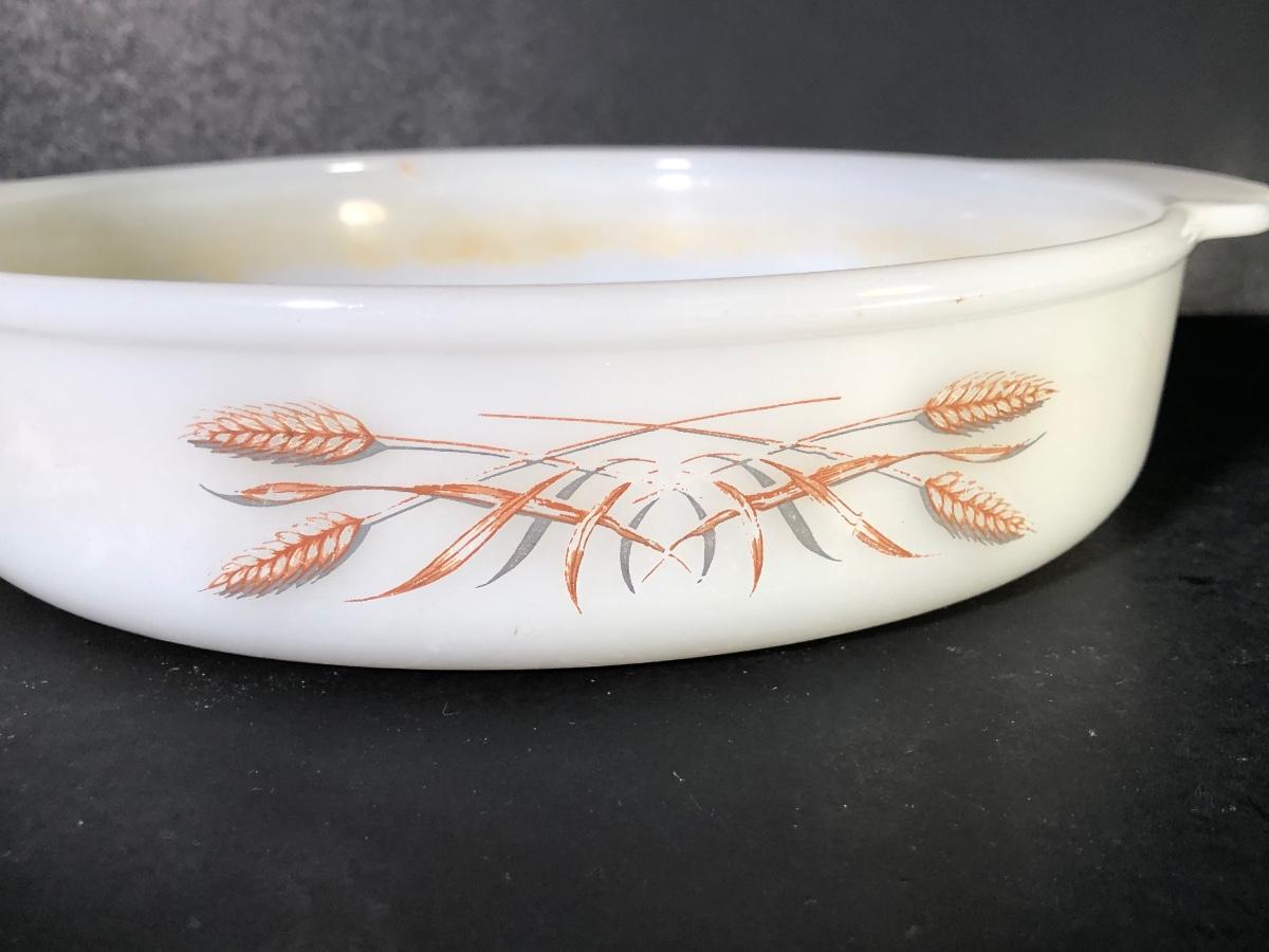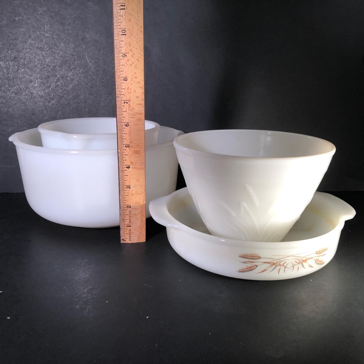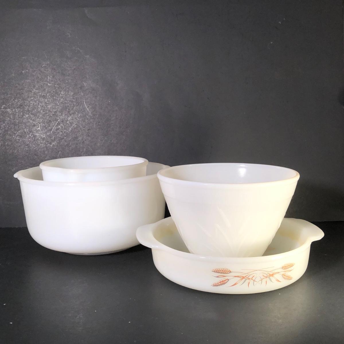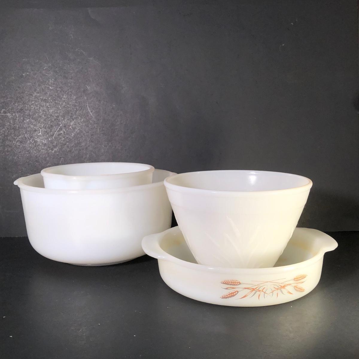 LOT 259F: Vintage Milk Glass - Glasbake for Sunbeam Mixing Bowls, Anchor Hocking Fireking Wheat Circular Baking Dish & More
