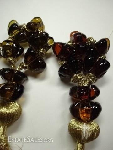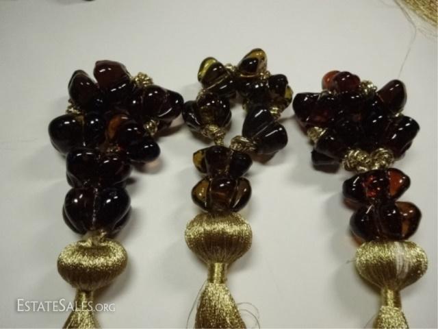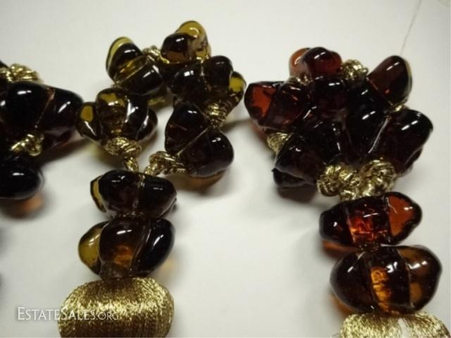 LOT 25D: 14 PC NAPKIN RINGS, AMBER BEADS WITH GOLD TASSELS