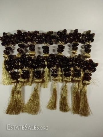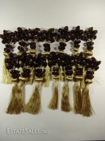 LOT 25D: 14 PC NAPKIN RINGS, ACRYLIC AMBER BEADS WITH GOLD TASSELS, APPROX 9"