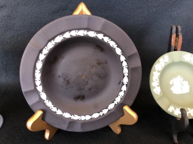 Lot 25P. Wedgwood Jasperware porcelain: 1 blue vase, 1 celadon ashtray, 1 black ashtray “” $12
