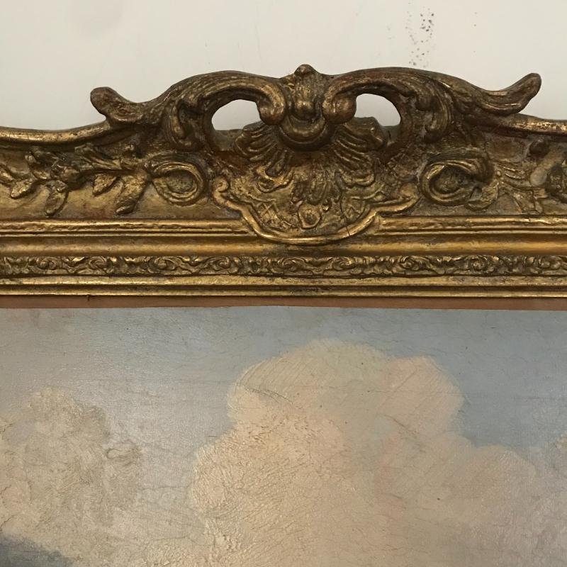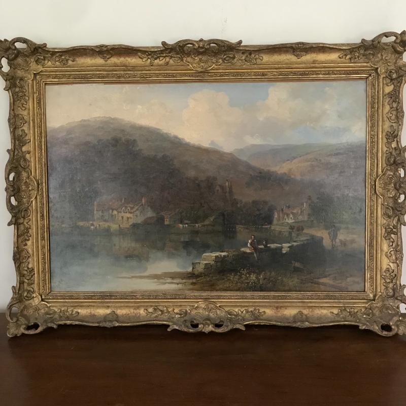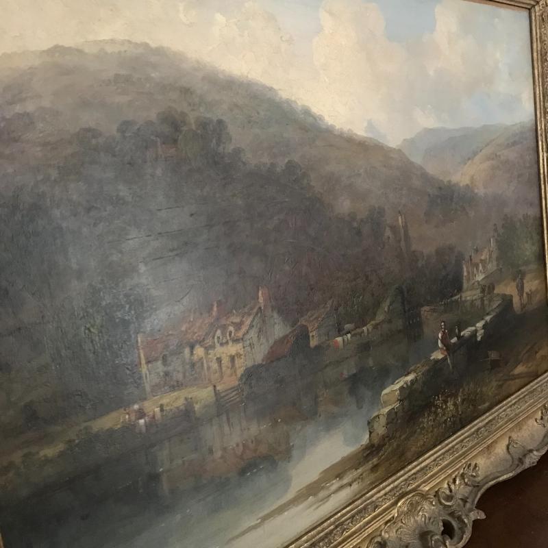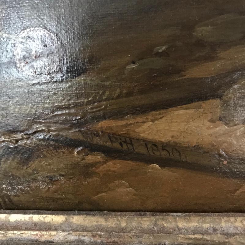 Stunning painting on linen canvas of a small village on the water. Gold painted wood frame measures approx 36”x26” and is in great condition. Signature appears to be W. Pitt 1850. Shipping available, please call UPS Store for a quote prior to bidding, as shipping art can be costly.