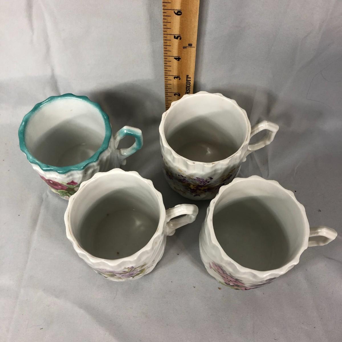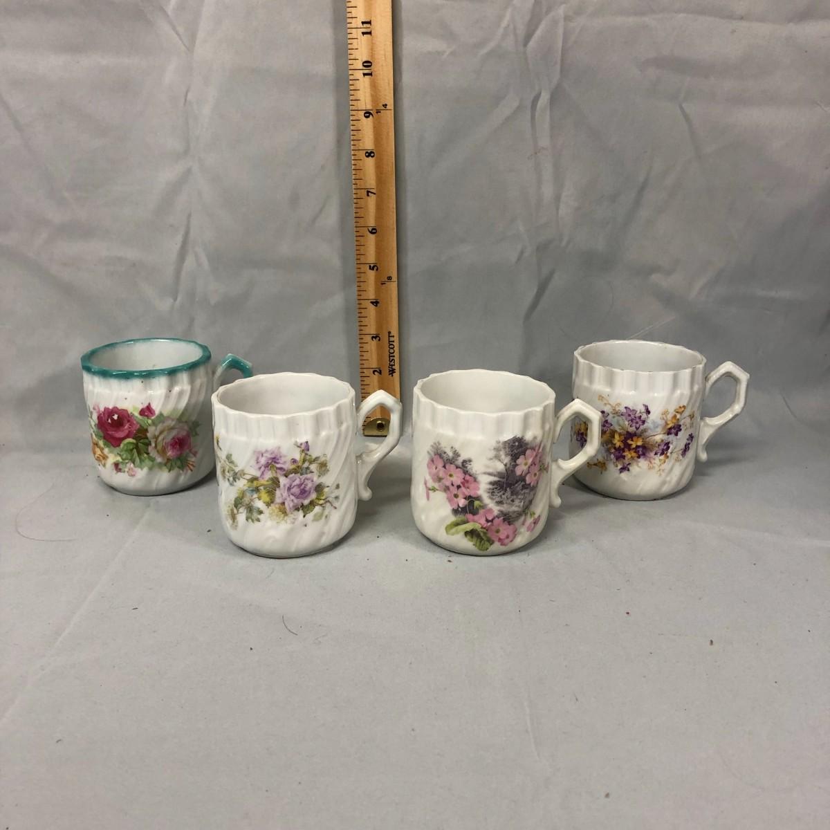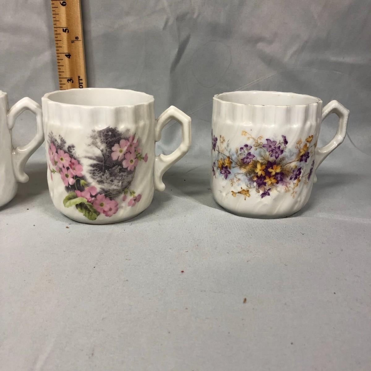 These match Lot 24 in the style of the mug, but the floral pattern is different and they aren't mustache mugs. They are in very good condition and stand about 3.5" tall.