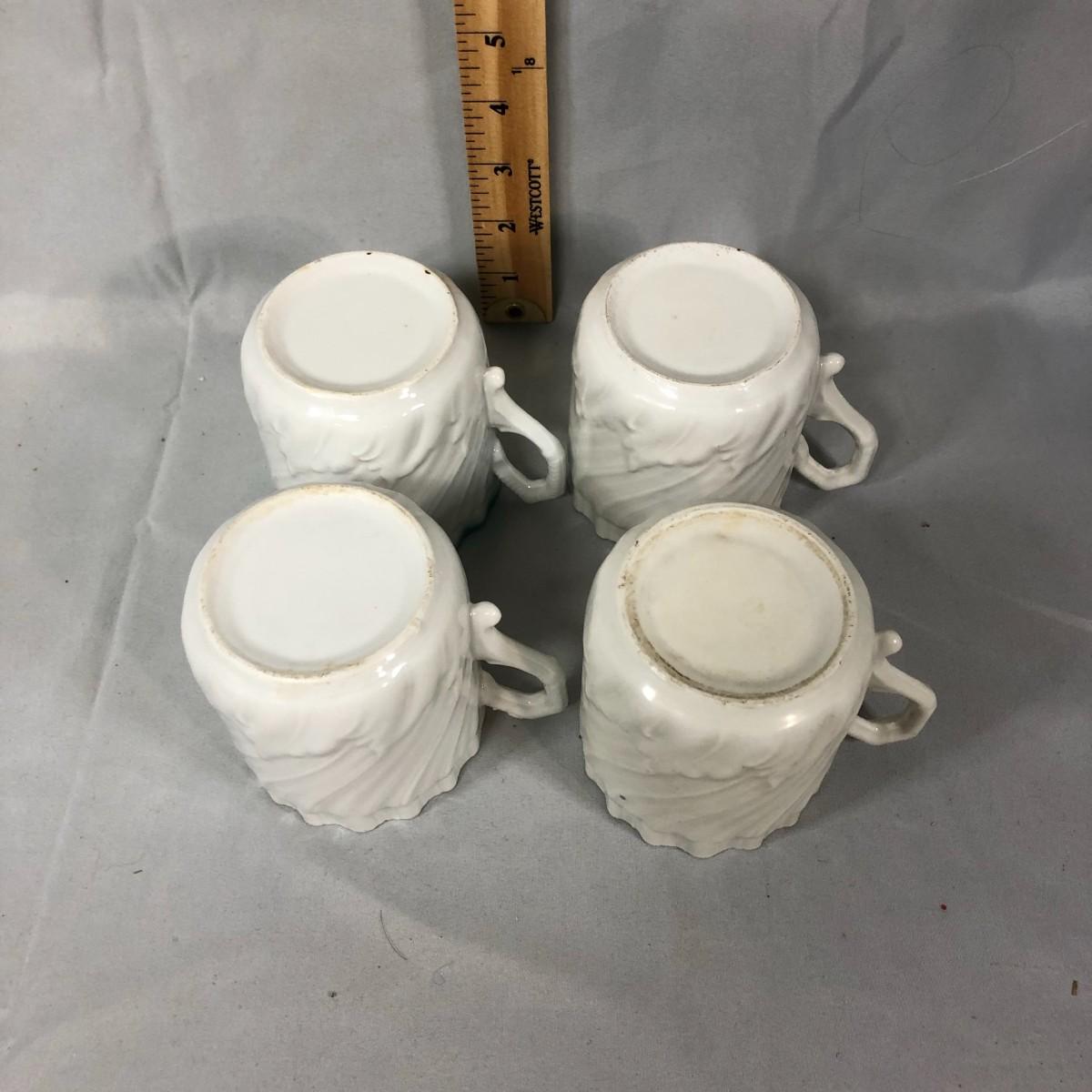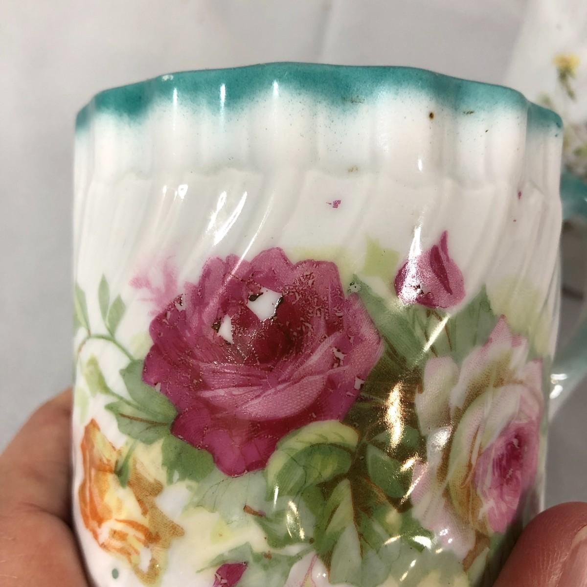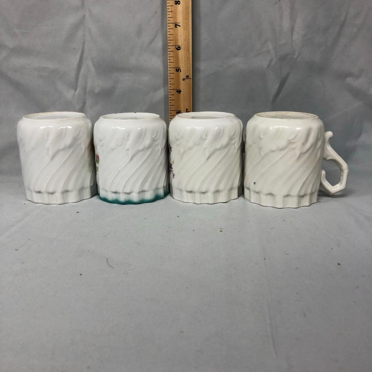 These match Lot 24 in the style of the mug, but the floral pattern is different and they aren't mustache mugs. They are in very good condition and stand about 3.5" tall.