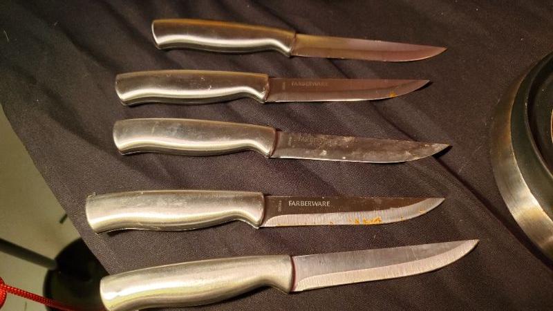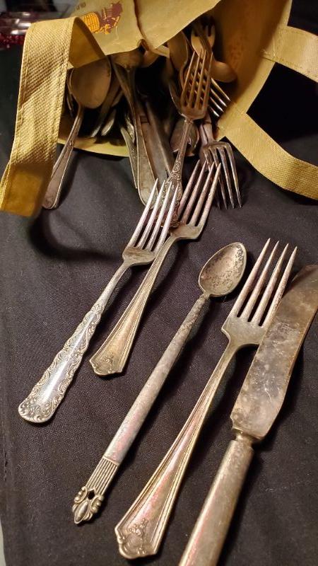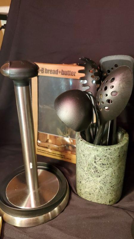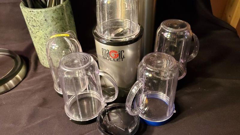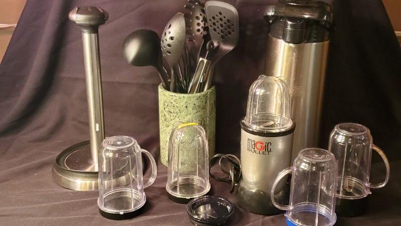 Paper towel holder, cooking utensils, thermos, Farberware steak knives, vintage flatware, and a Magic Bullet with accessories. Untested.