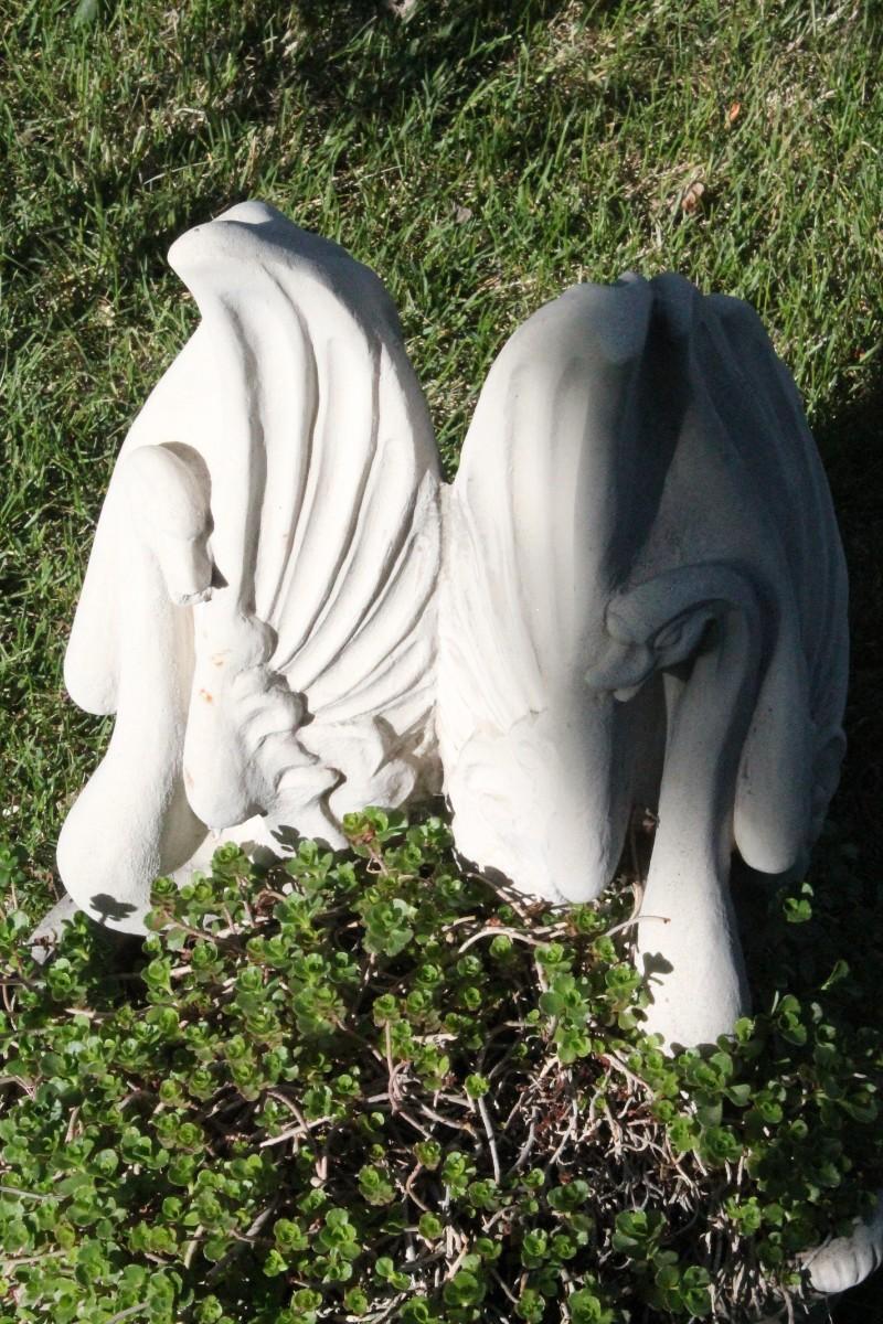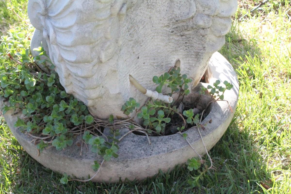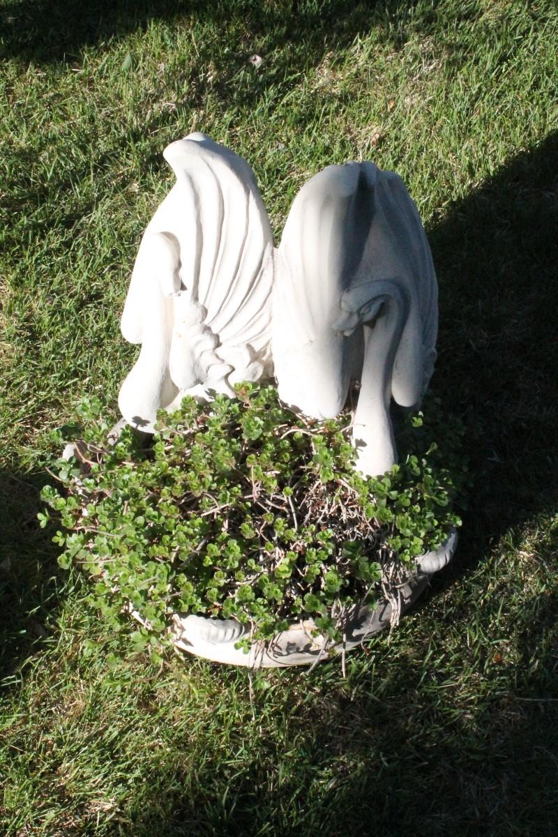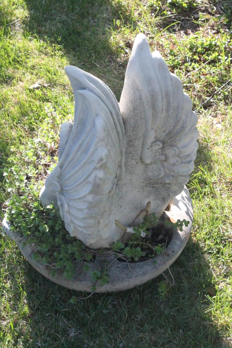 This repurposed vintage weather fountain with Angel Wings is currently filled with a nice plant for your garden.