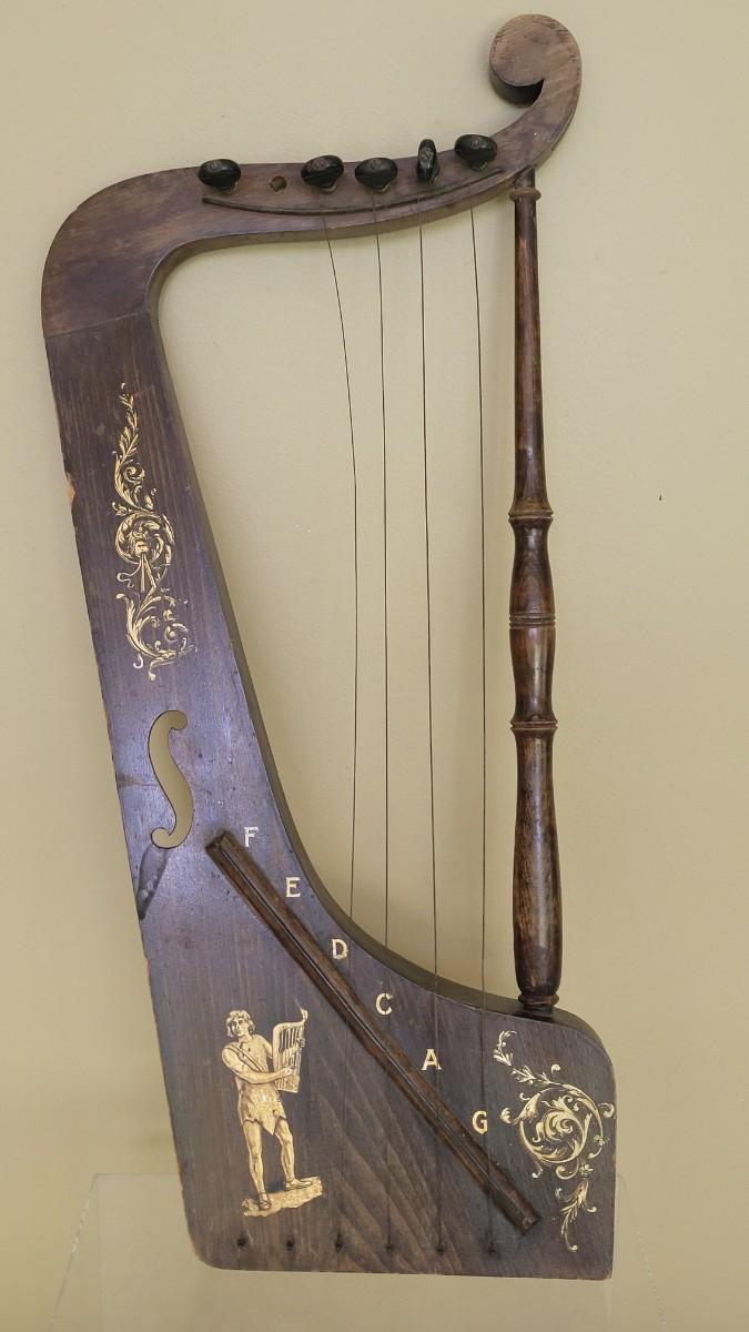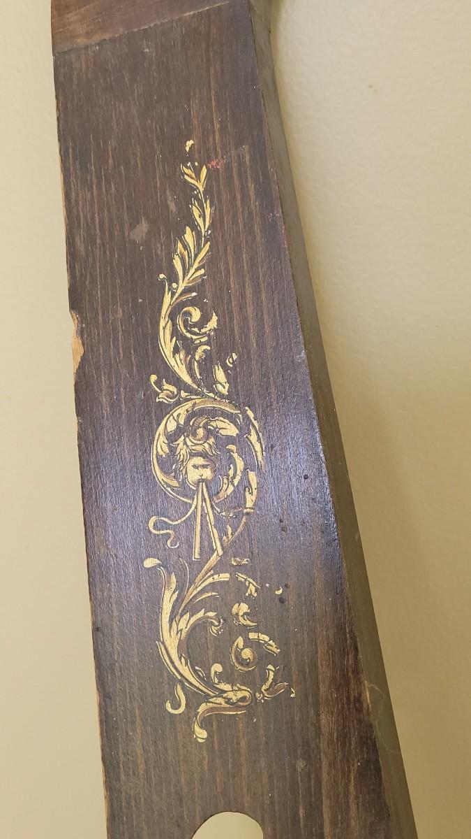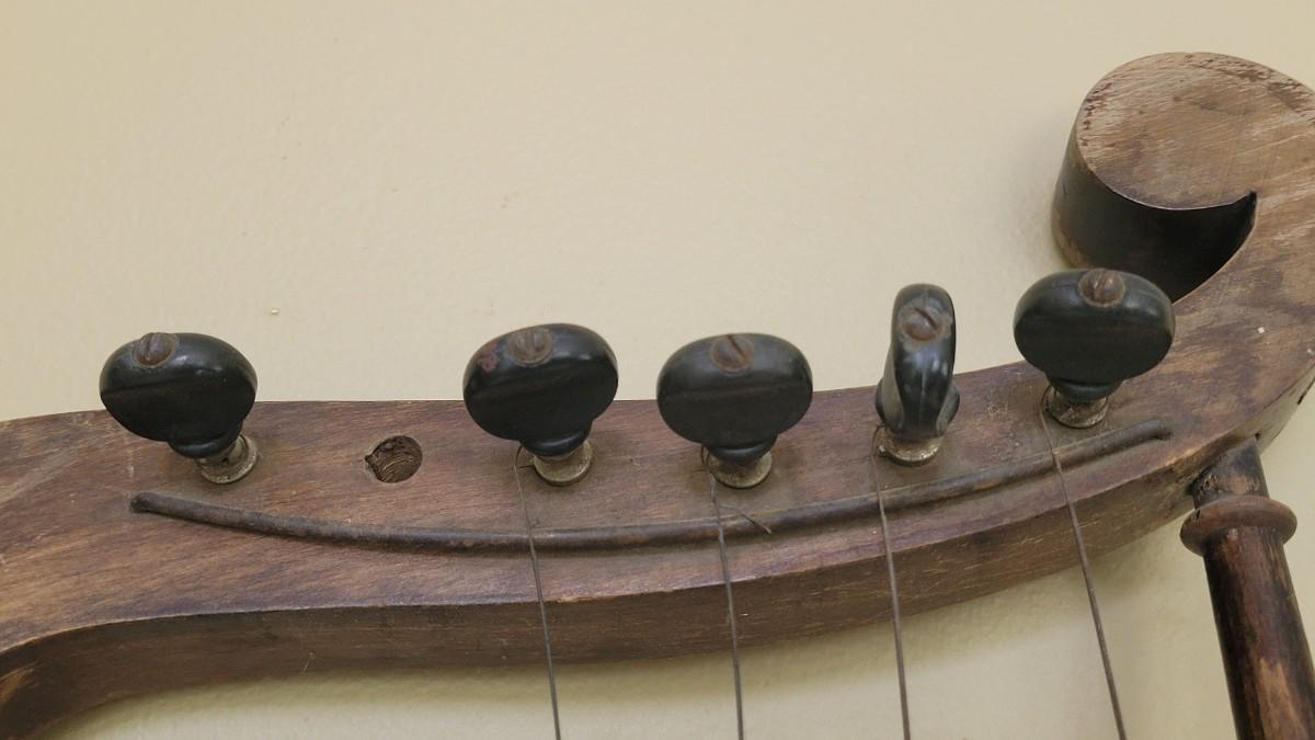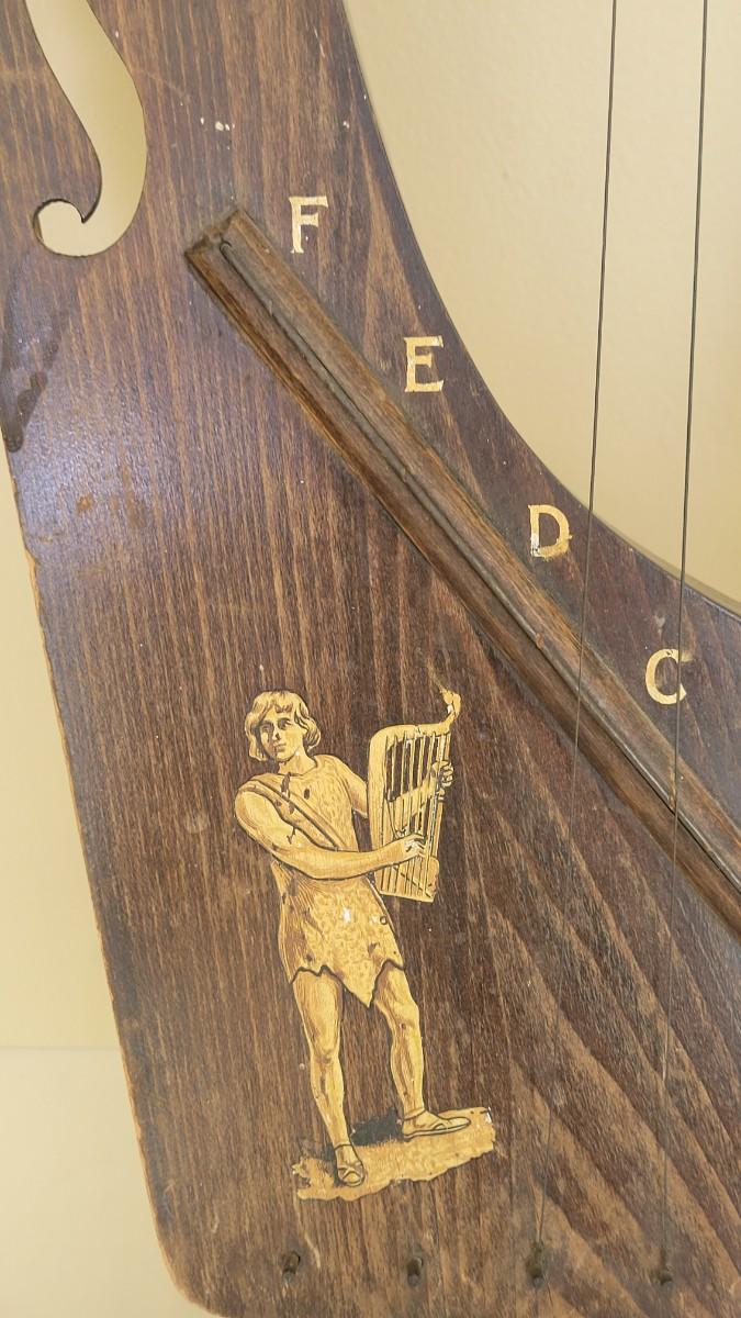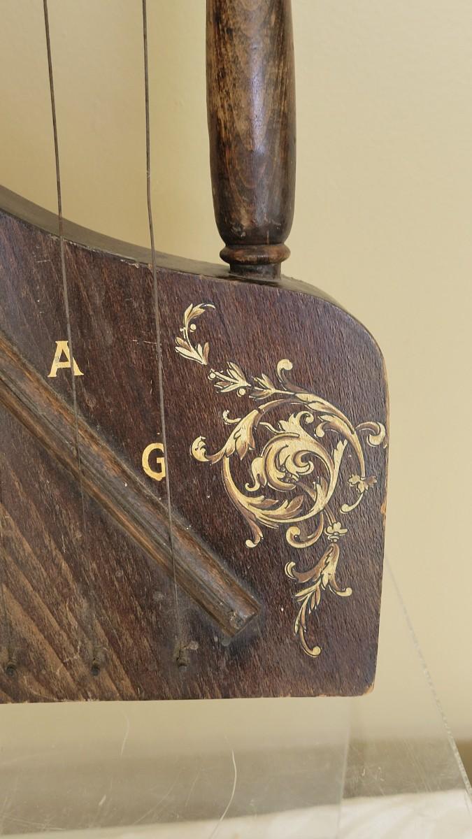 Gold leaf design. Missing 2 stings and one tuning pegs.